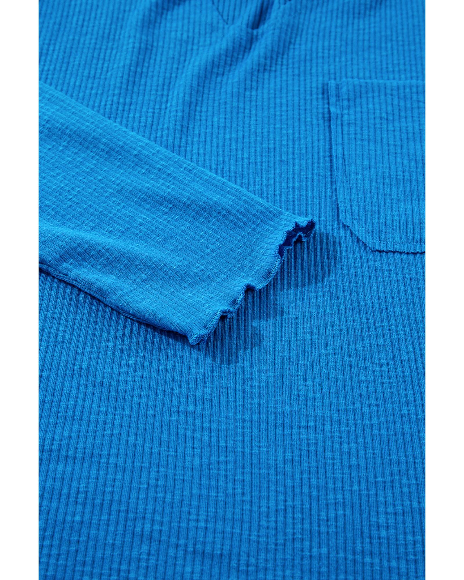 Blue Ribbed Exposed Seam Knit V Neck Long Sleeve Top – XL