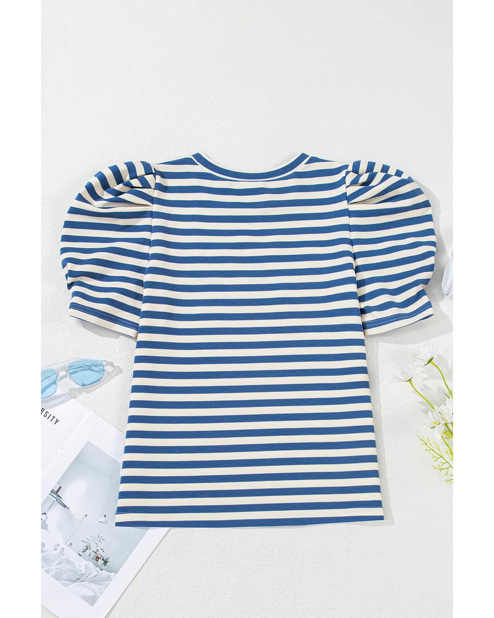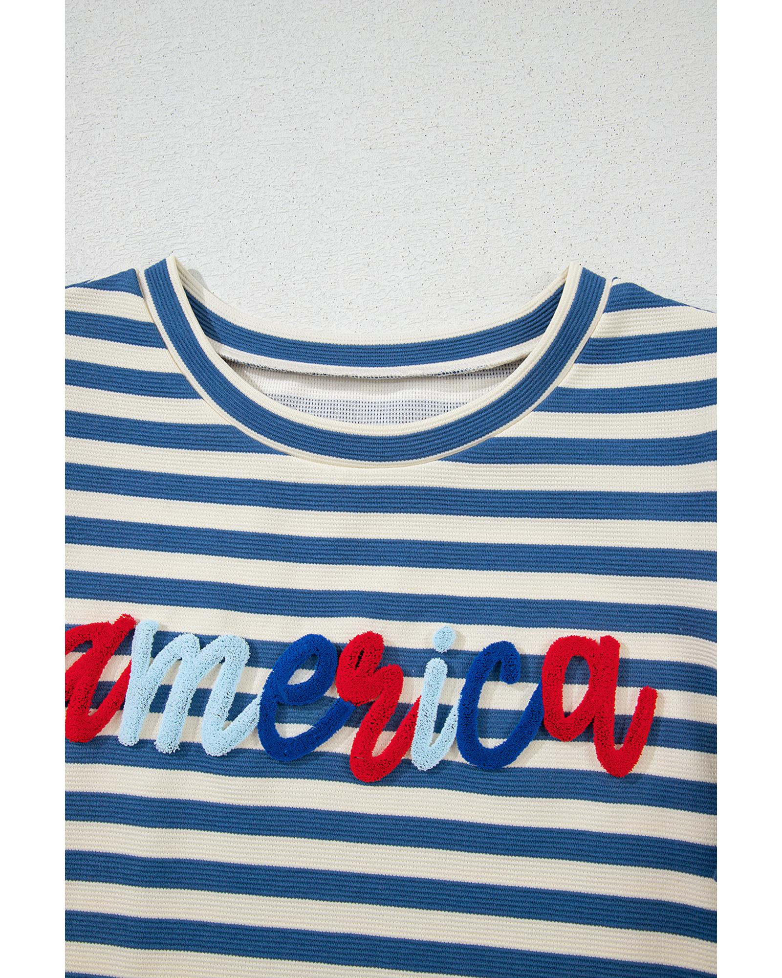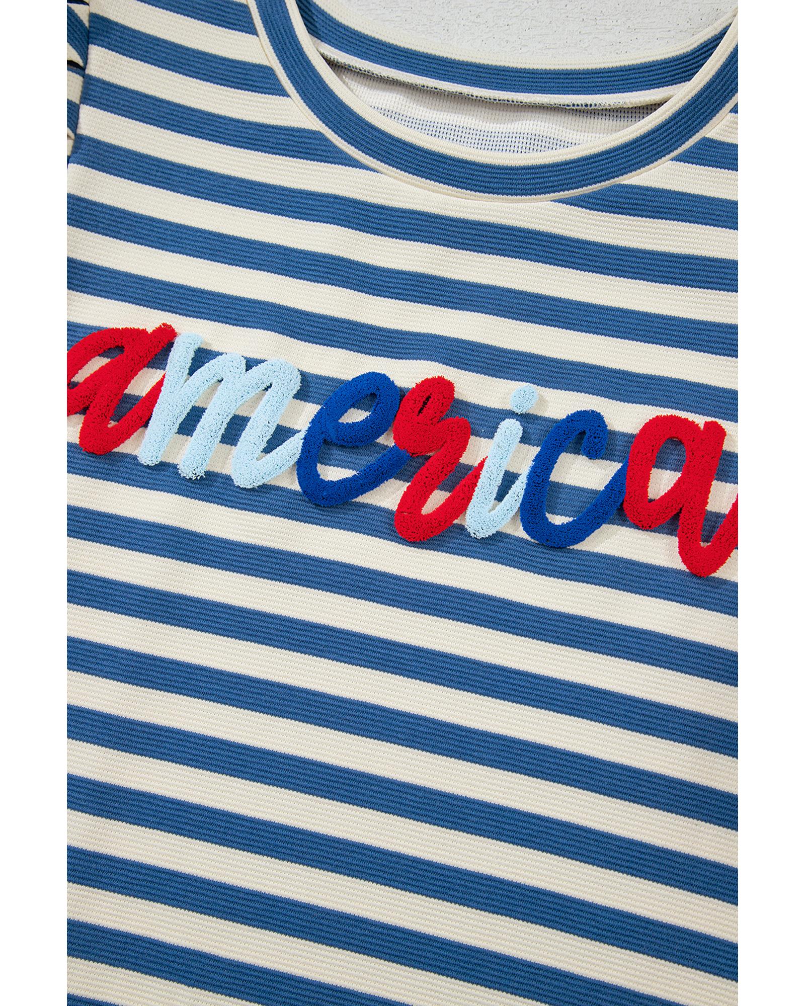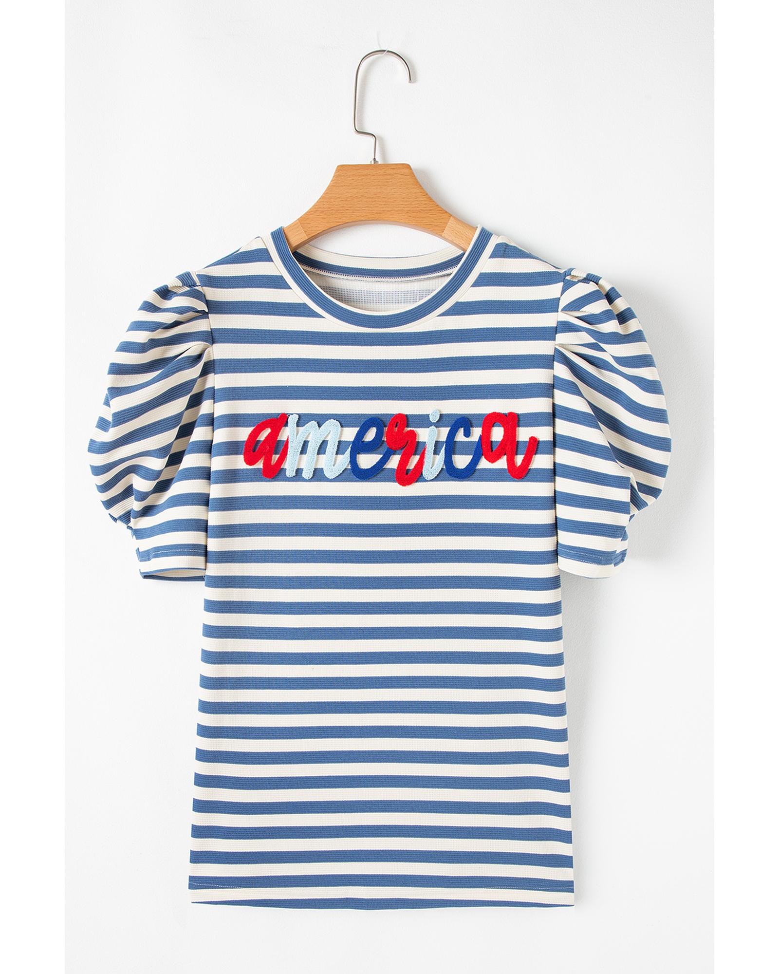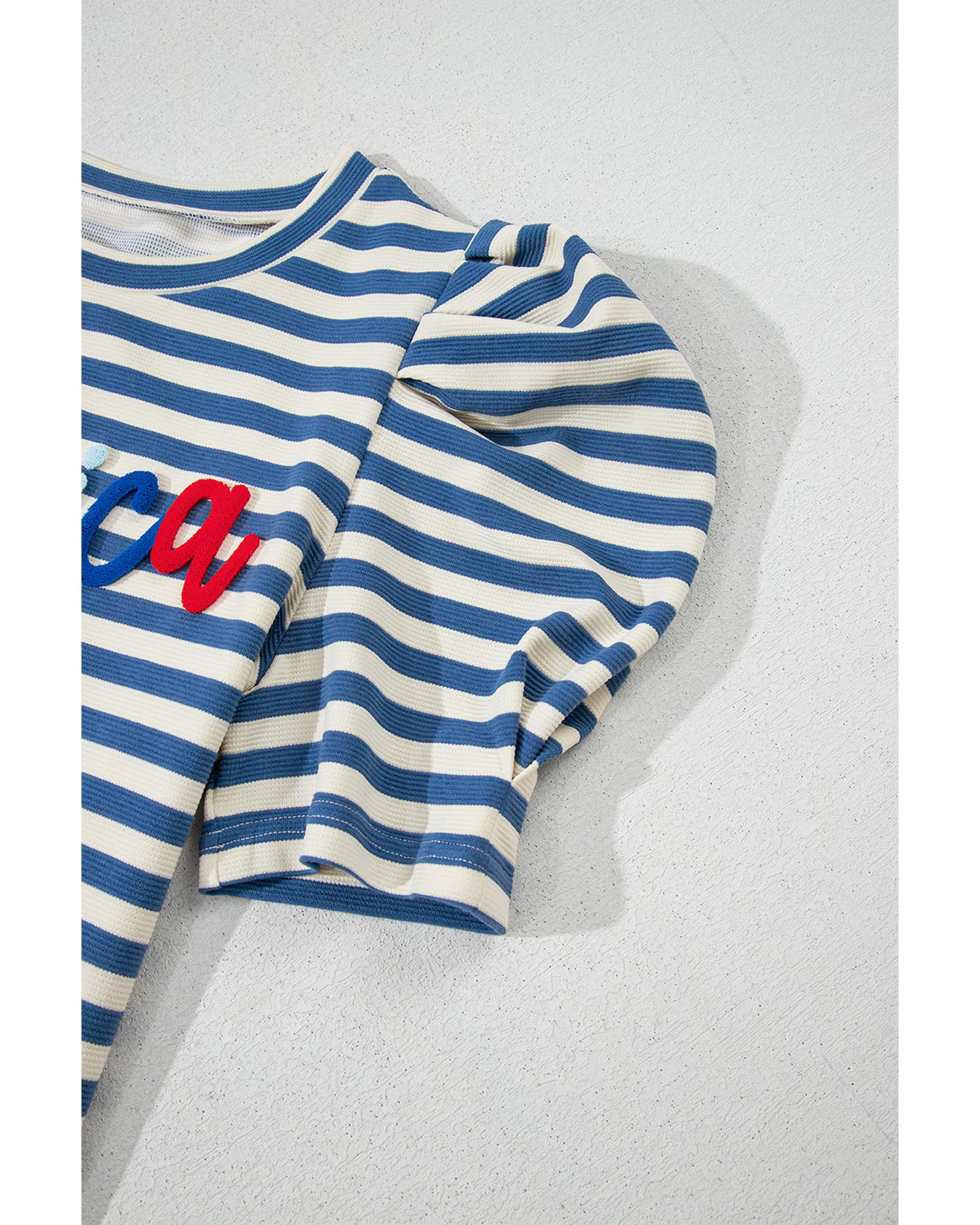 Blue Stripe America Cursive Graphic Puff Sleeve T-shirt – XL