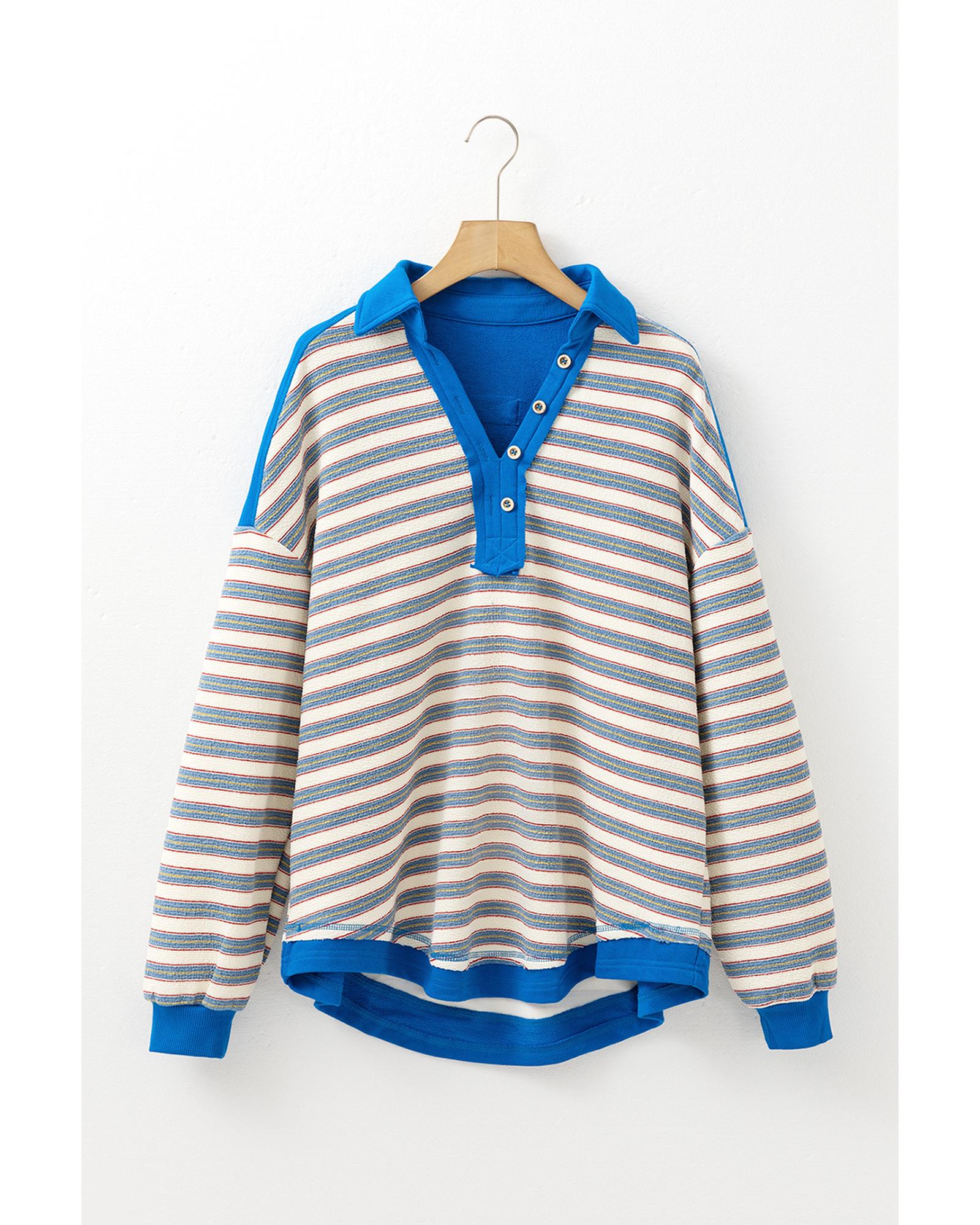 Blue Stripe Buttoned V Neck Collared Drop Shoulder Top – 2XL