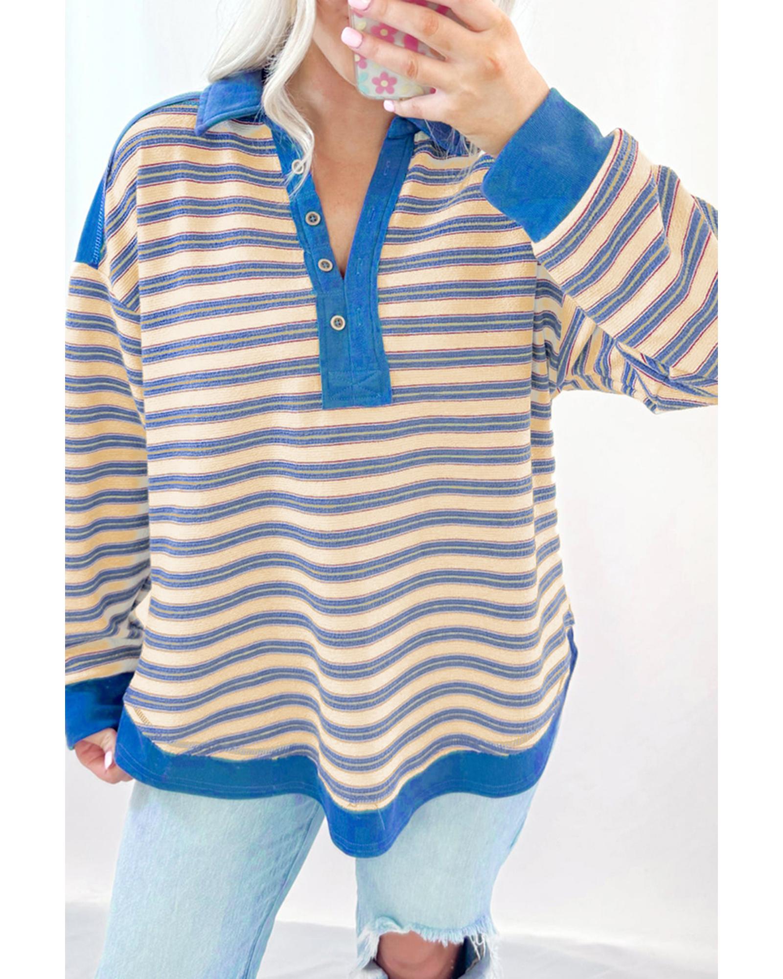 Blue Stripe Buttoned V Neck Collared Drop Shoulder Top – L