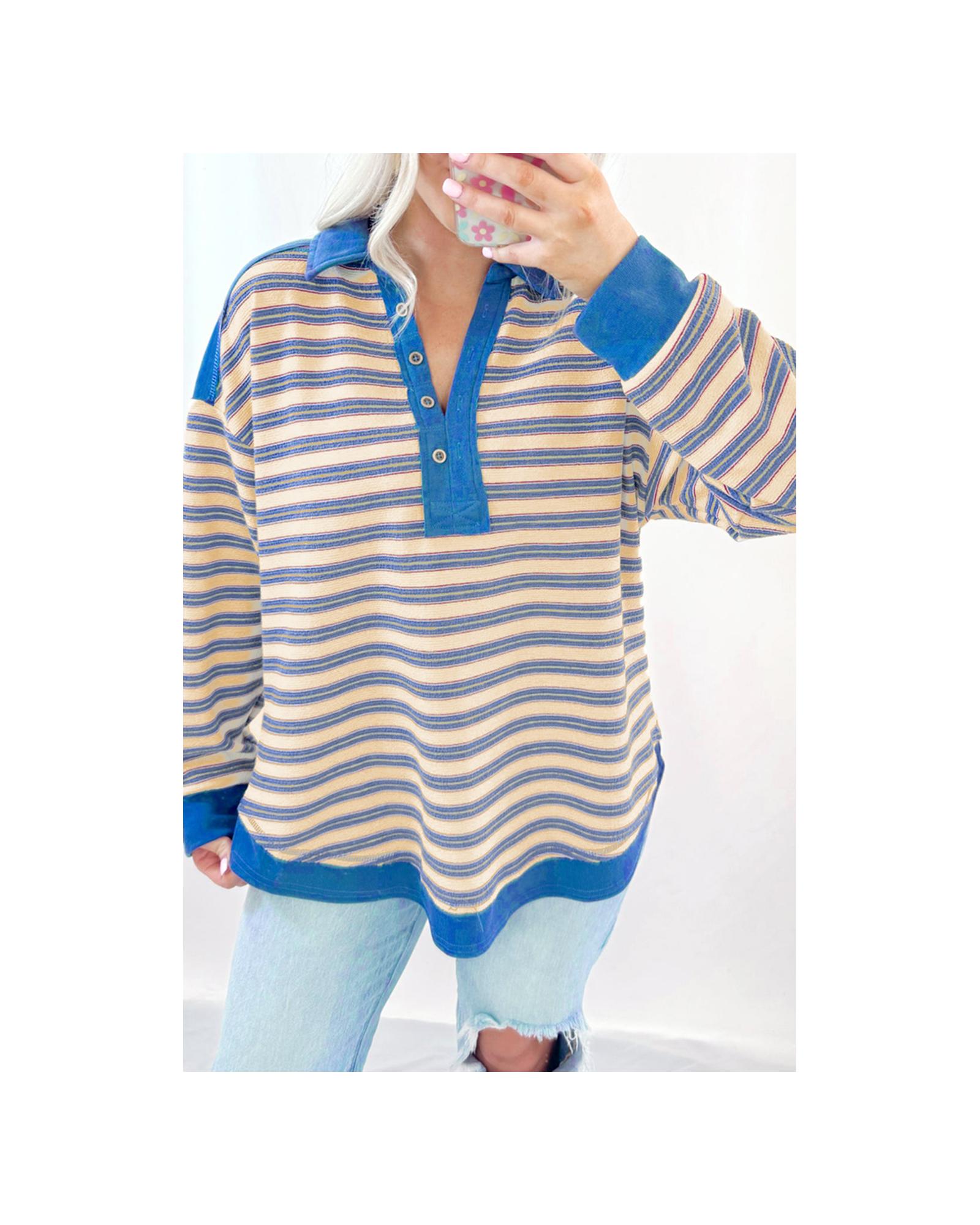 Blue Stripe Buttoned V Neck Collared Drop Shoulder Top – M