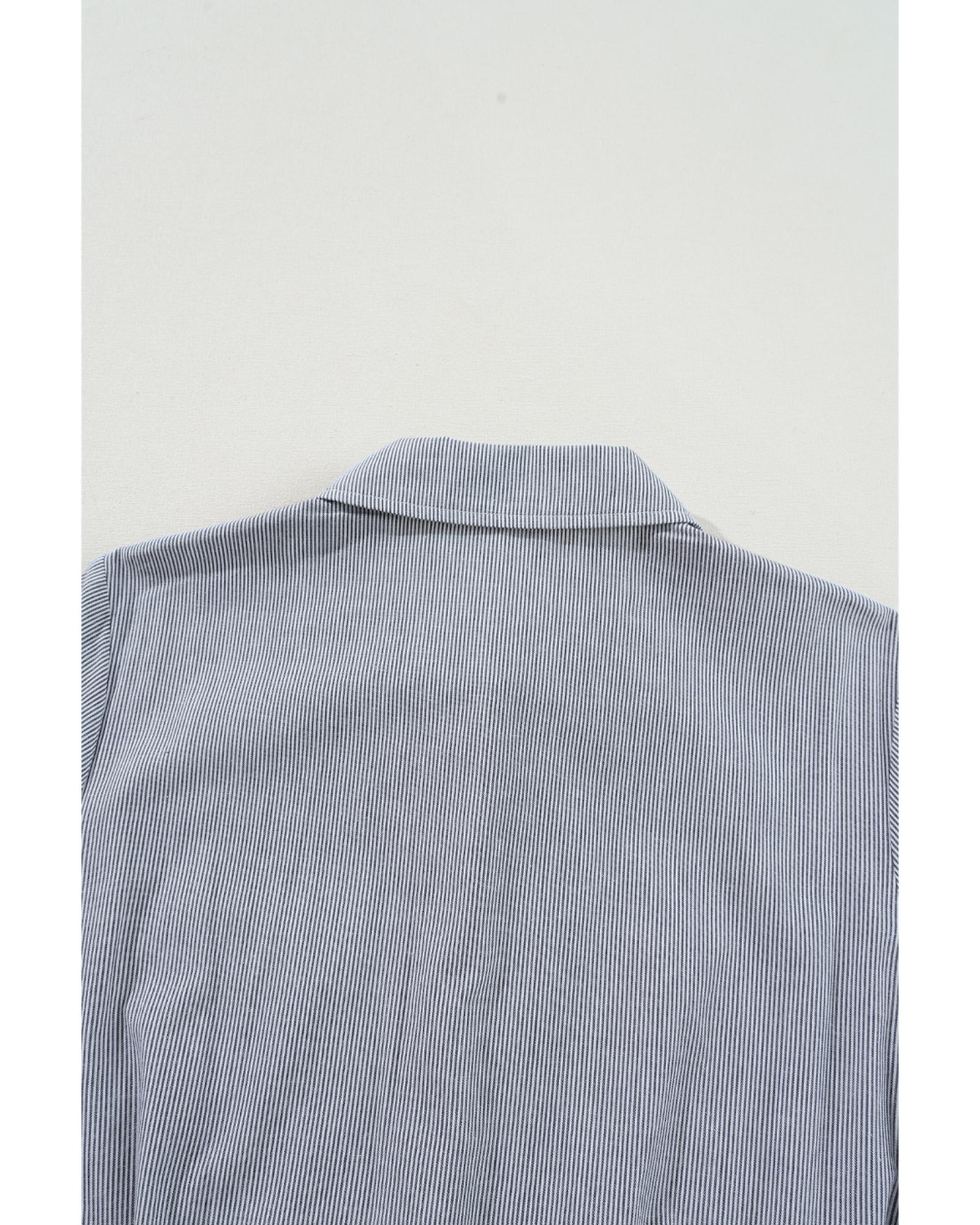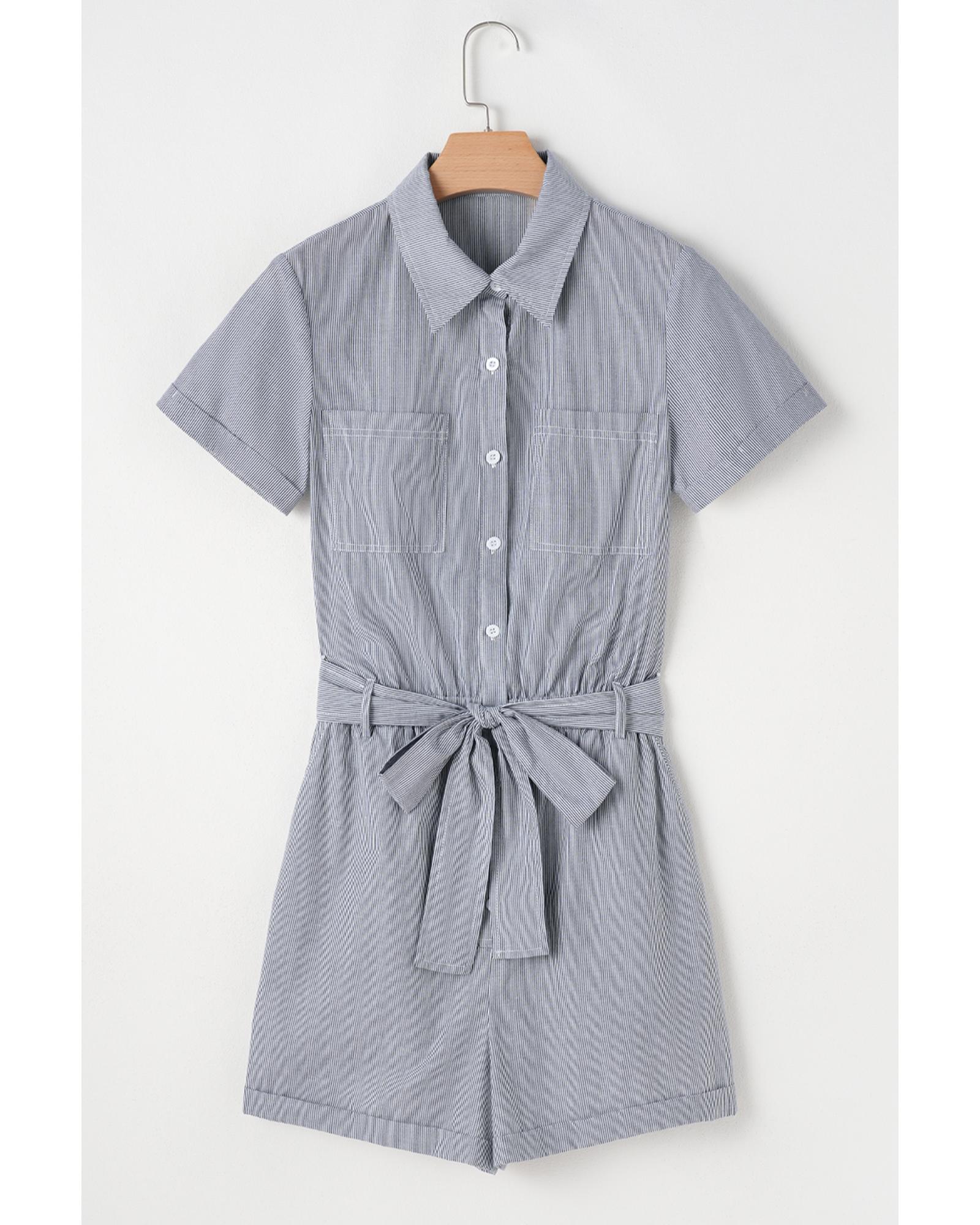 Blue Stripe Chest Pockets Buttoned Belted High Waist Romper – L