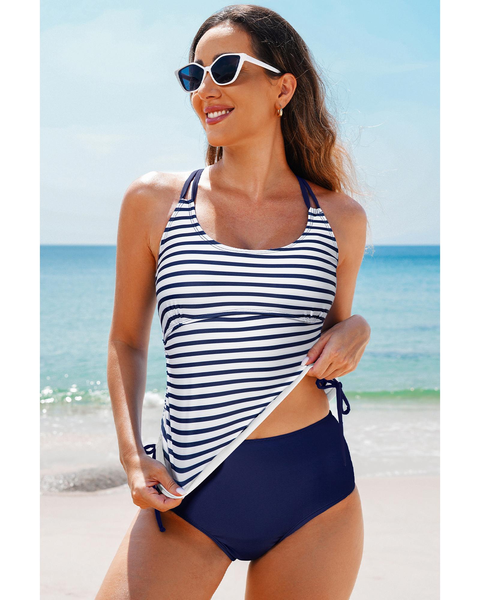 Blue Stripe Drawstring Tummy Control Mix-and-match 2pcs Tankini Swimsuit – L