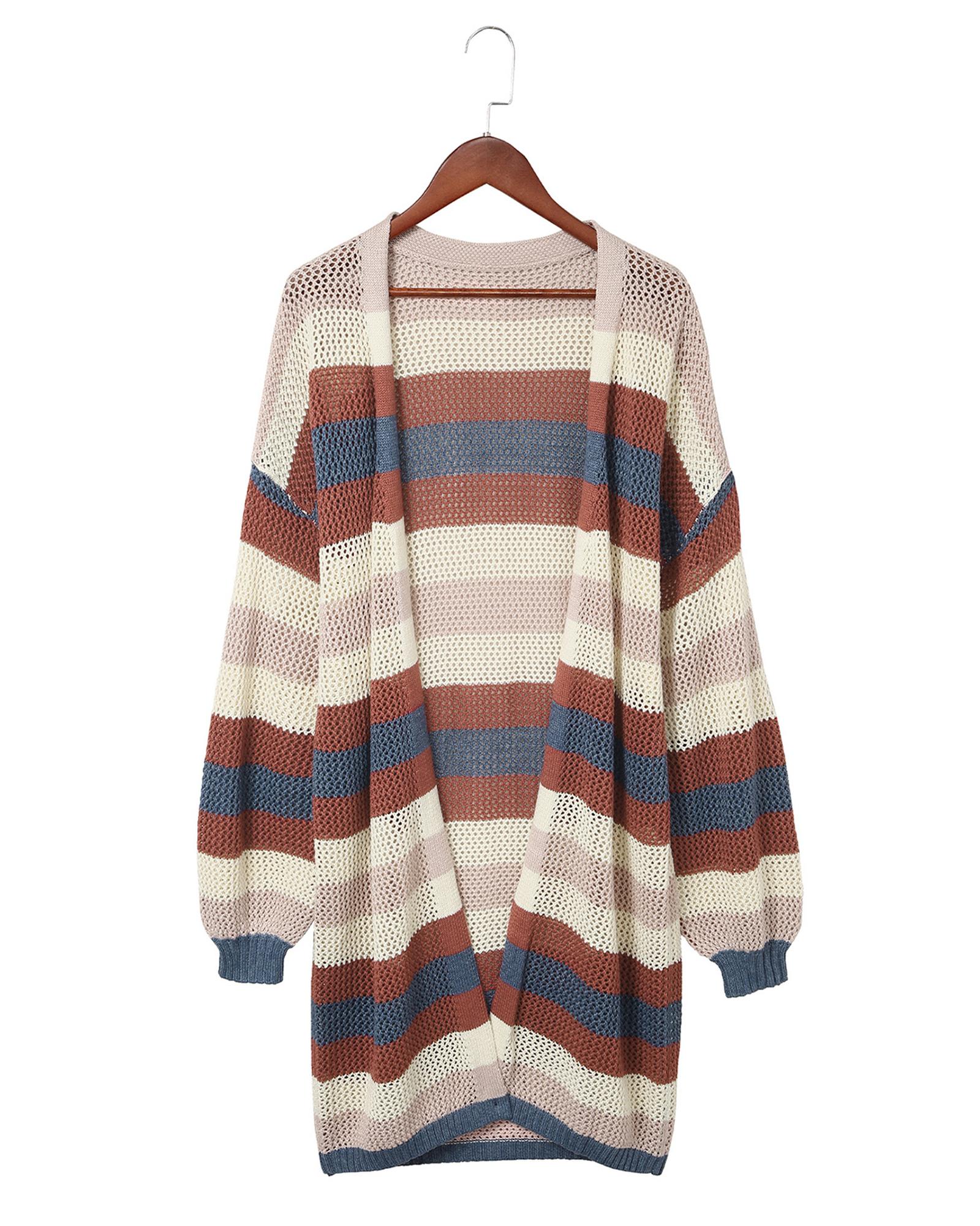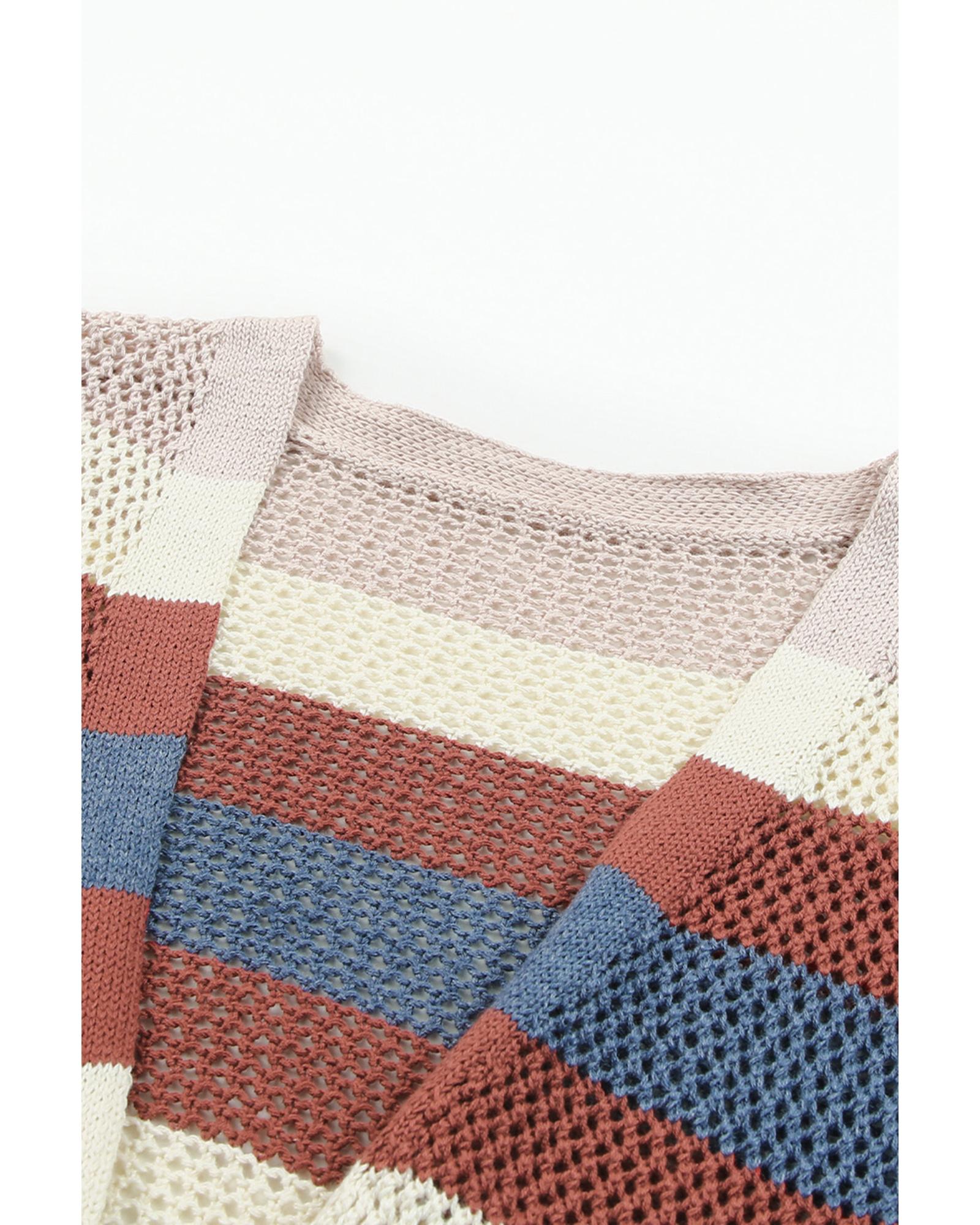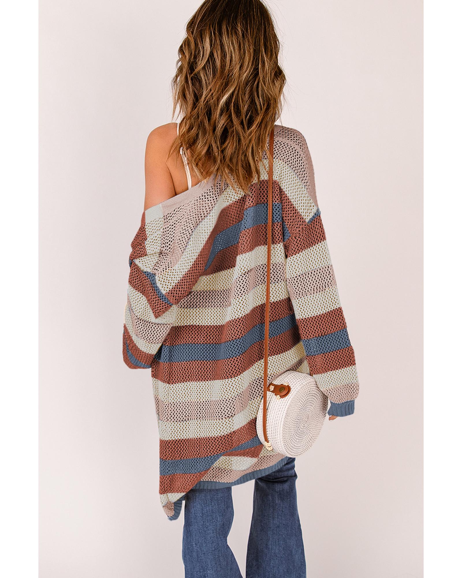 - Blue Striped Color Block Hollowed Knit Cardigan