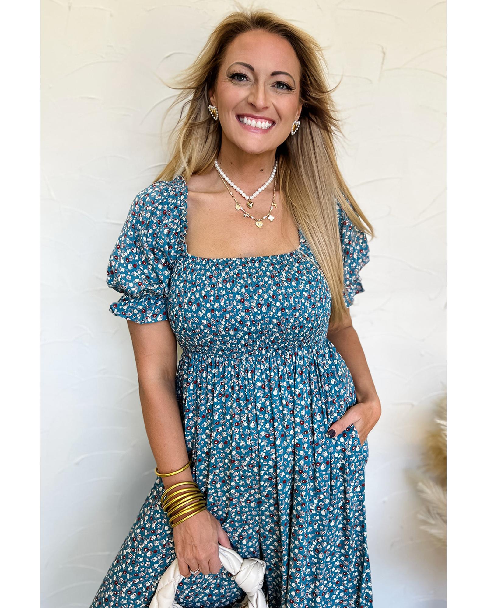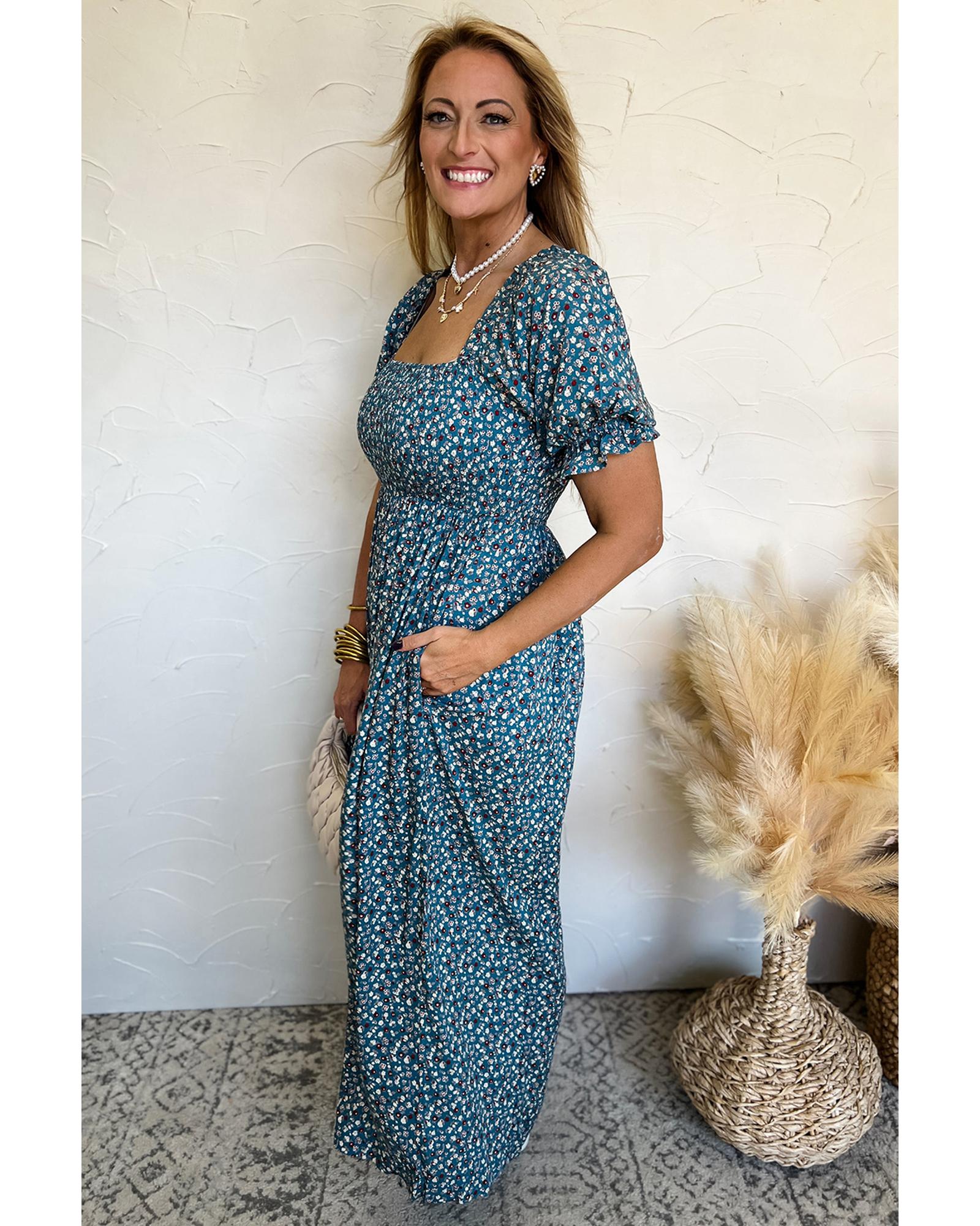 Blue Vintage Boho Floral Smocked Short Puff Sleeve Wide Leg Jumpsuit – M