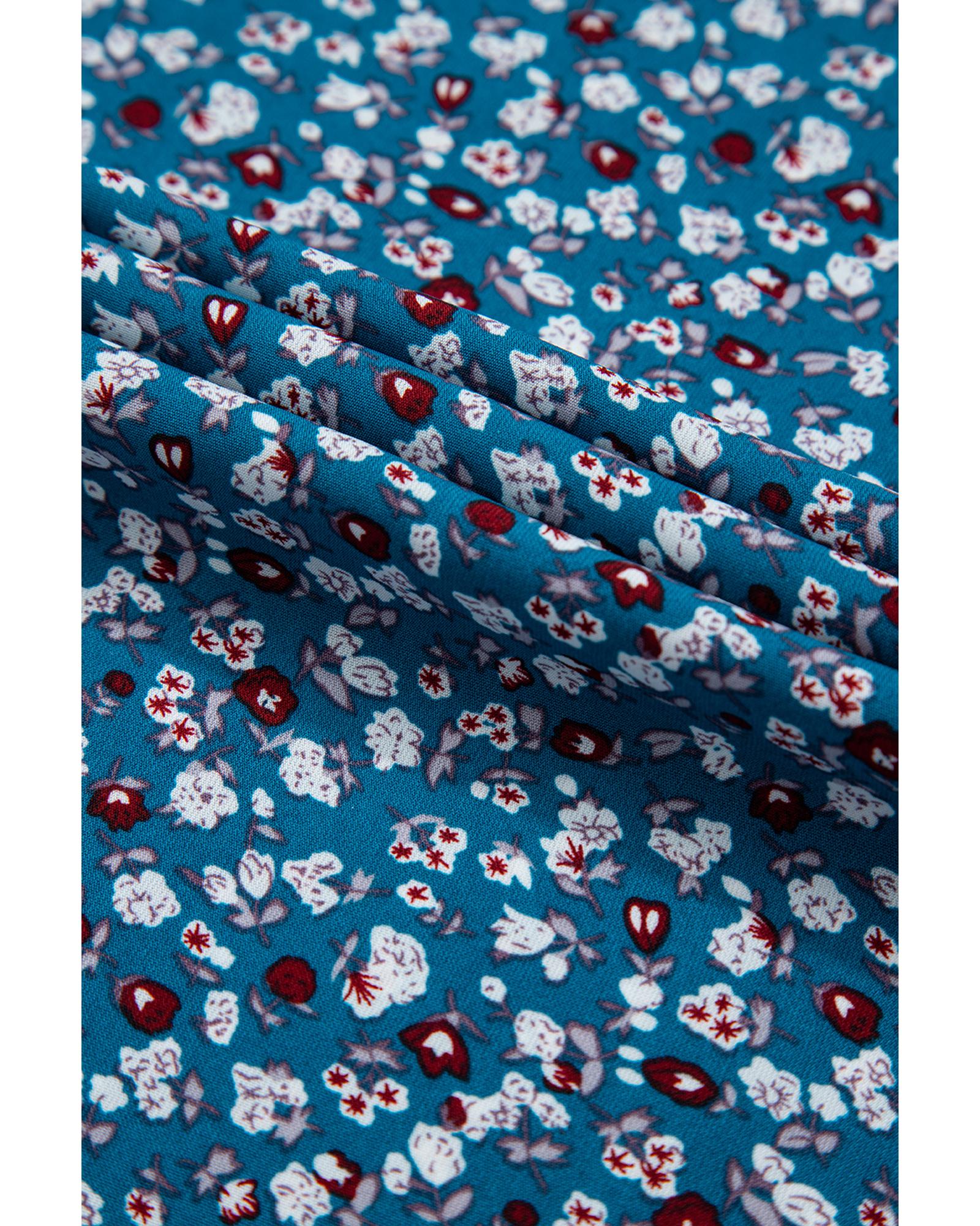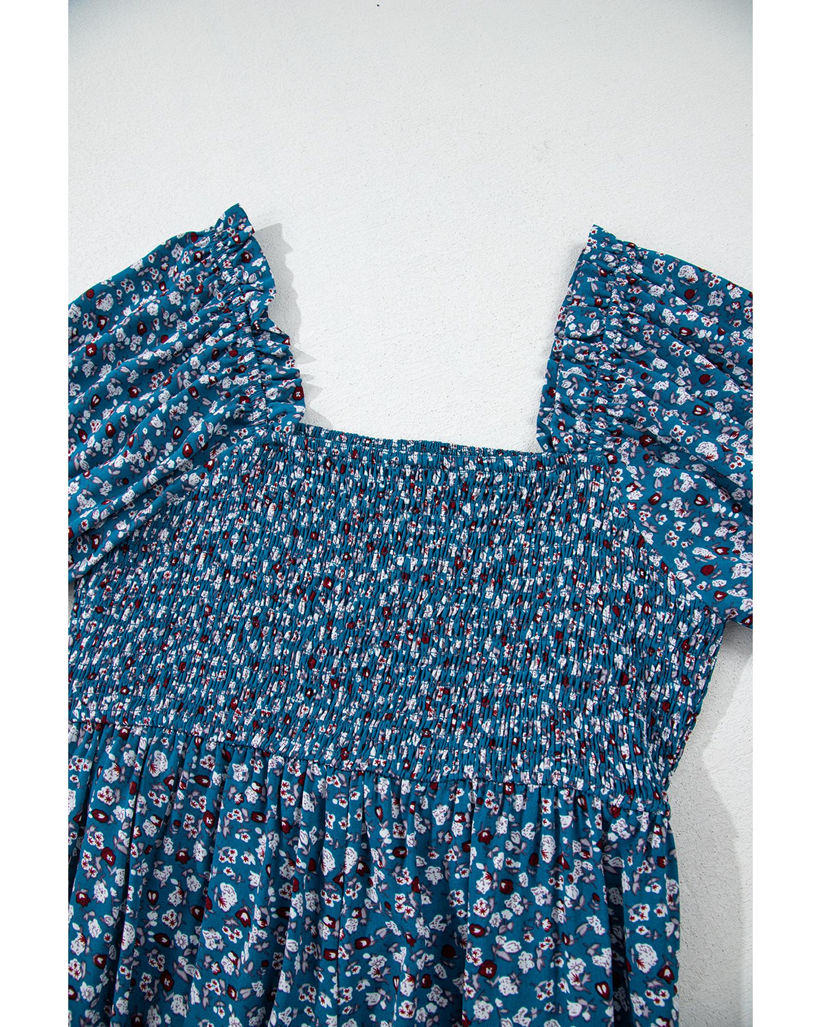 Blue Vintage Boho Floral Smocked Short Puff Sleeve Wide Leg Jumpsuit - L