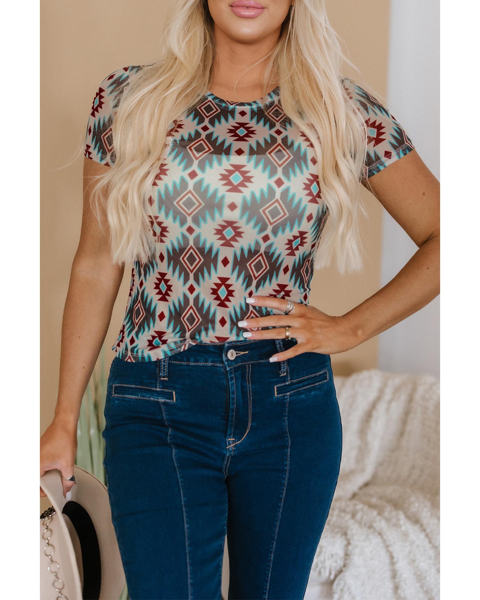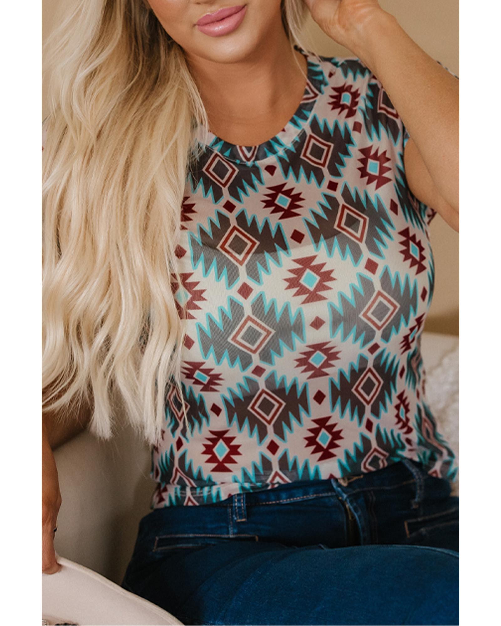 Blue Western Aztec Print Mesh Slim T Shirt – XL