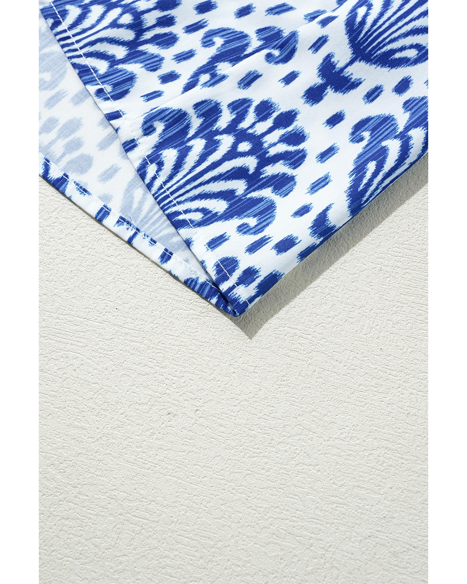 Blue Western Fashion Print Floral Puff Sleeve Frilled Neck Blouse – S