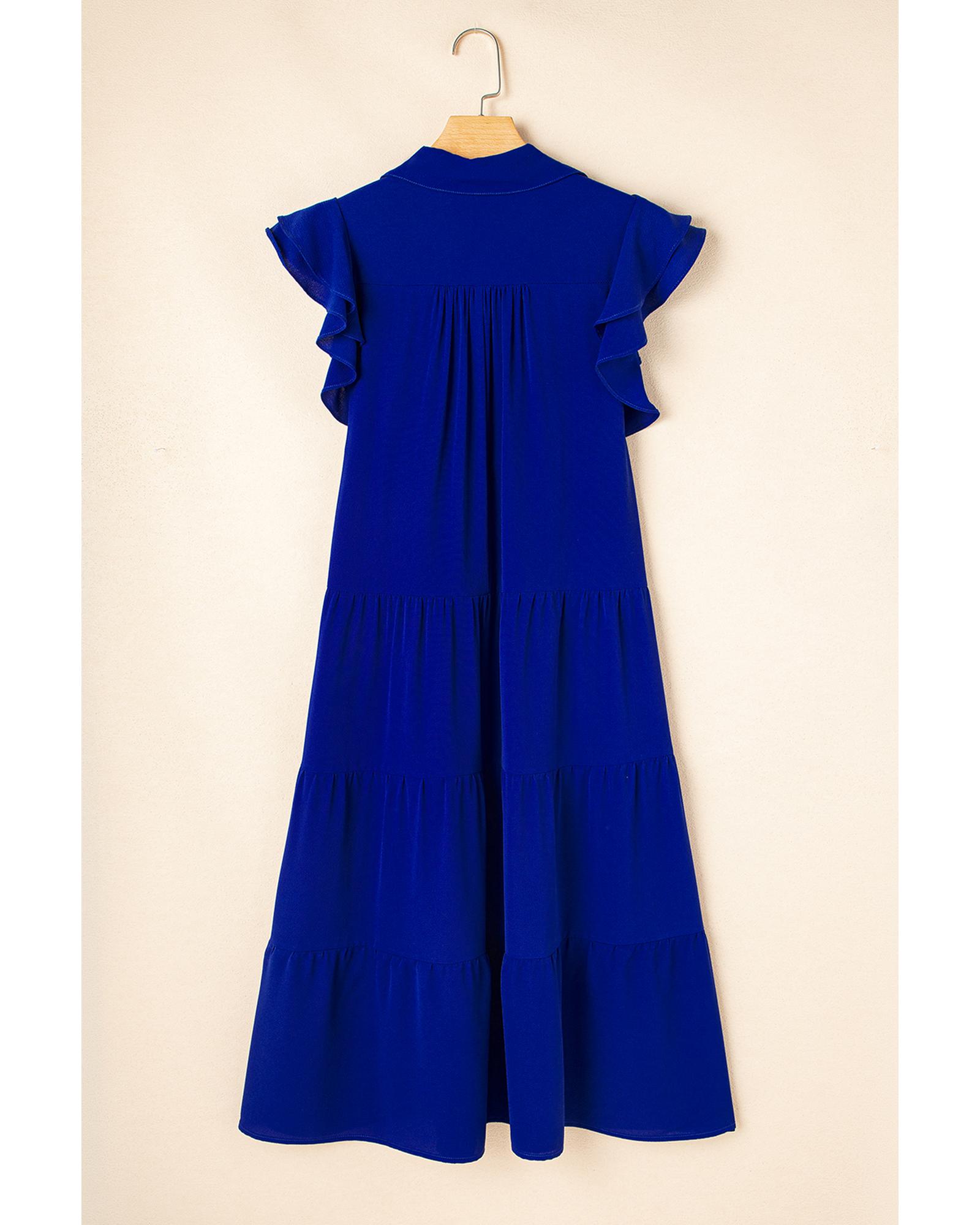 Bluing Ruffled Short Sleeve Collared V Neck Tiered Midi Dress – M
