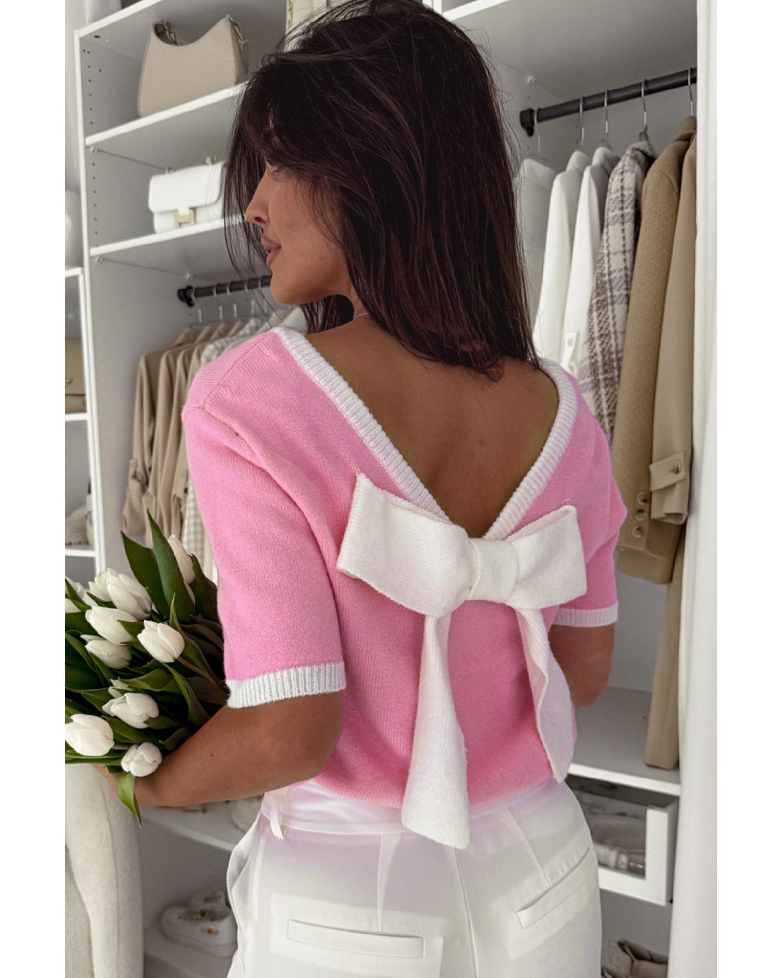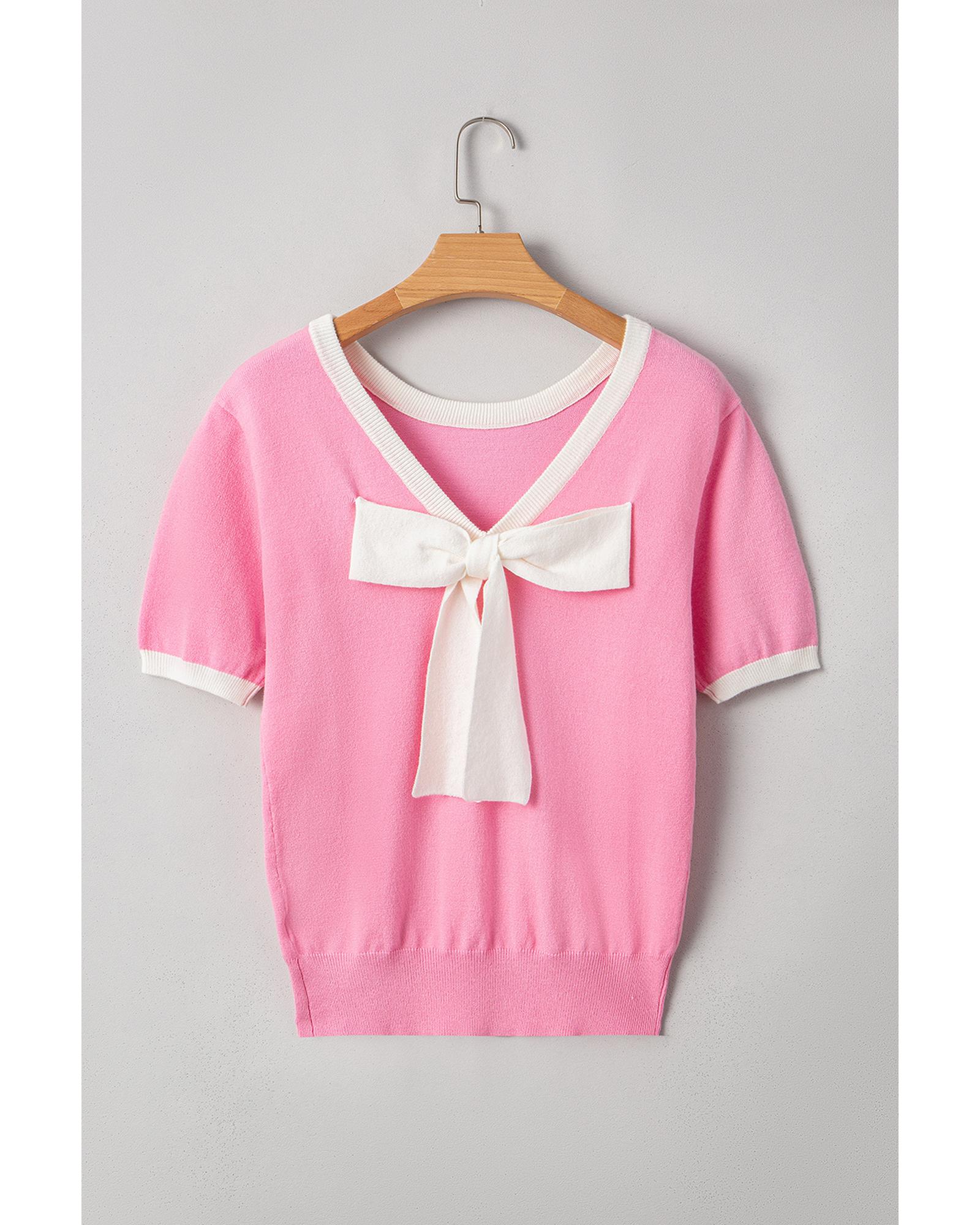 Bonbon Colorblock Bow V-Shape Cut Back Short Sleeve Sweater – L