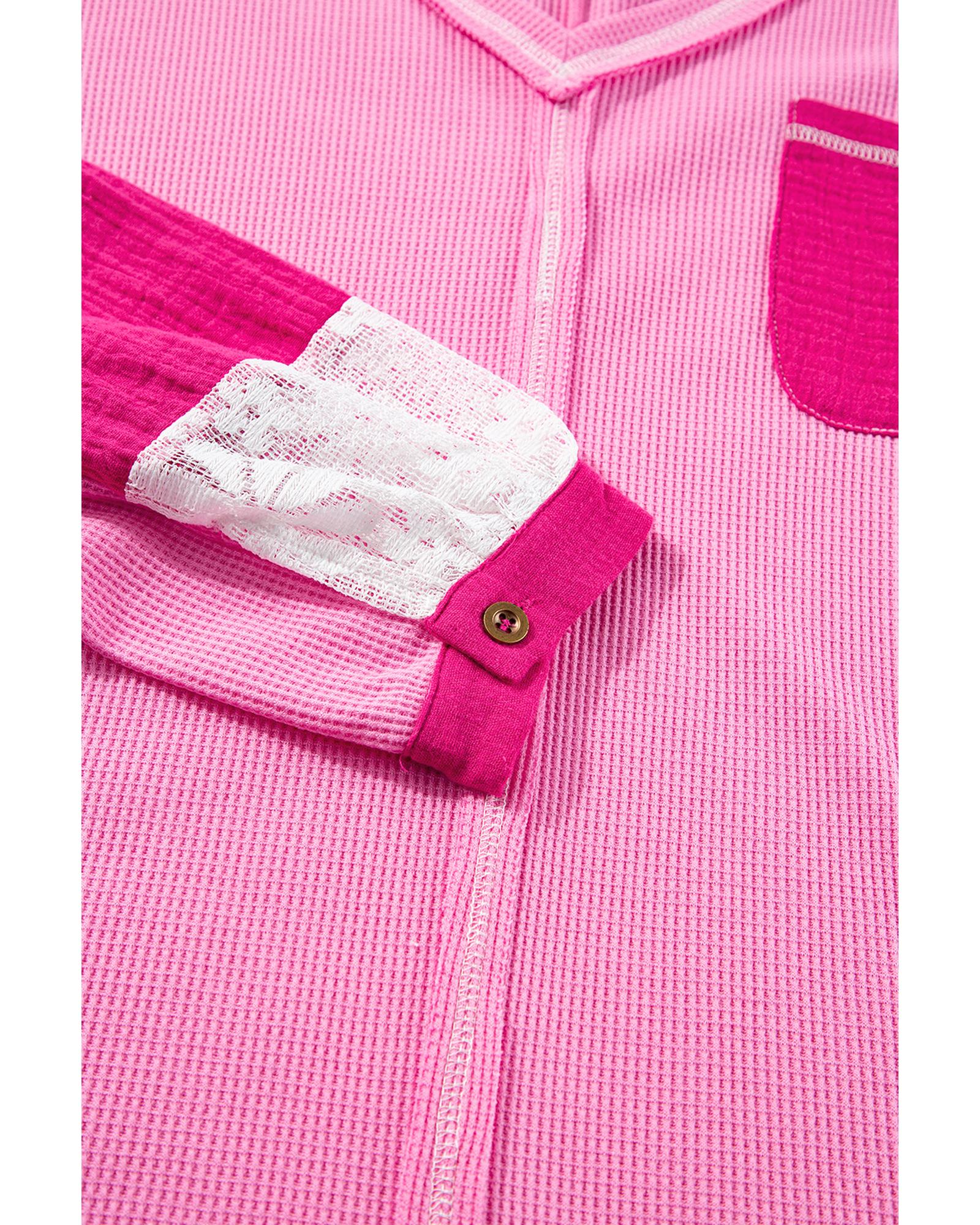 Bonbon Lace Floral Patchwork Sleeve Stitching V Neck Rib Knit Blouse – S