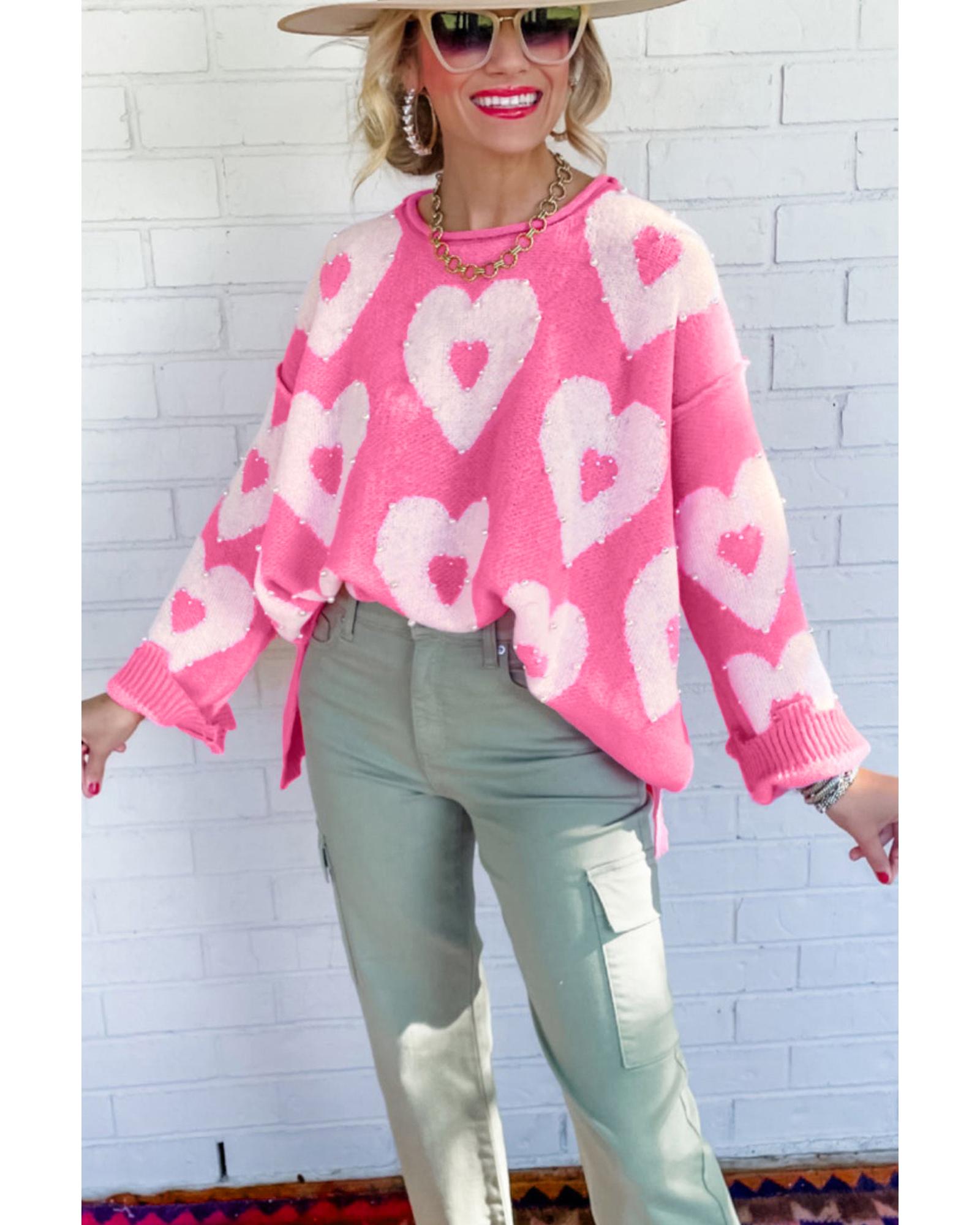 - Unique and cozy Bonbon Pearl Beaded Heart Drop Shoulder Sweater