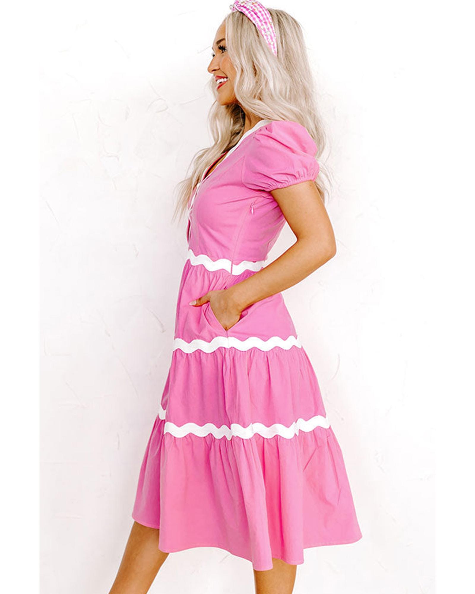 Bonbon Ric Rac Trim Short Puff Sleeve Flowy Midi Dress – L