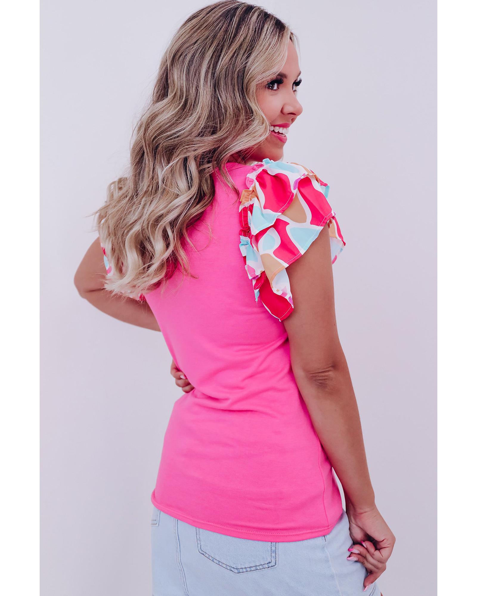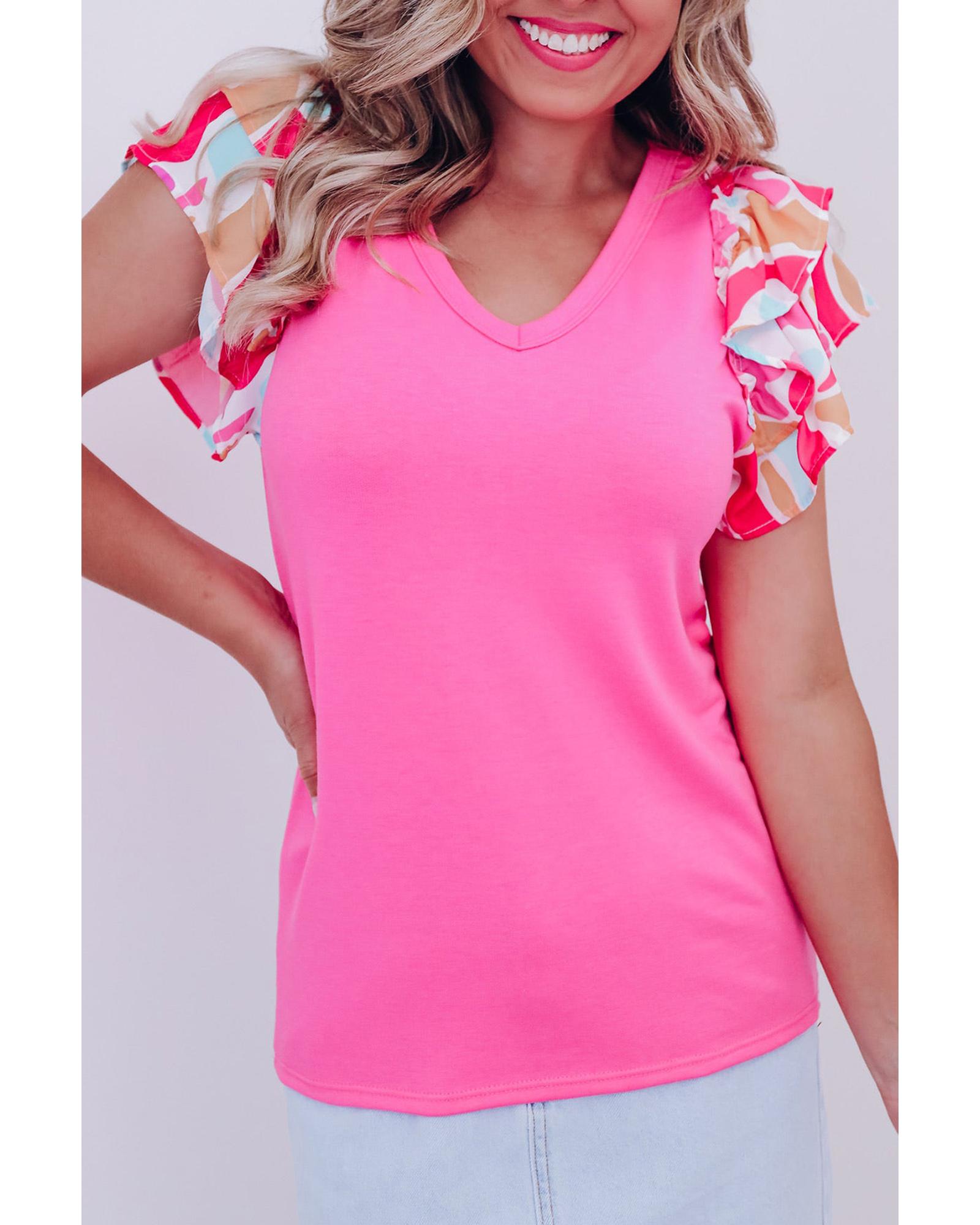 Bonbon V Neck Printed Ruffle Sleeve Patchwork T-shirt – L