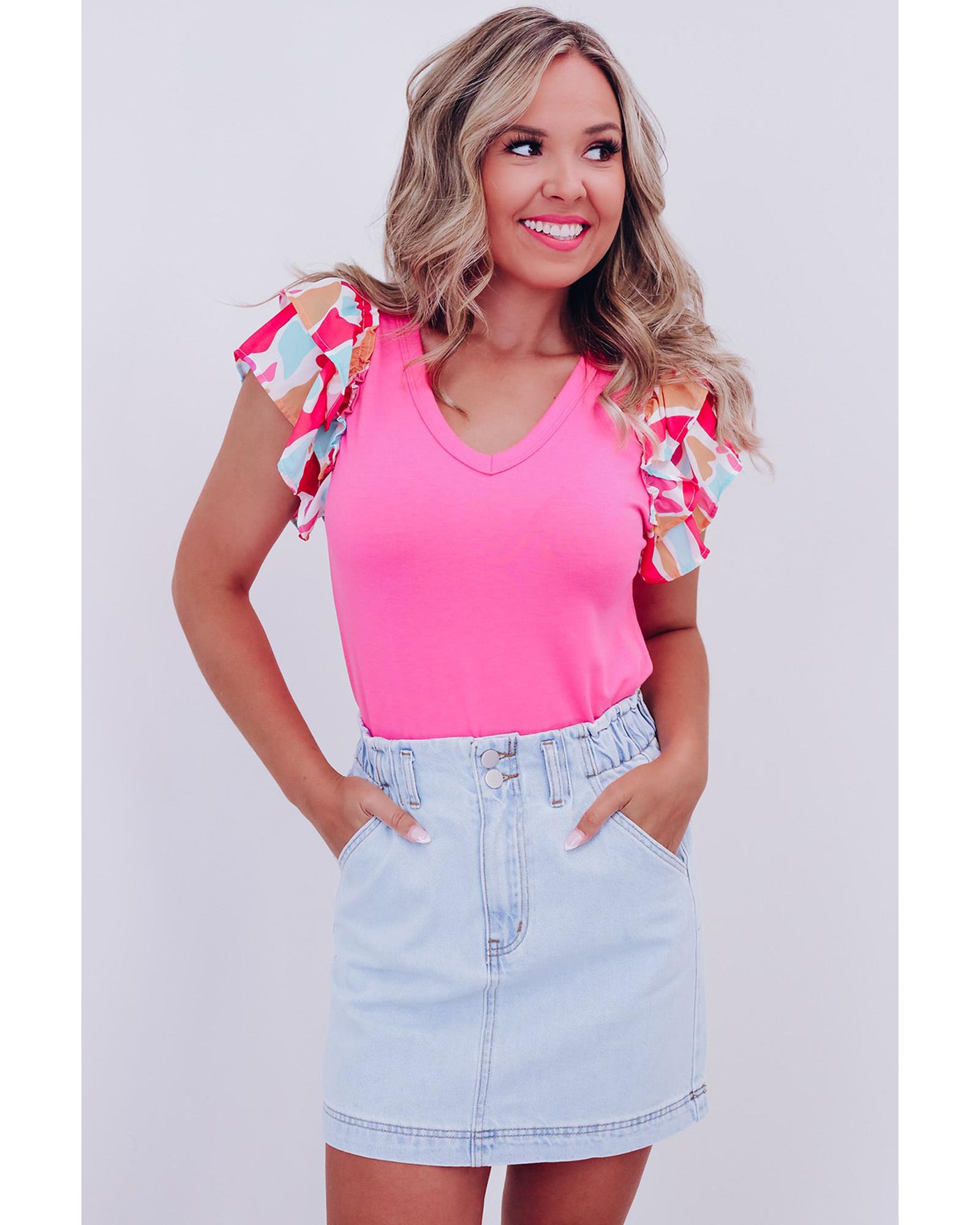 Bonbon V Neck Printed Ruffle Sleeve Patchwork T-shirt – M
