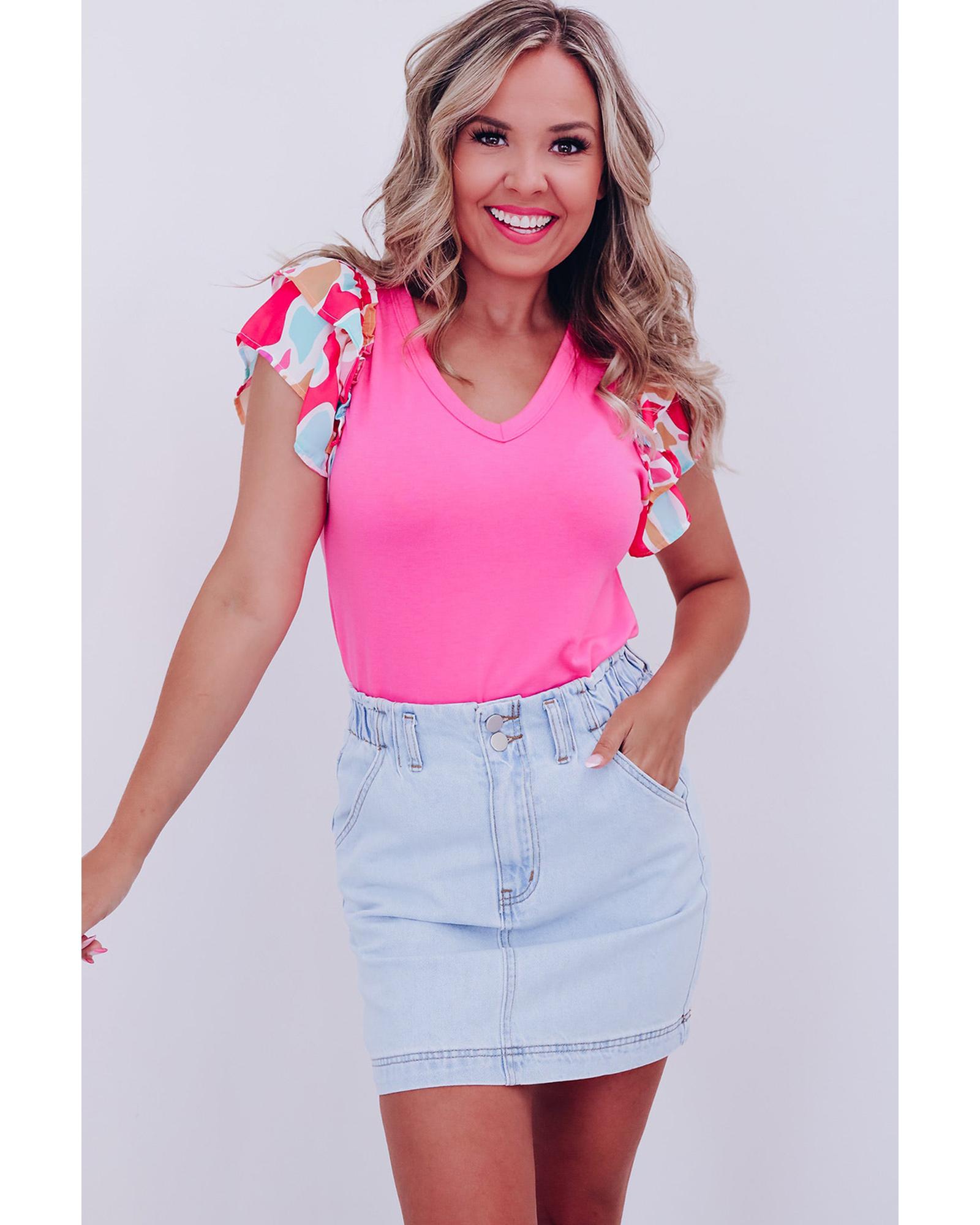 Bonbon V Neck Printed Ruffle Sleeve Patchwork T-shirt – S