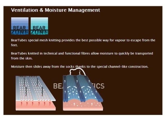 - Moisture Management – BearTubes special mesh knitting provides the best possible way for vapour to escape from the feet. BearTubes knitted in technical and functional fibres allow moisture to quickly be transported from the skin. Moisture then slides away from the socks thanks to the special channel-like construction.