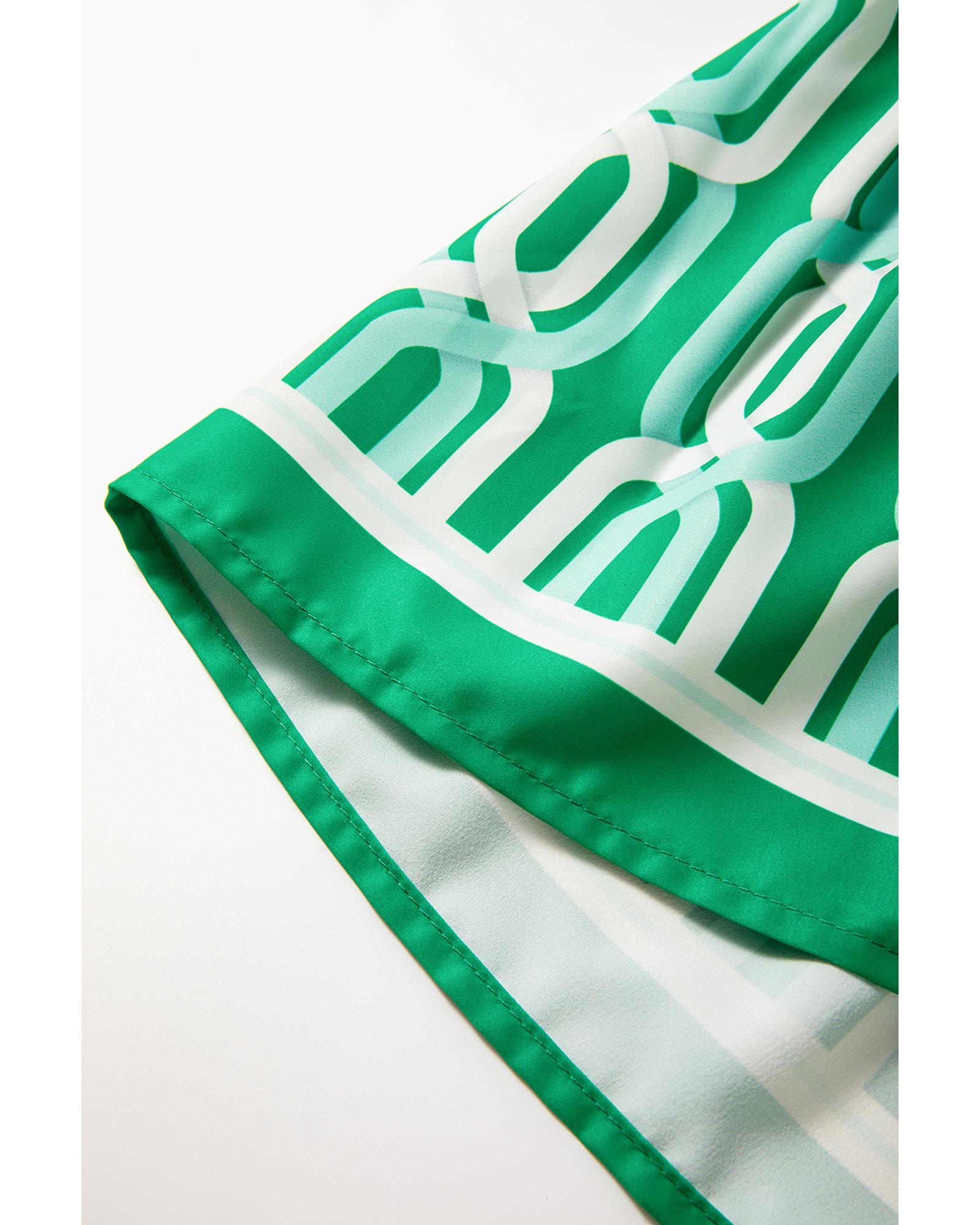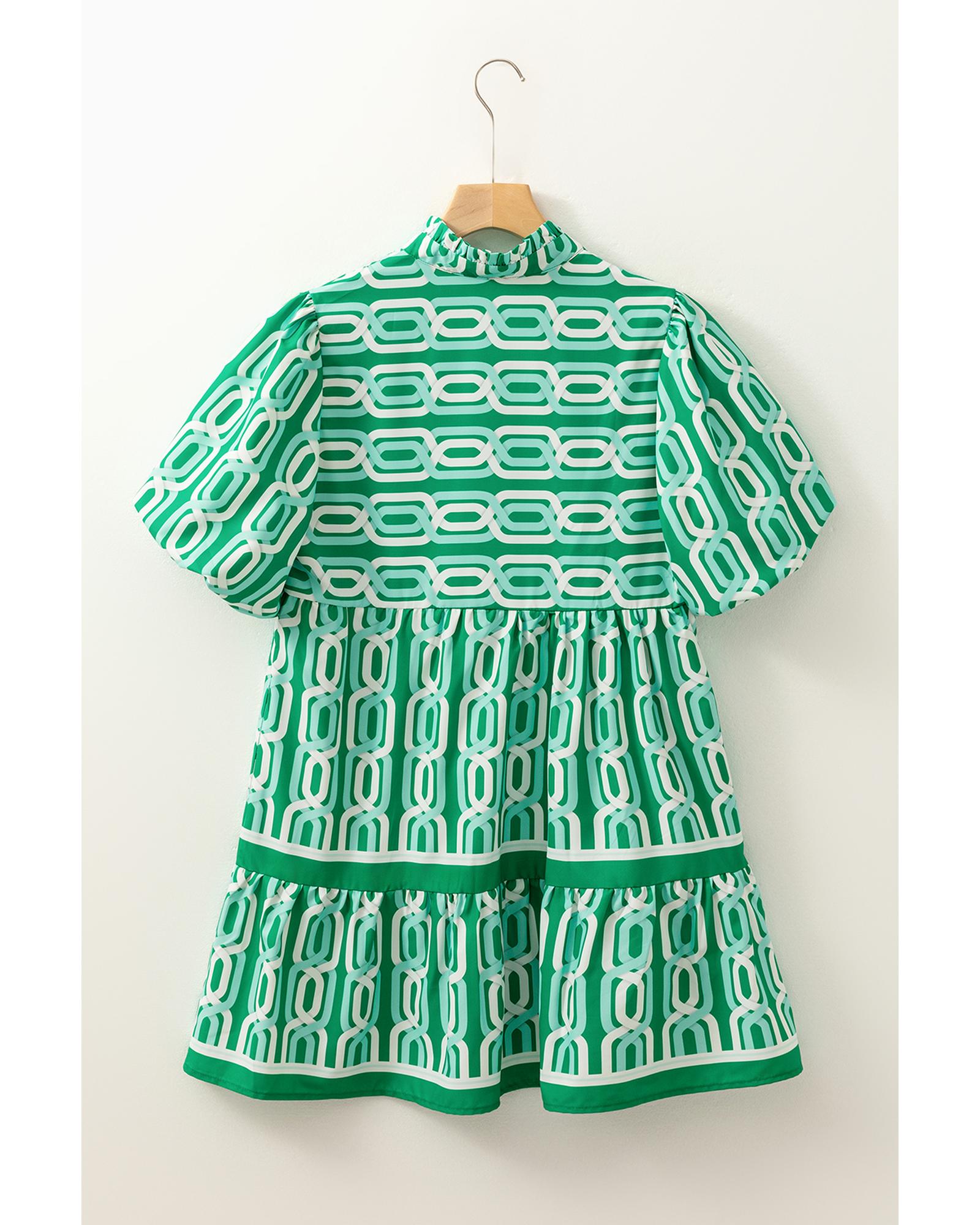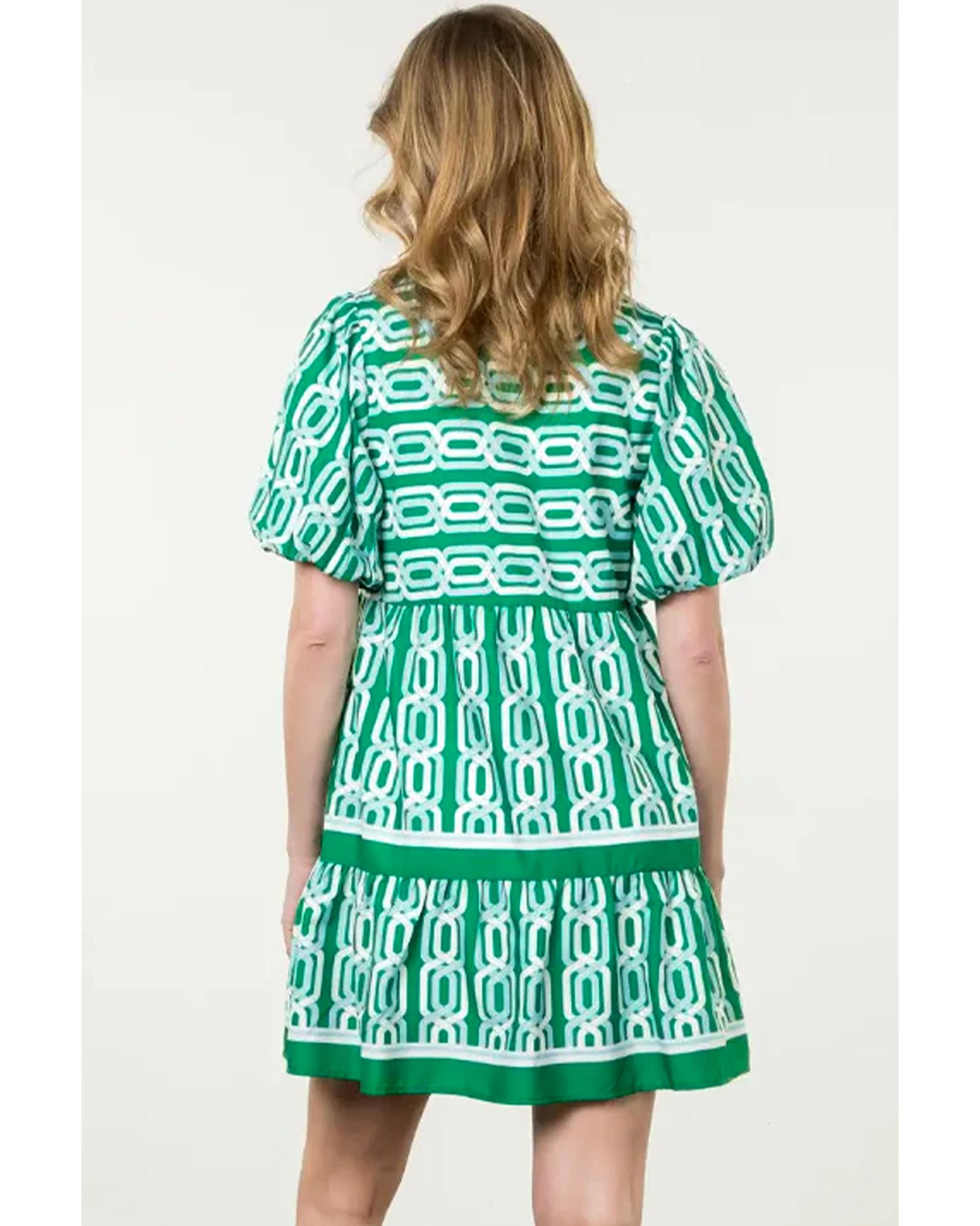 Bright Green Abstract Patterned V Neck Puff Short Sleeve Mini Dress – L