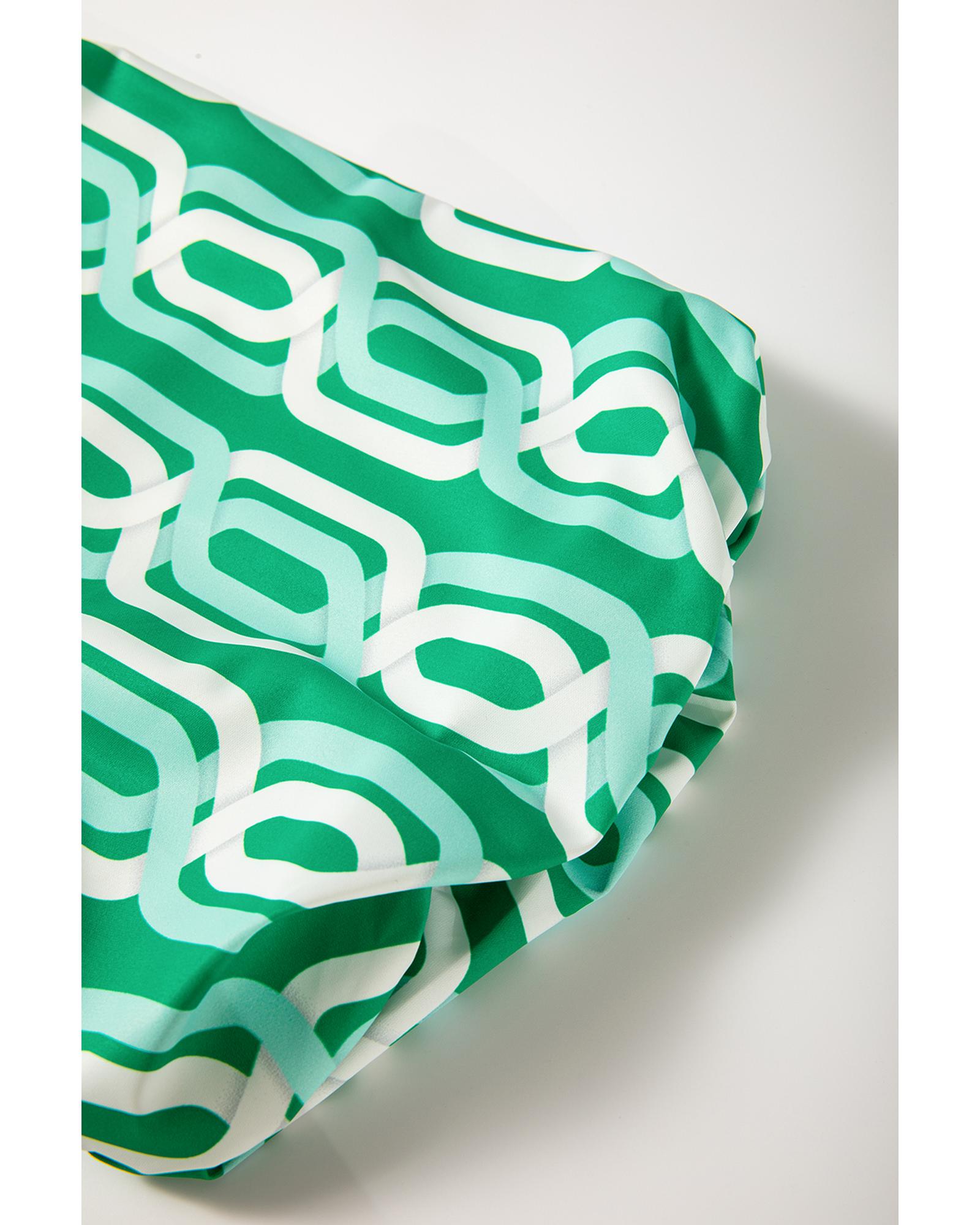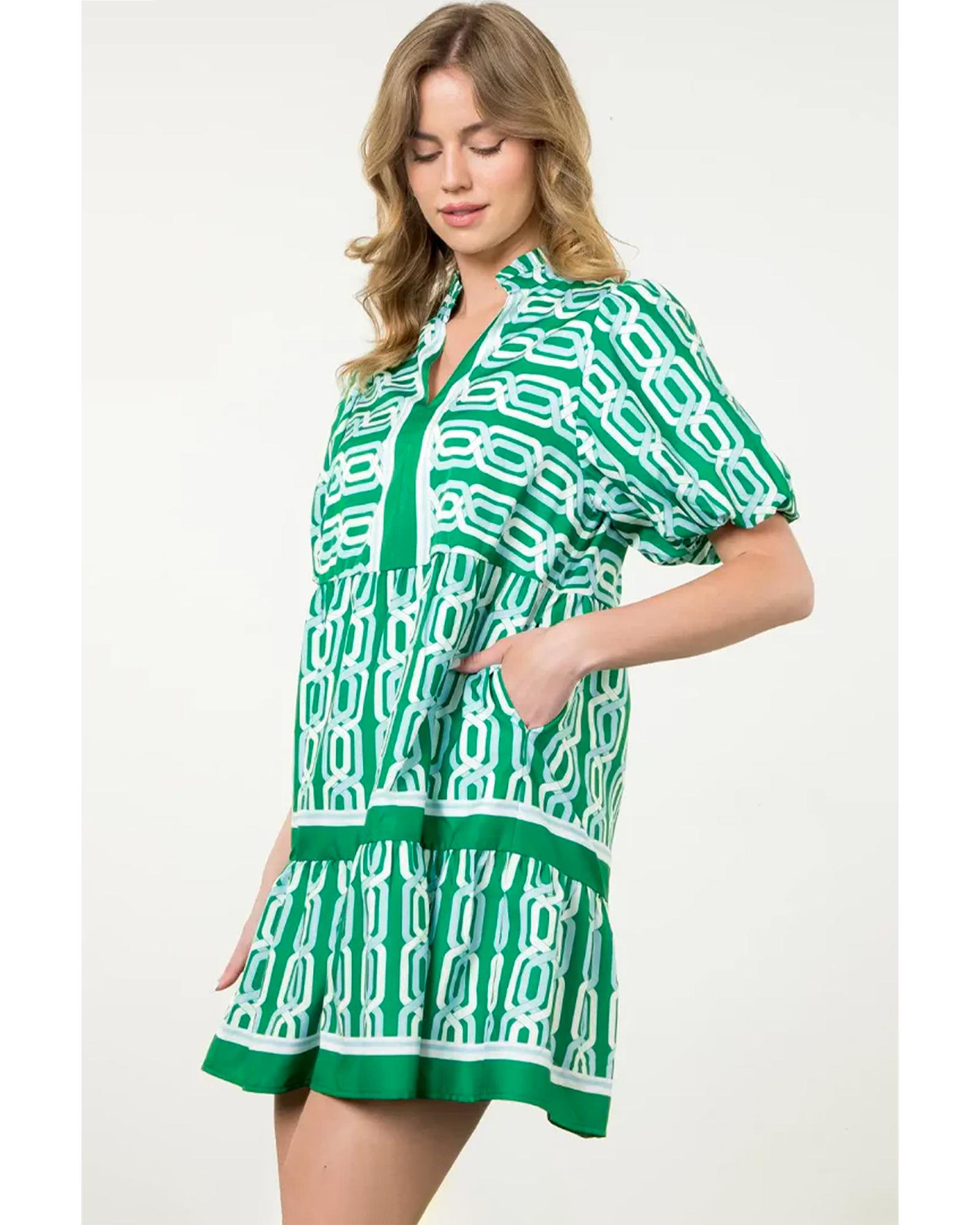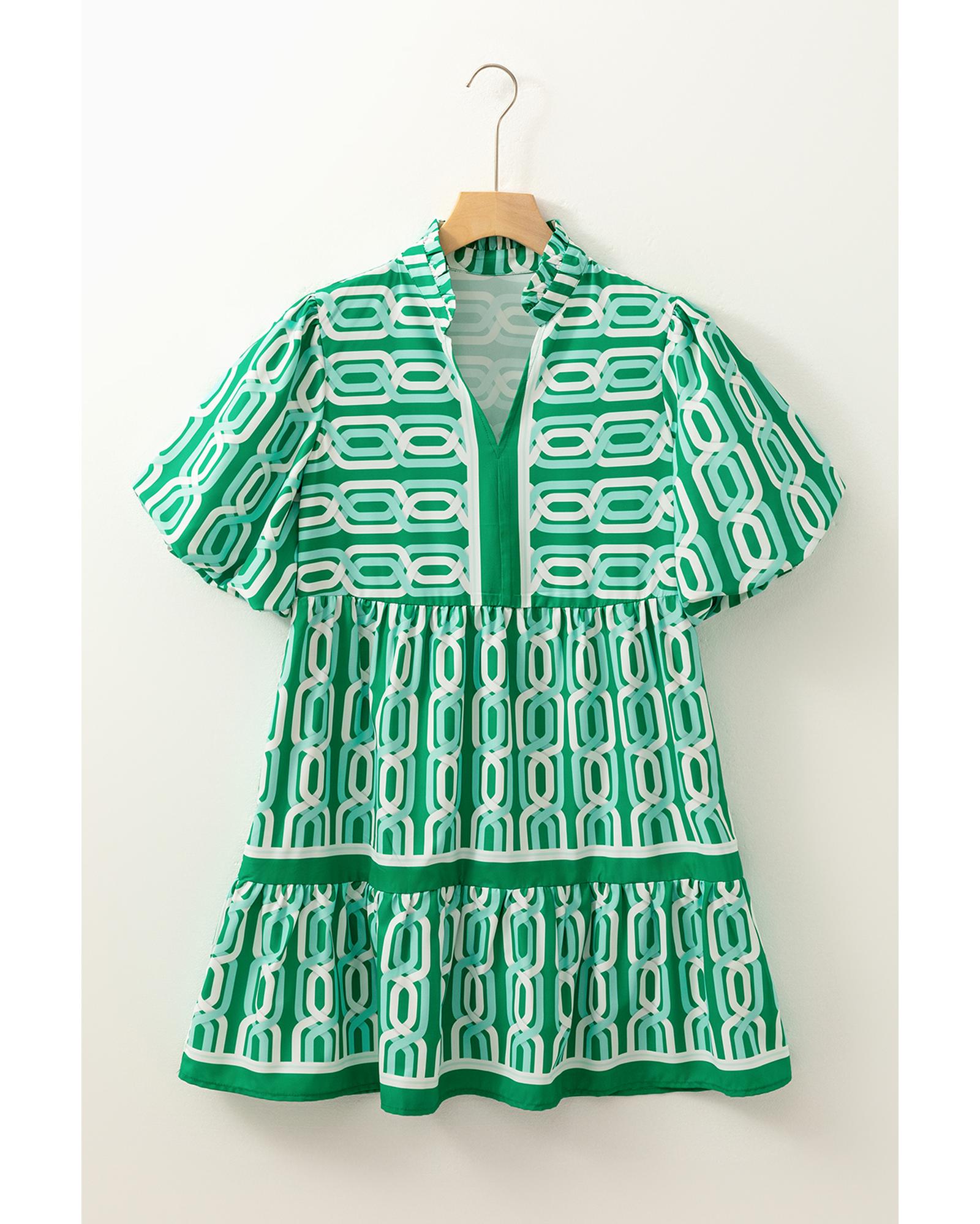 Bright Green Abstract Patterned V Neck Puff Short Sleeve Mini Dress – XL