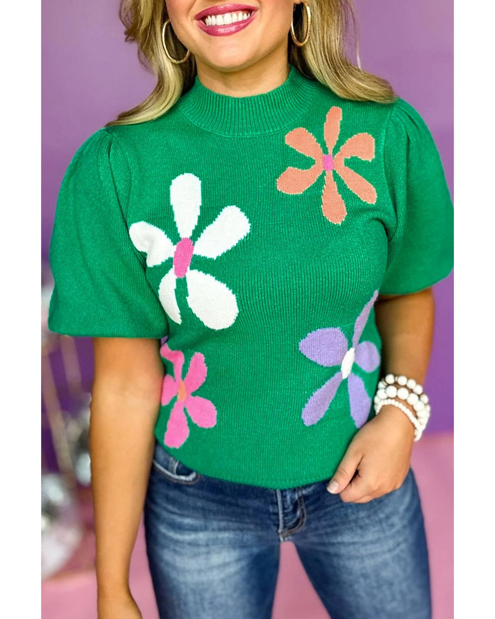 Bright Green Floral Bubble Short Sleeve Sweater – M