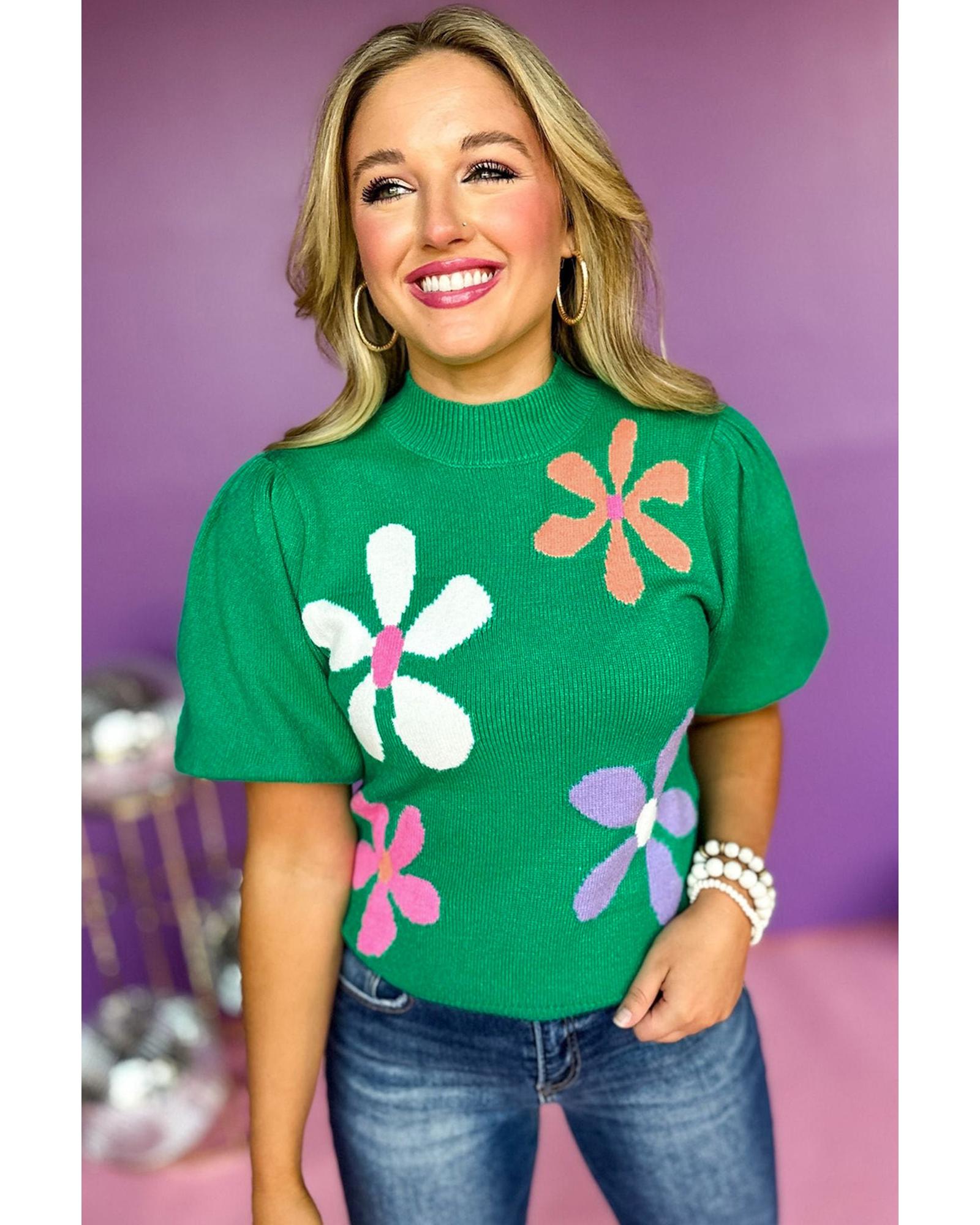 Bright Green Floral Bubble Short Sleeve Sweater – XL