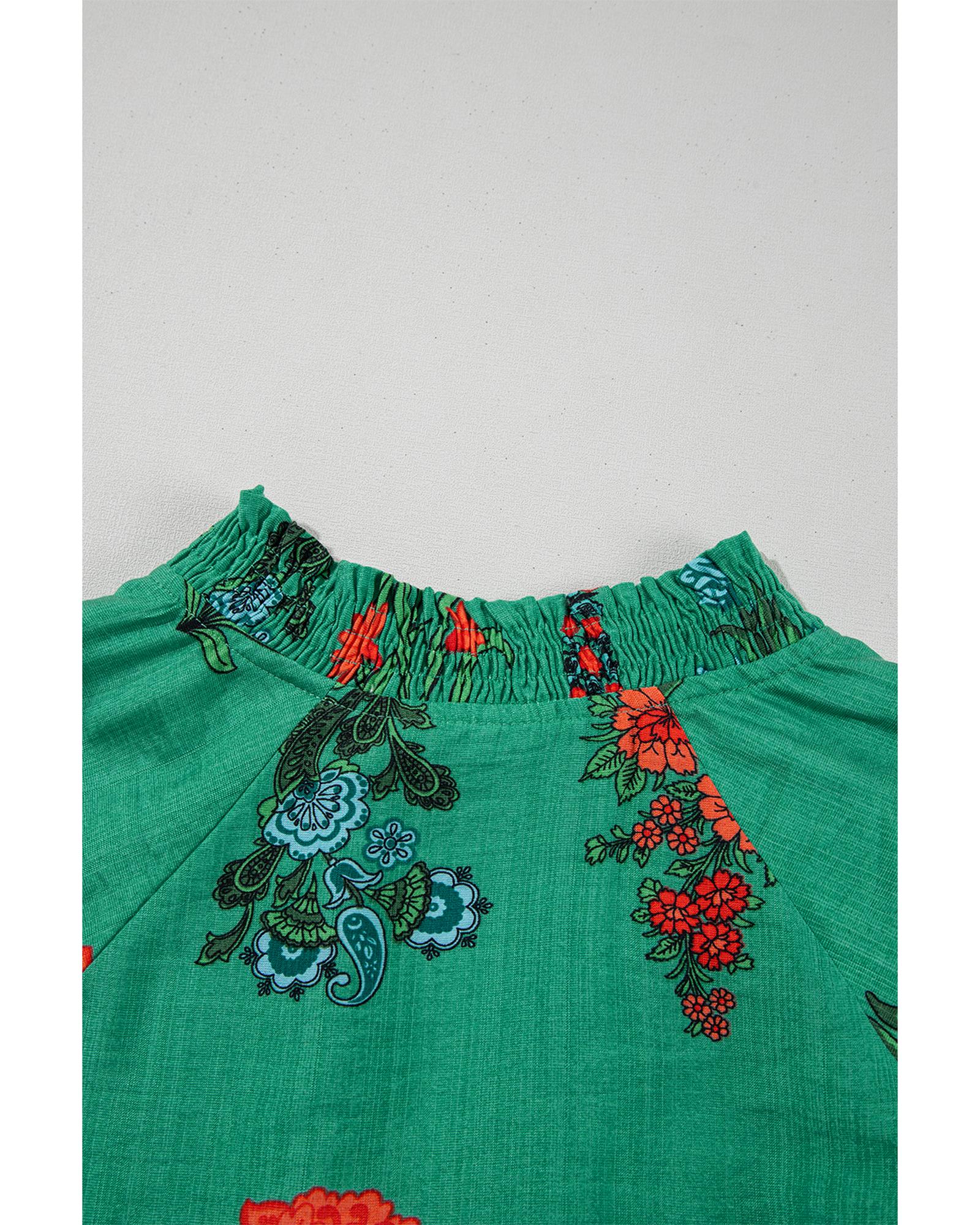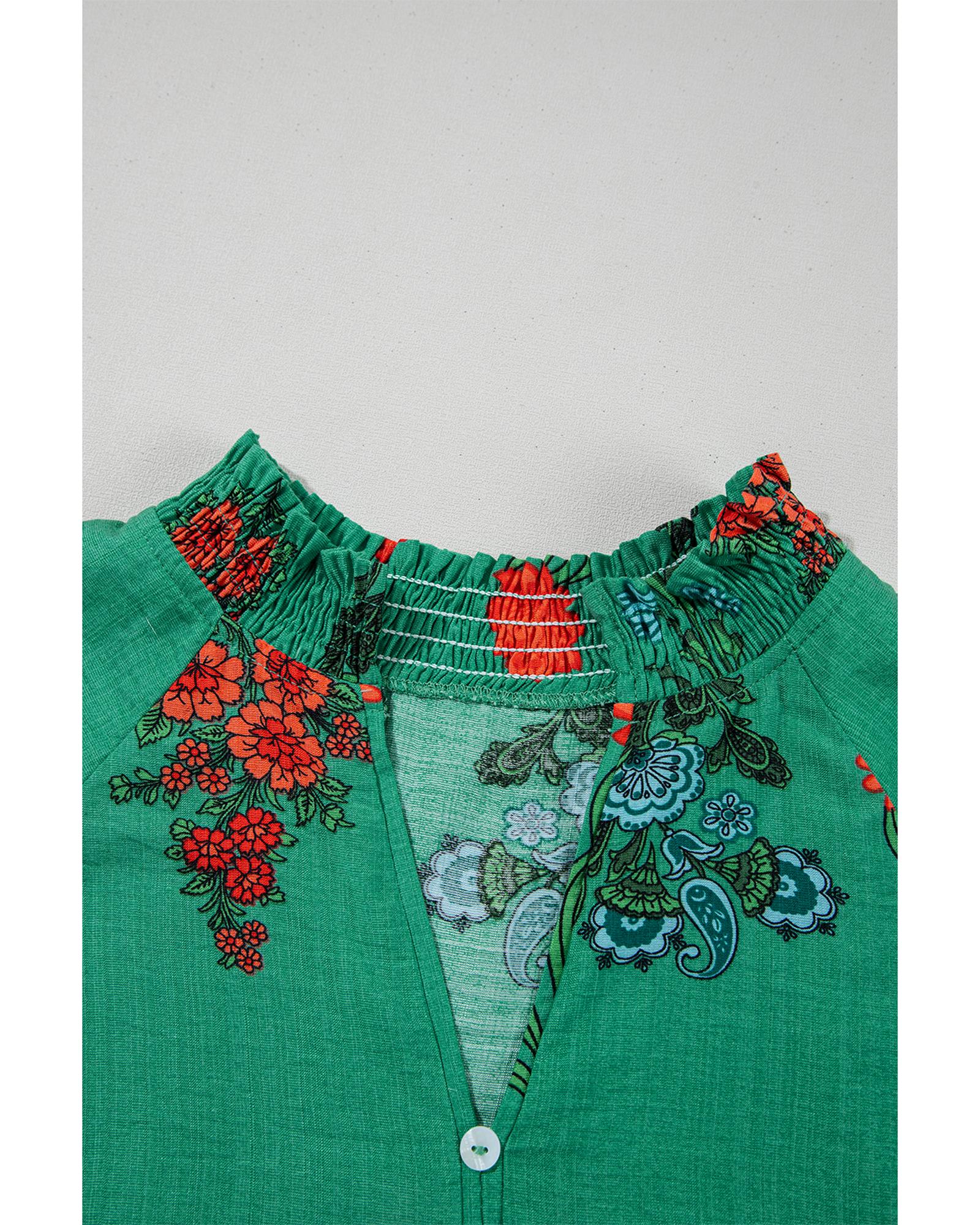 Bright Green Floral Print Buttoned V Neck Short Sleeve Blouse – XL