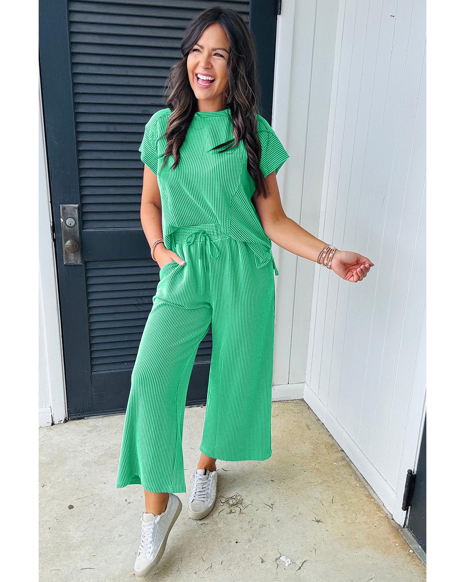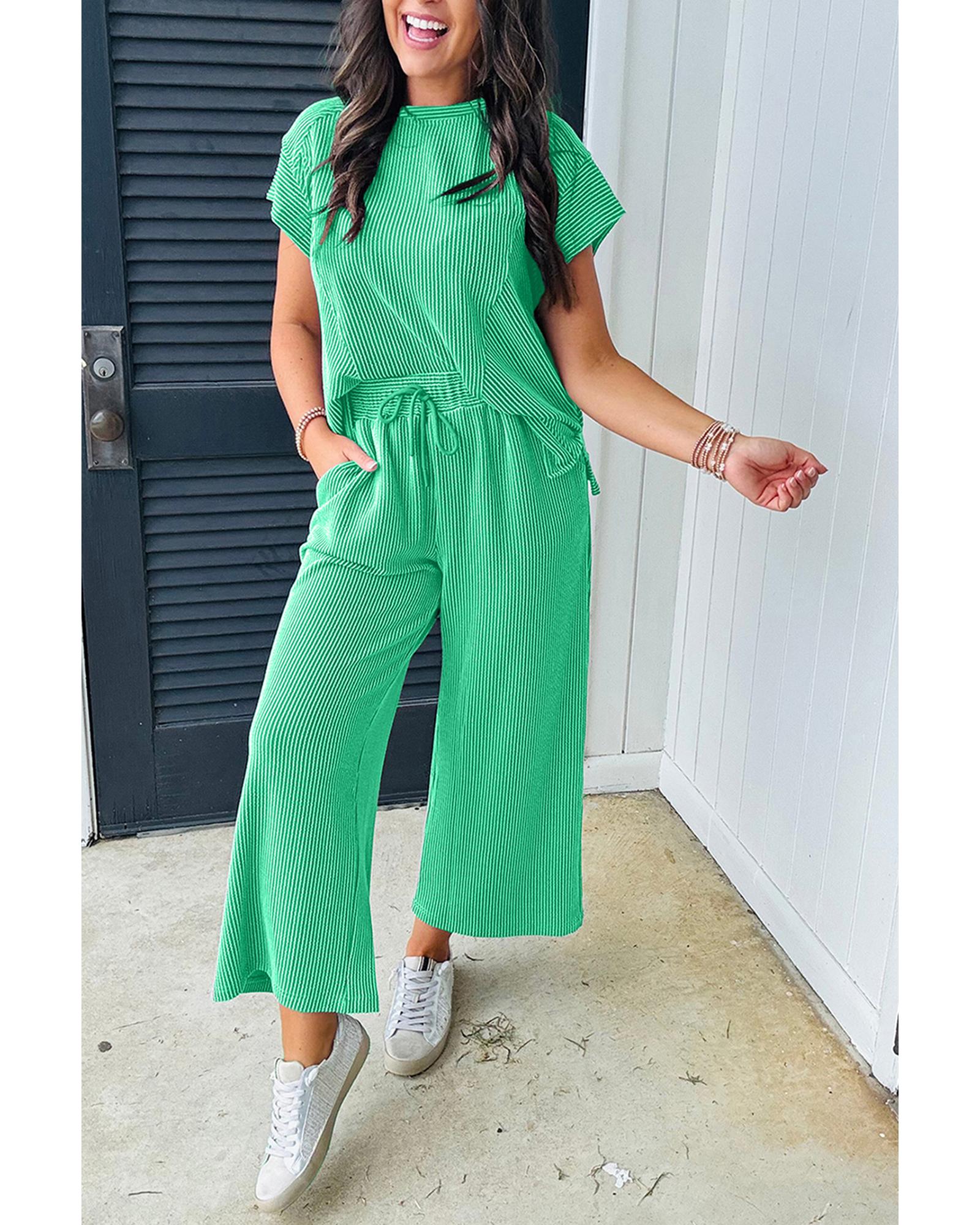 Bright Green Solid Corded Knit Short Sleeve T Shirt and Wide Leg Pants Set – M