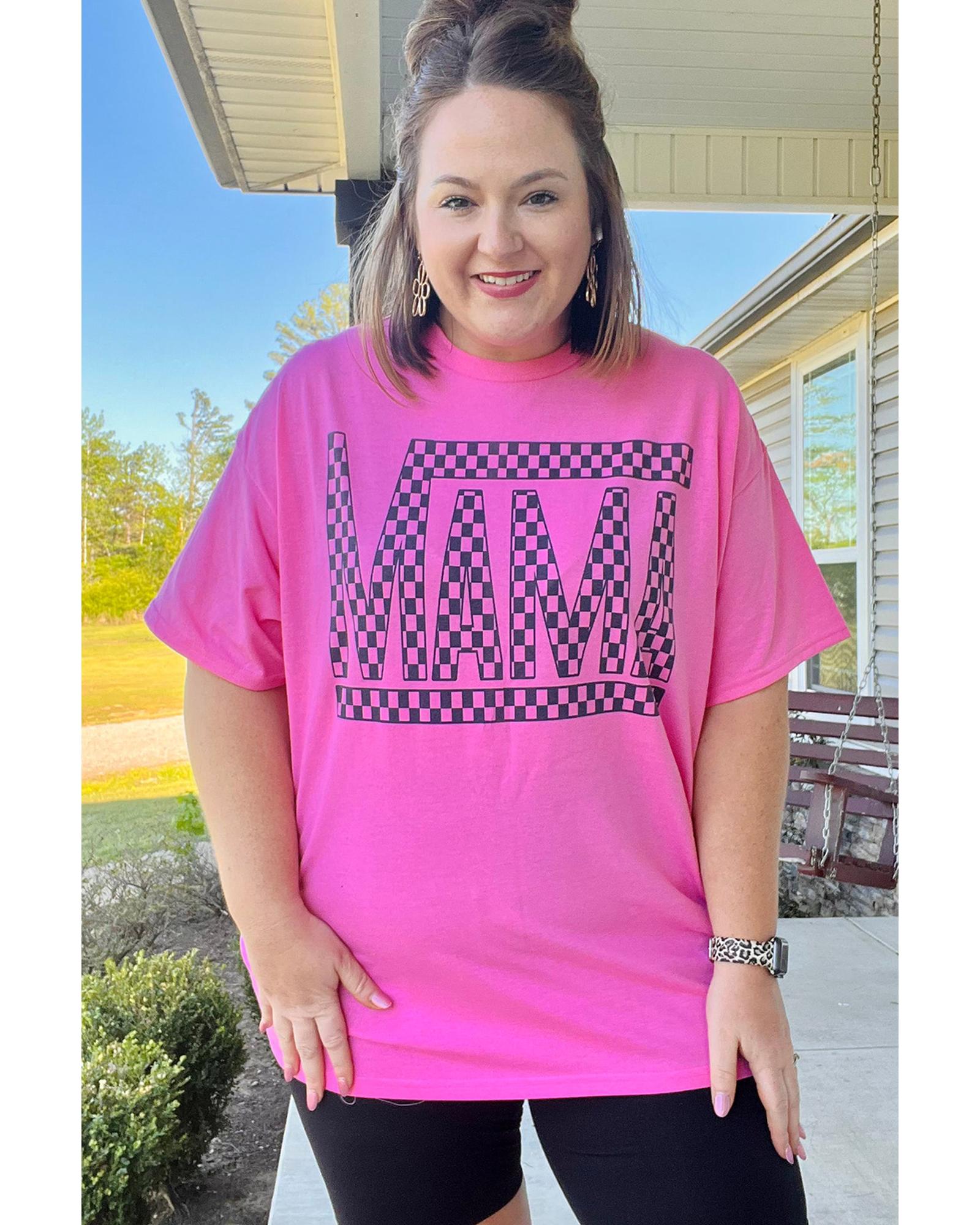 Bright Pink Checker MAMA Letter Printed Graphic Plus Size T Shirt - 2X