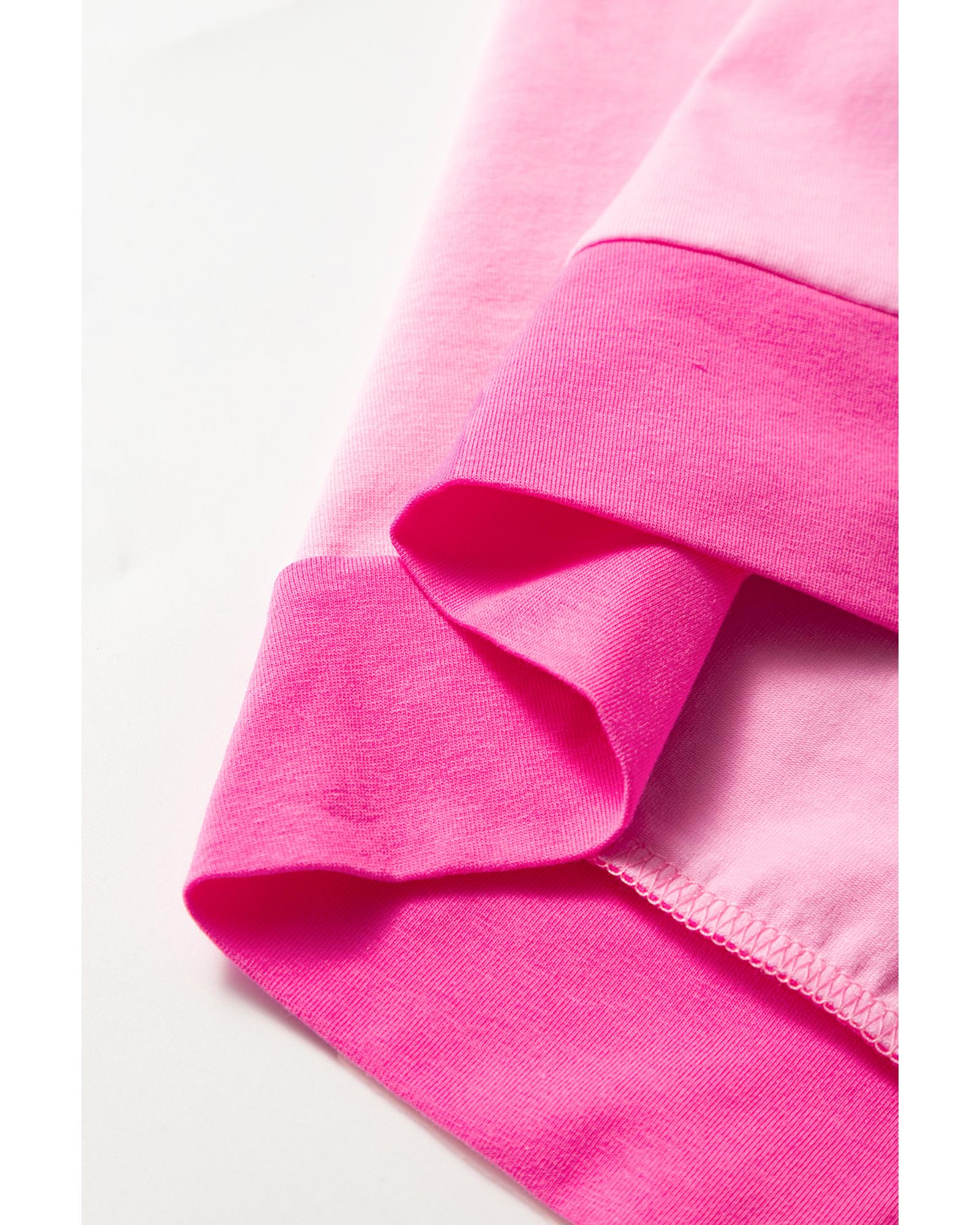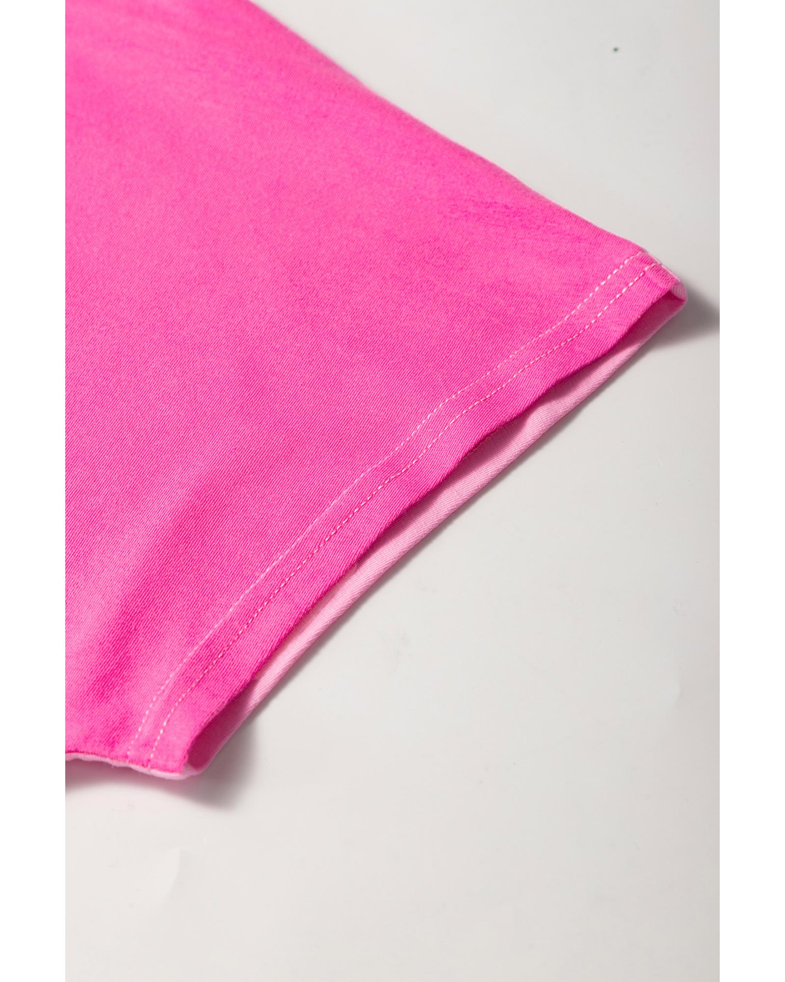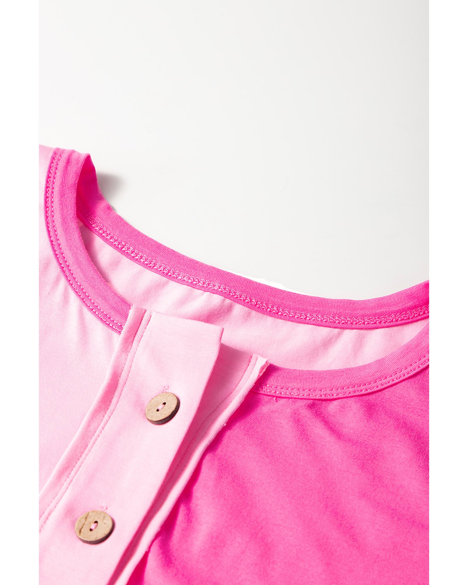 Bright Pink Colorblock Patchwork Short Sleeve Buttons Plus Size Henley Top – 1X