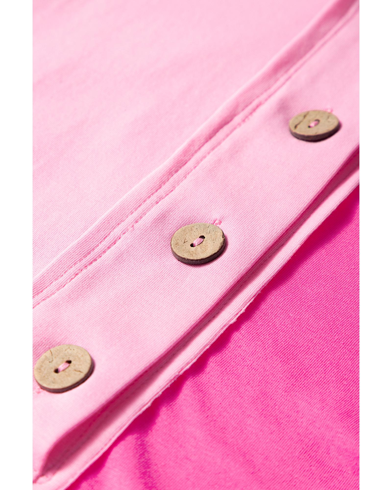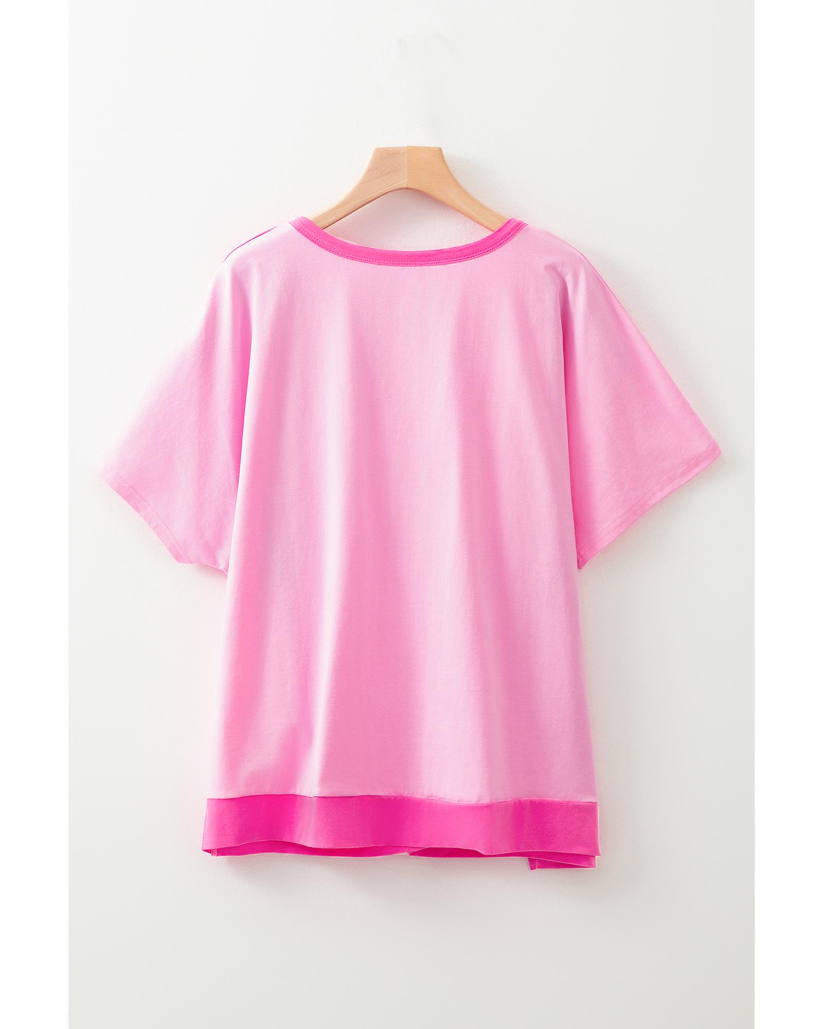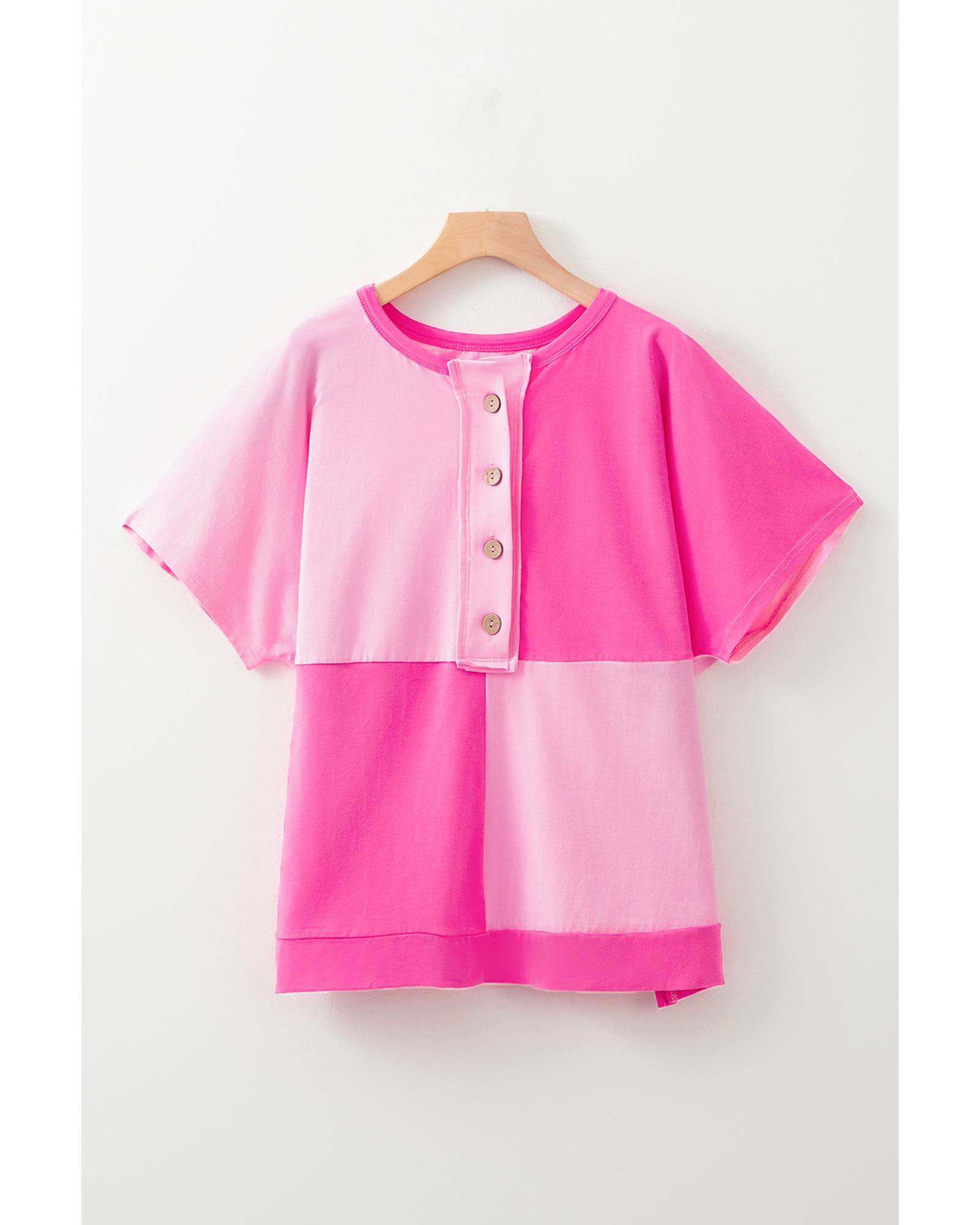 Bright Pink Colorblock Patchwork Short Sleeve Buttons Plus Size Henley Top – 3X