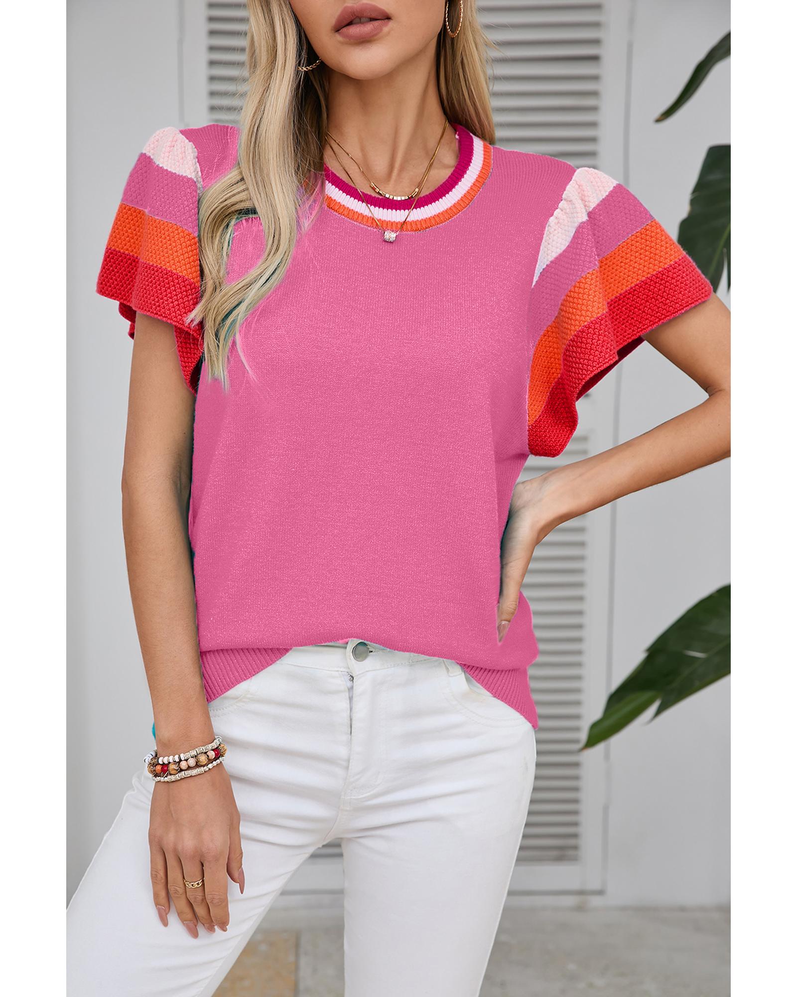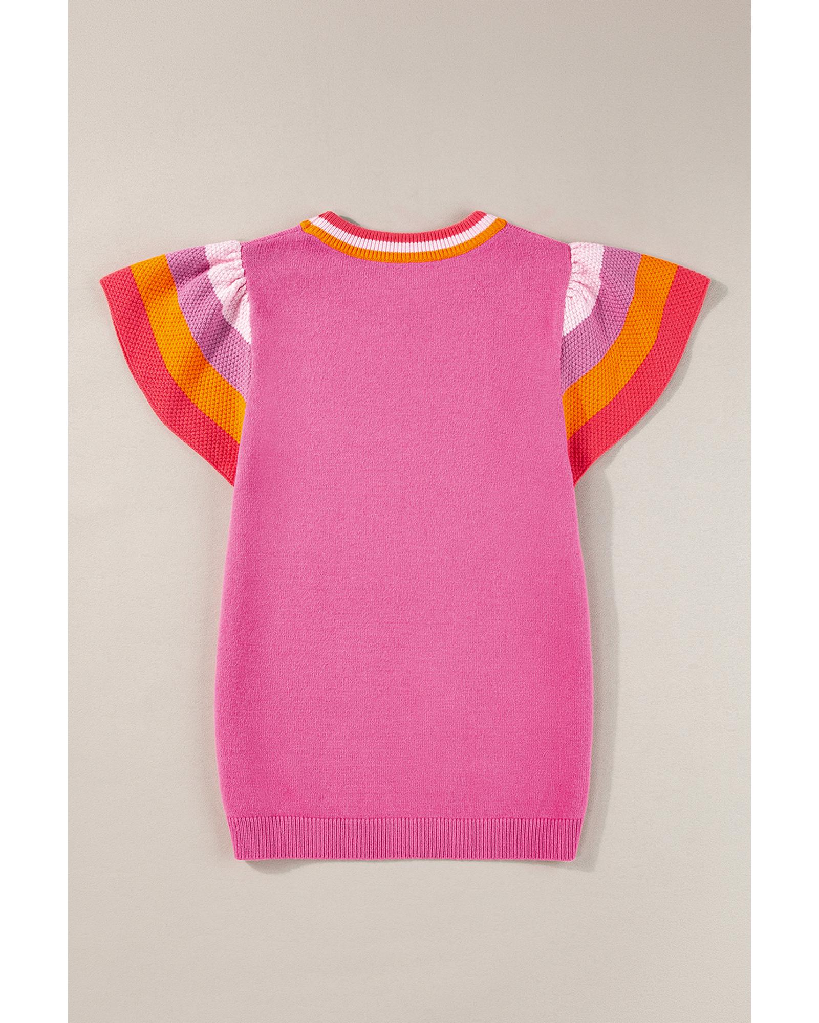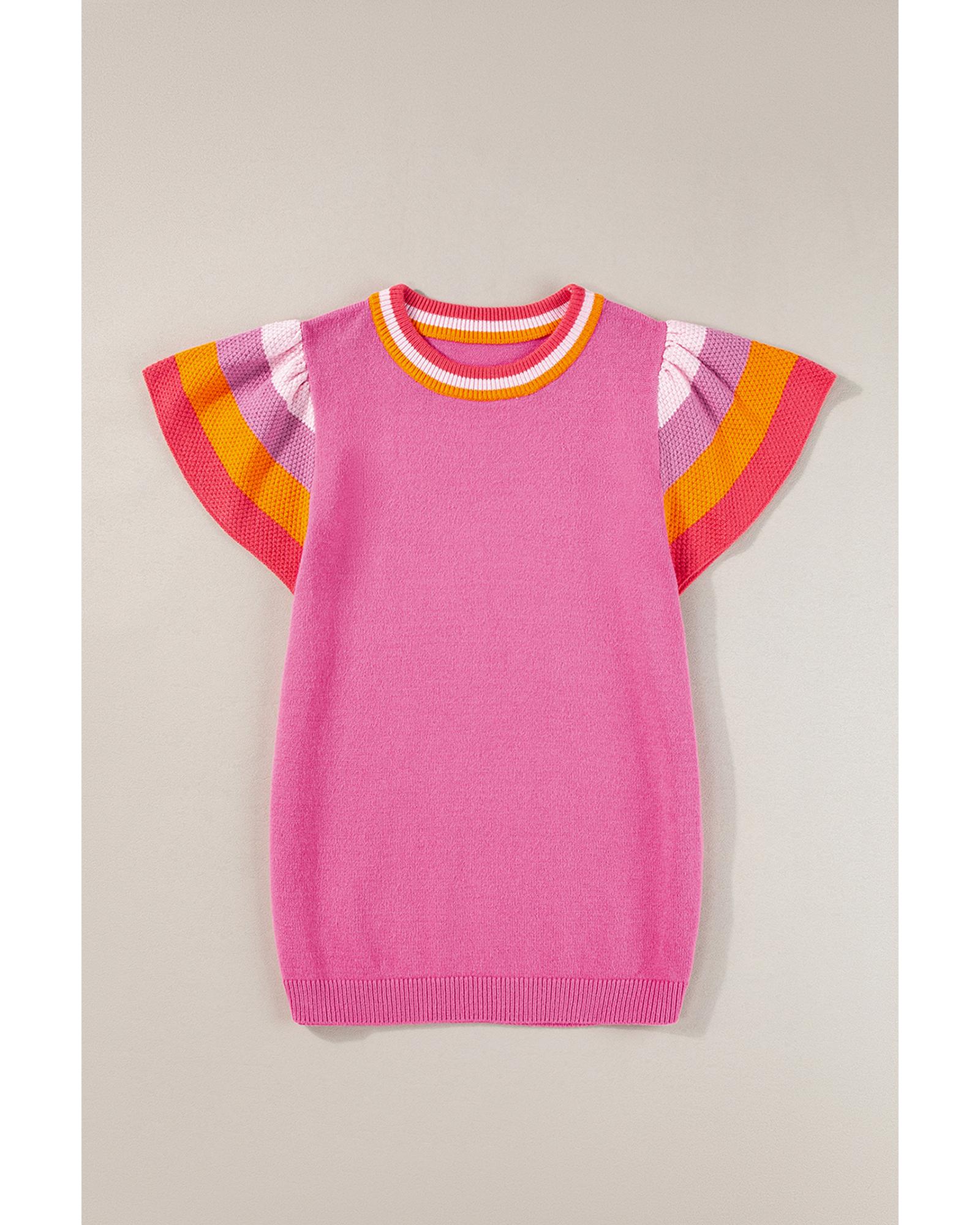 Bright Pink Contrast Flutter Sleeves Knitted Sweater T Shirt – M