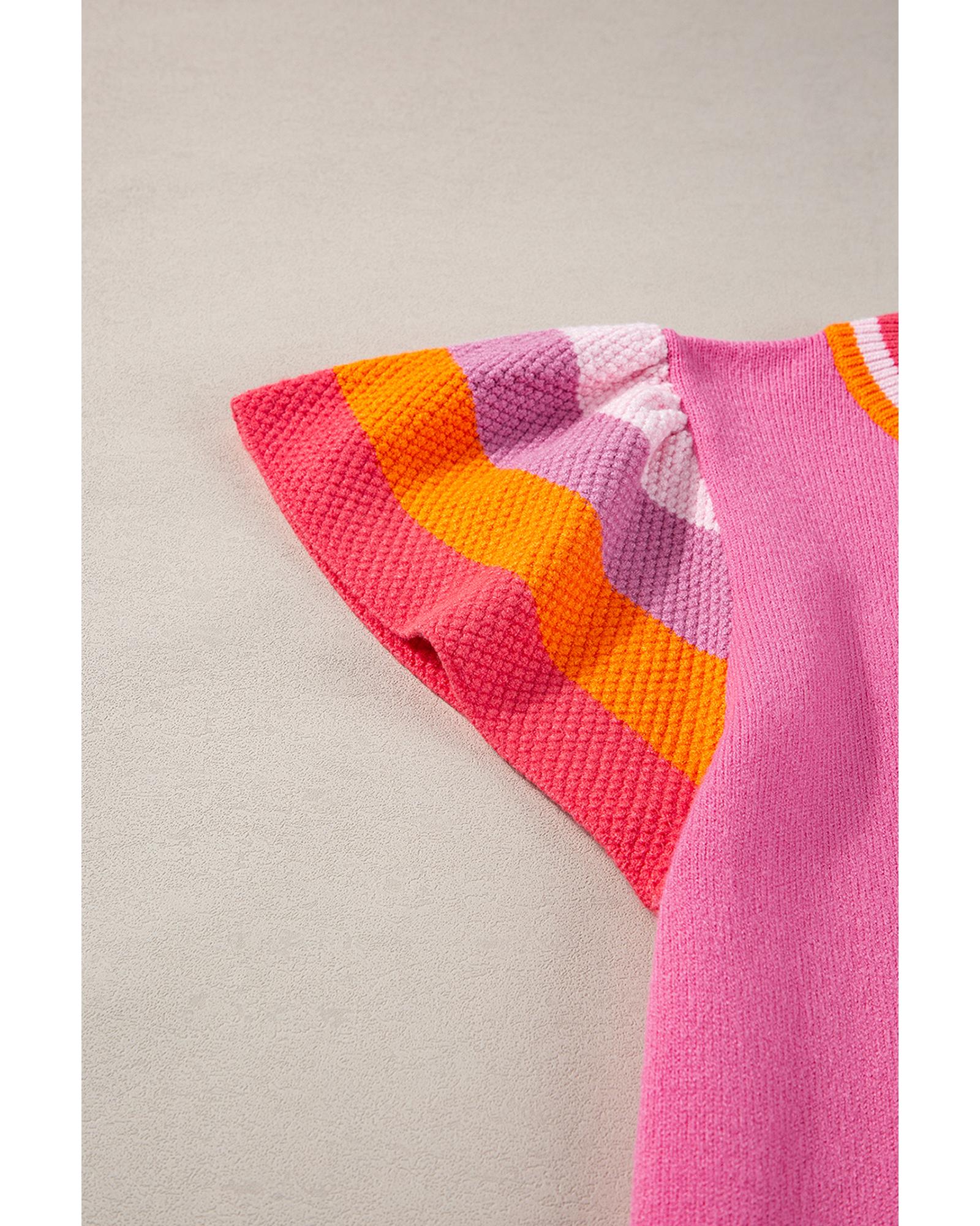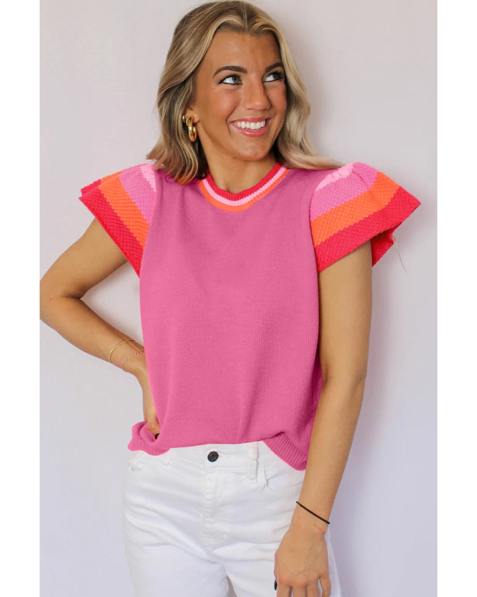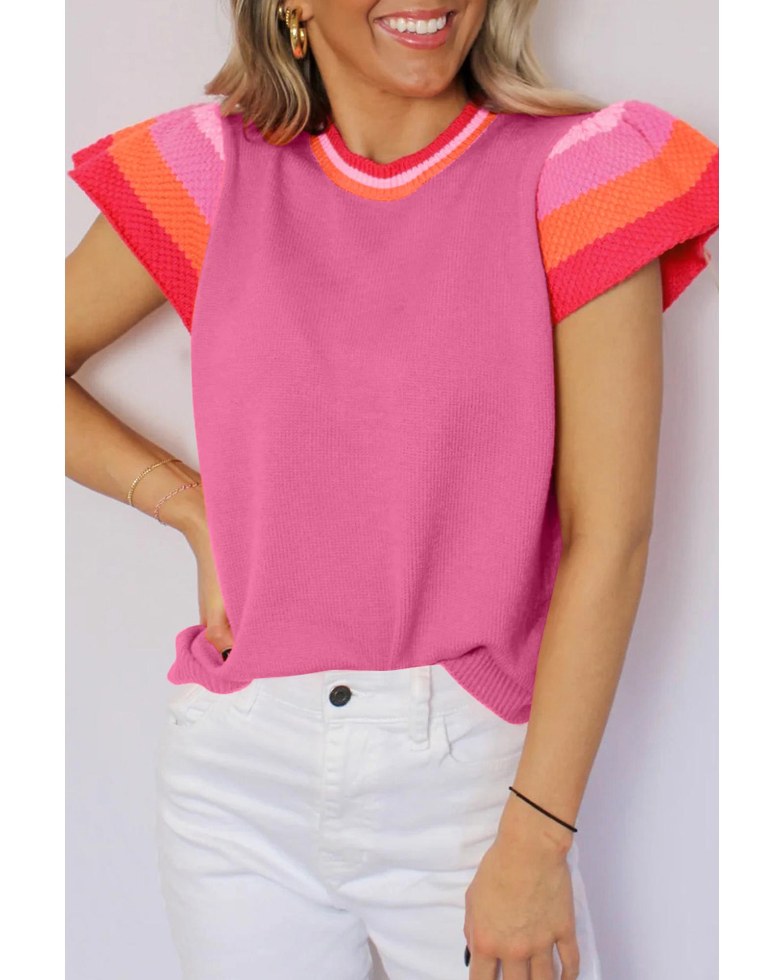 Bright Pink Contrast Flutter Sleeves Knitted Sweater T Shirt – M