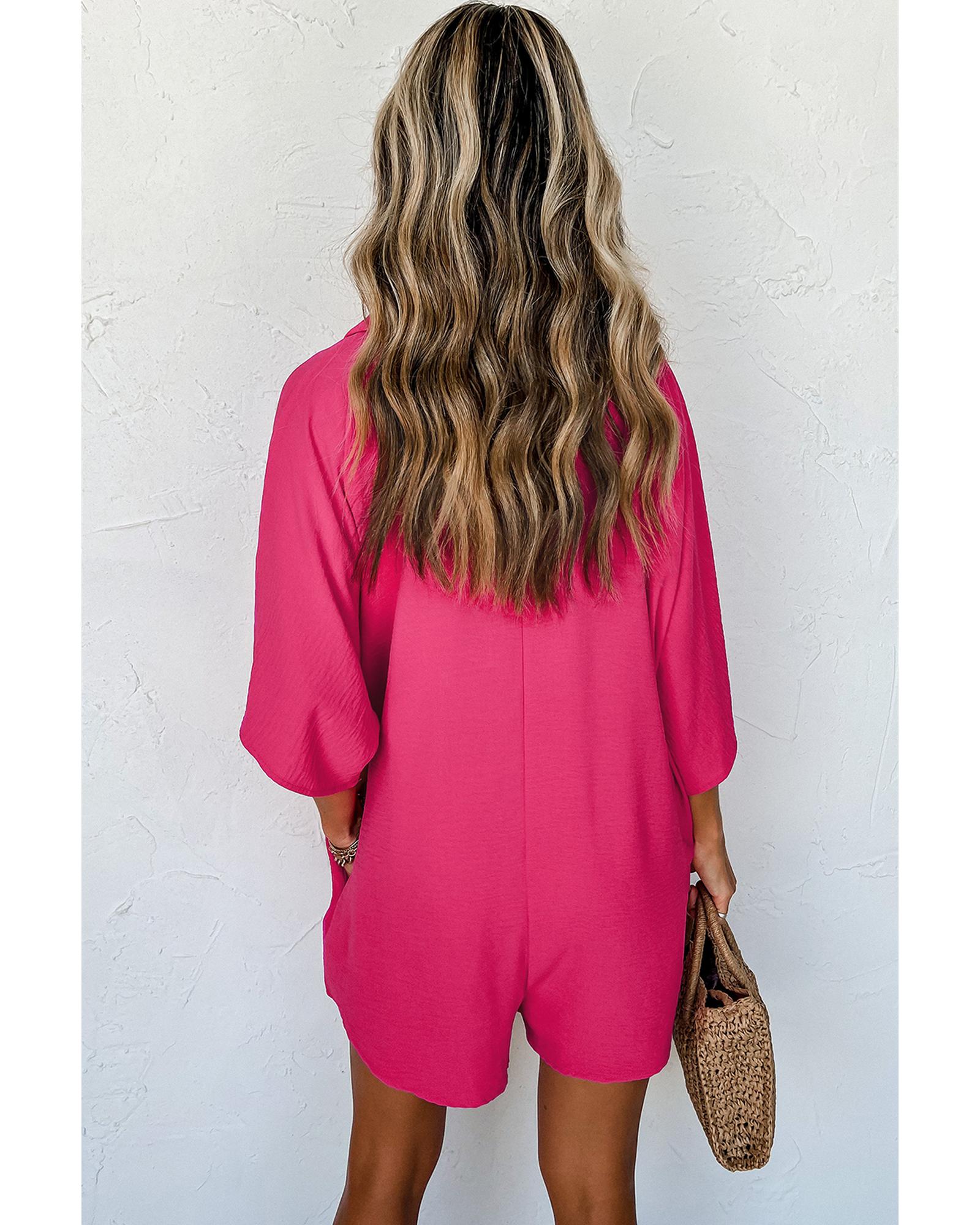 Bright pink half - button collared loose romper Solid color casual wear for women Button closures turn
