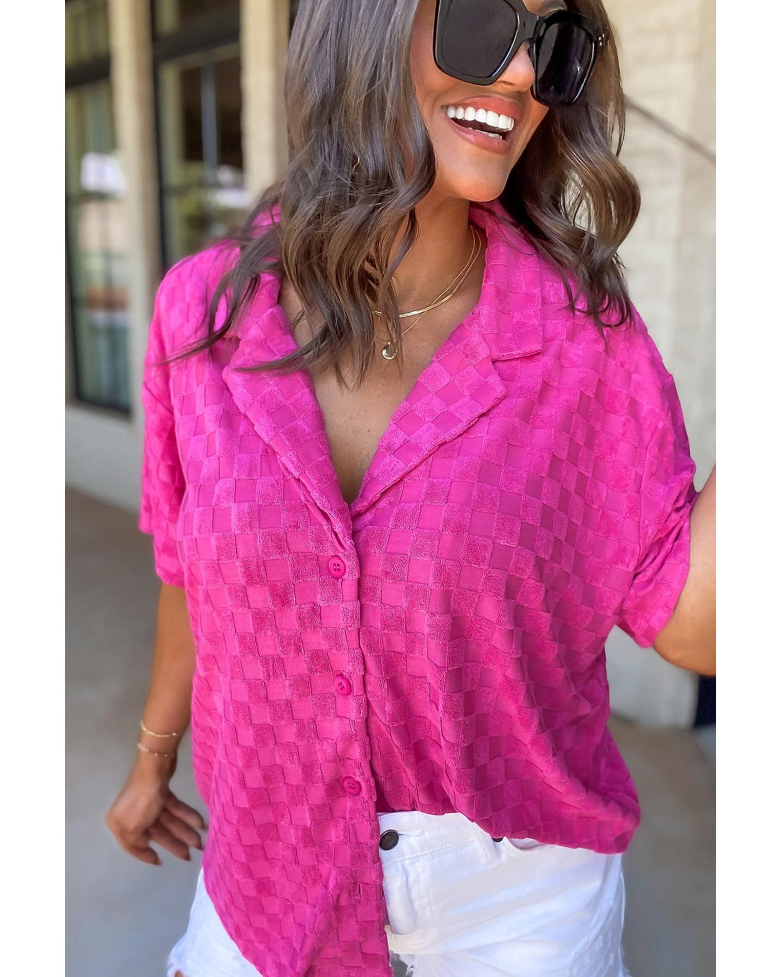 - Bright Pink Lapel Neck Checkered Textured Short Sleeve Shirt