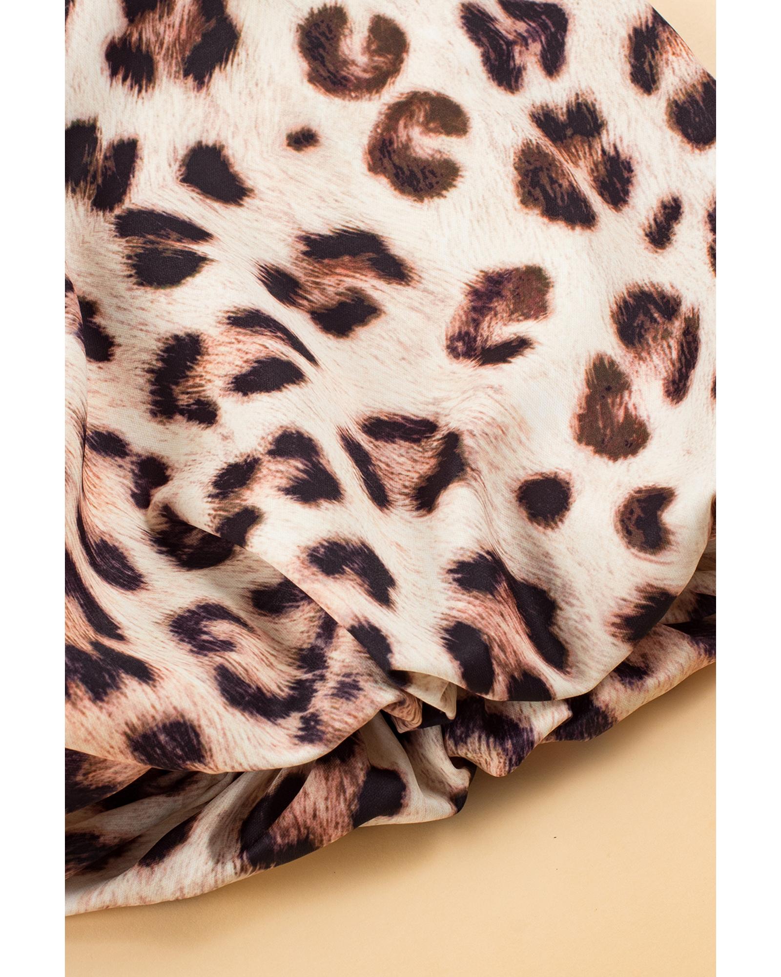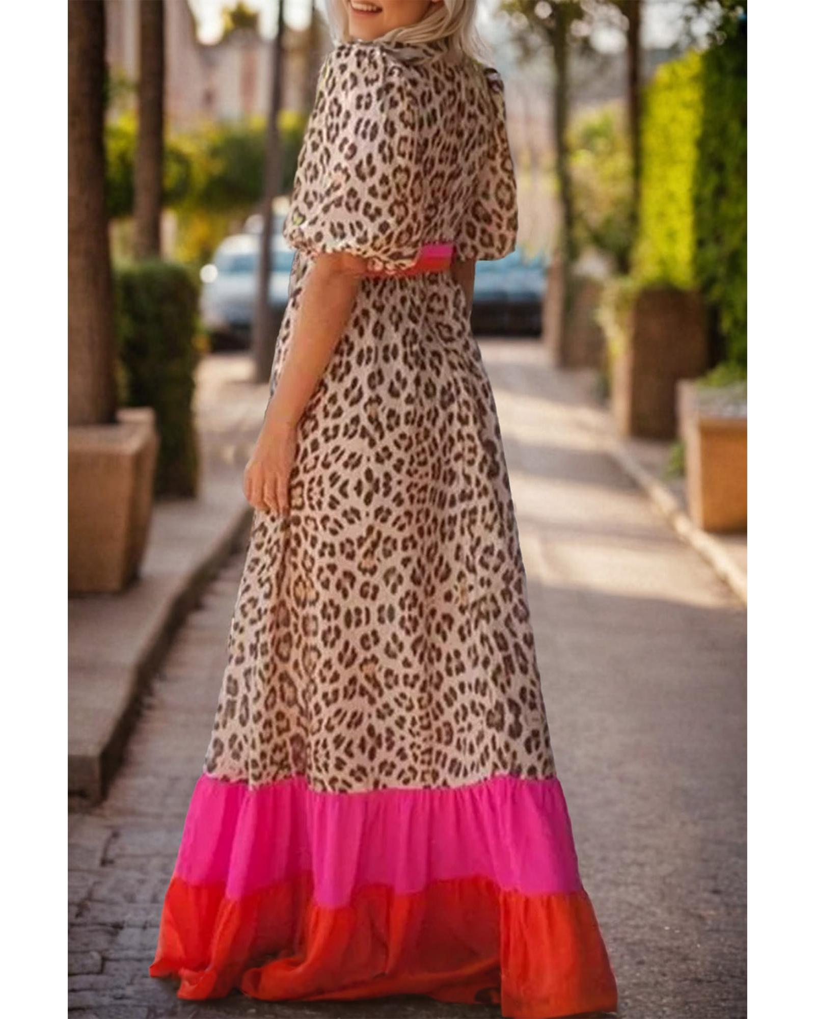 Bright Pink Leopard Colorblock Patchwork Bubble Sleeve Maxi Dress – M