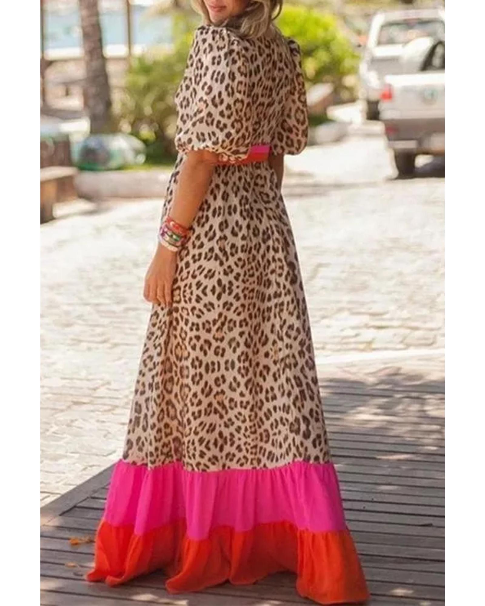 Bright Pink Leopard Colorblock Patchwork Bubble Sleeve Maxi Dress – S