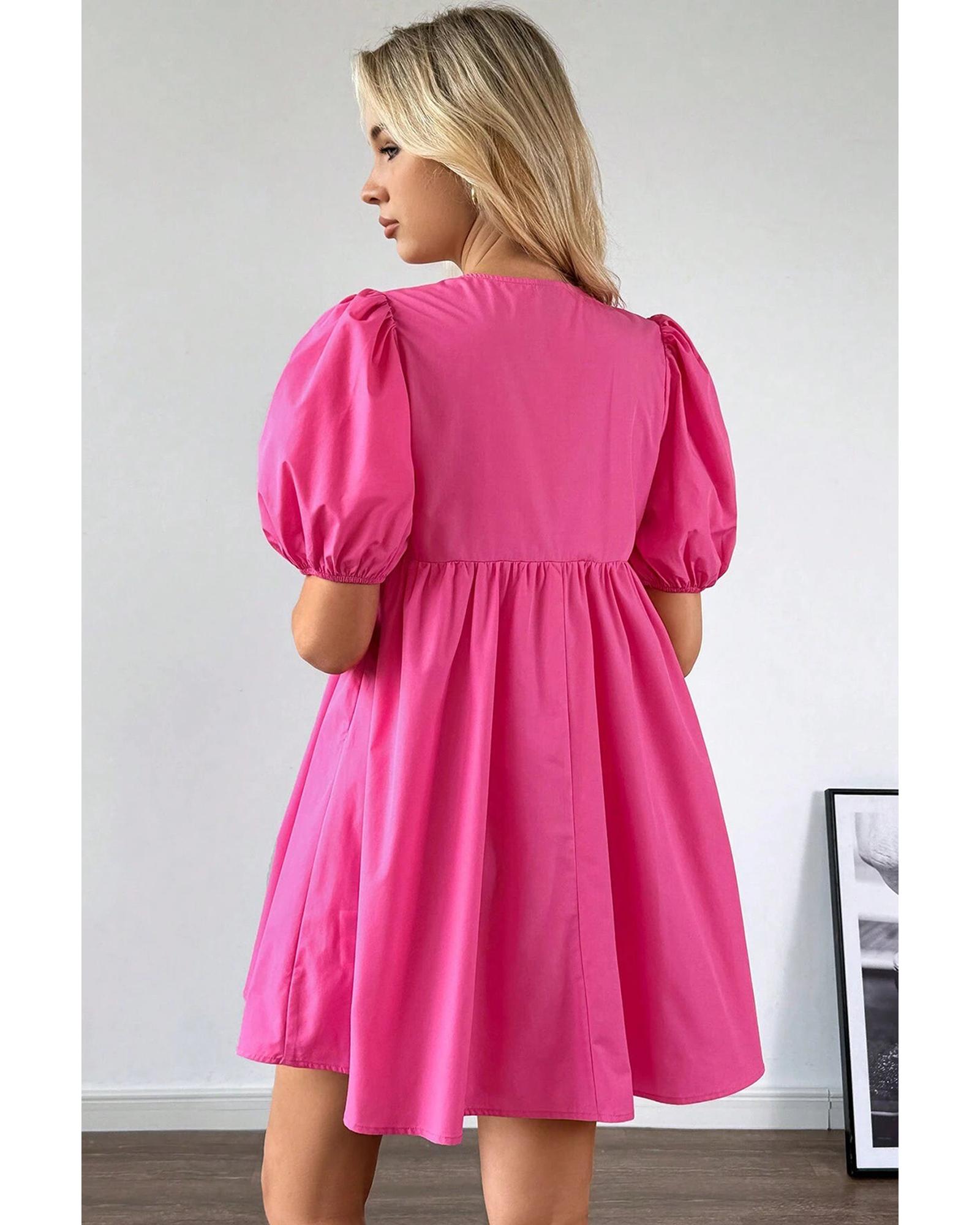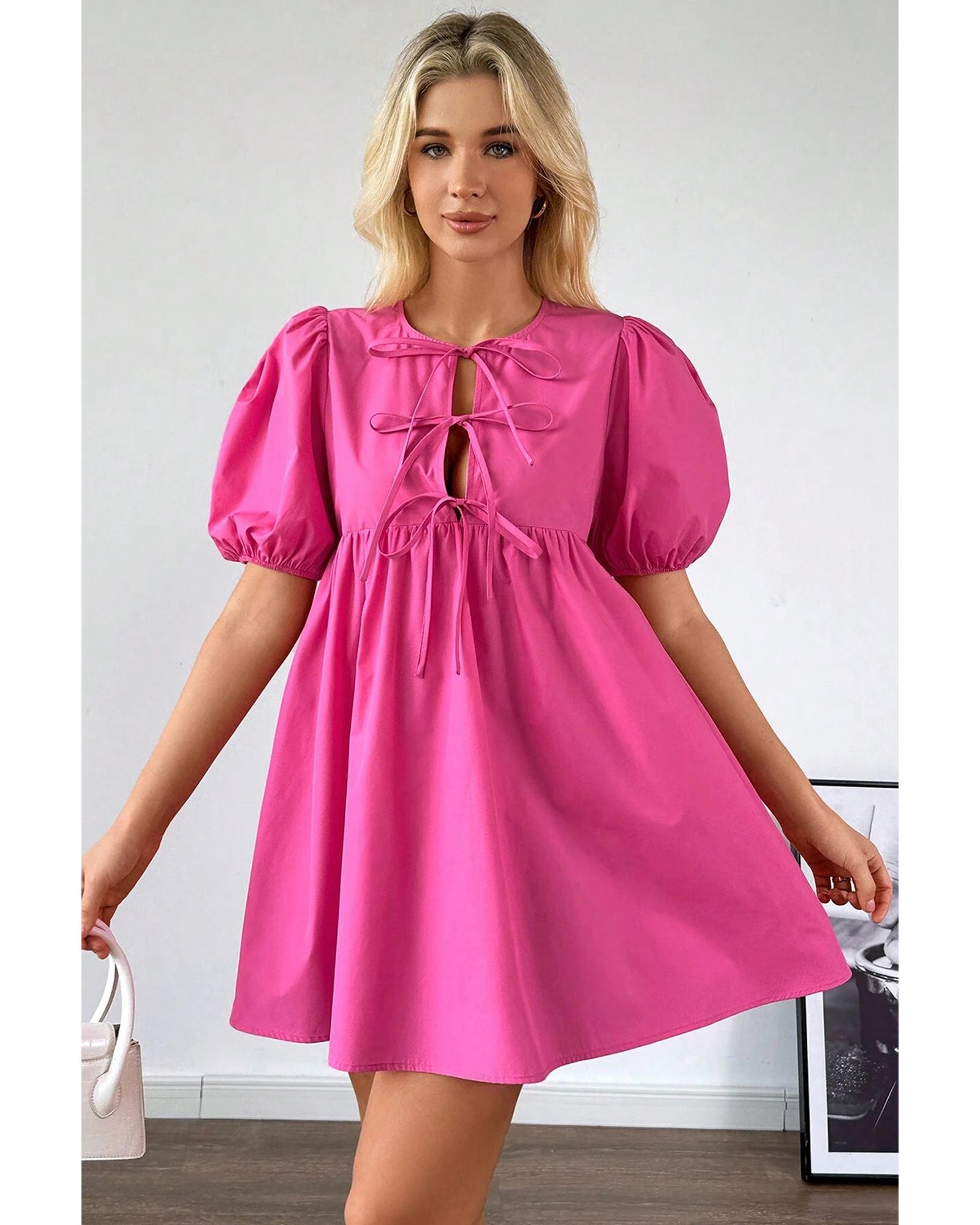 Bright Pink Solid Color Puff Sleeve Tie Front High Waist Mini Dress – L
