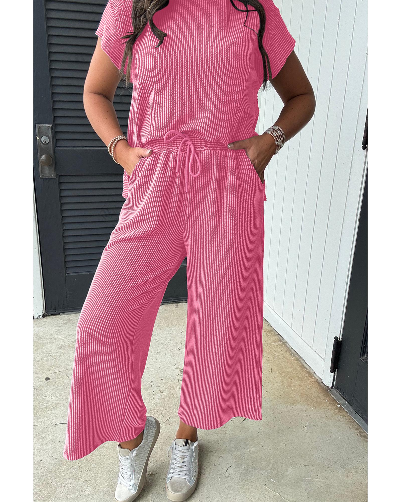 Bright Pink Solid Corded Knit Short Sleeve T Shirt and Wide Leg Pants Set – M