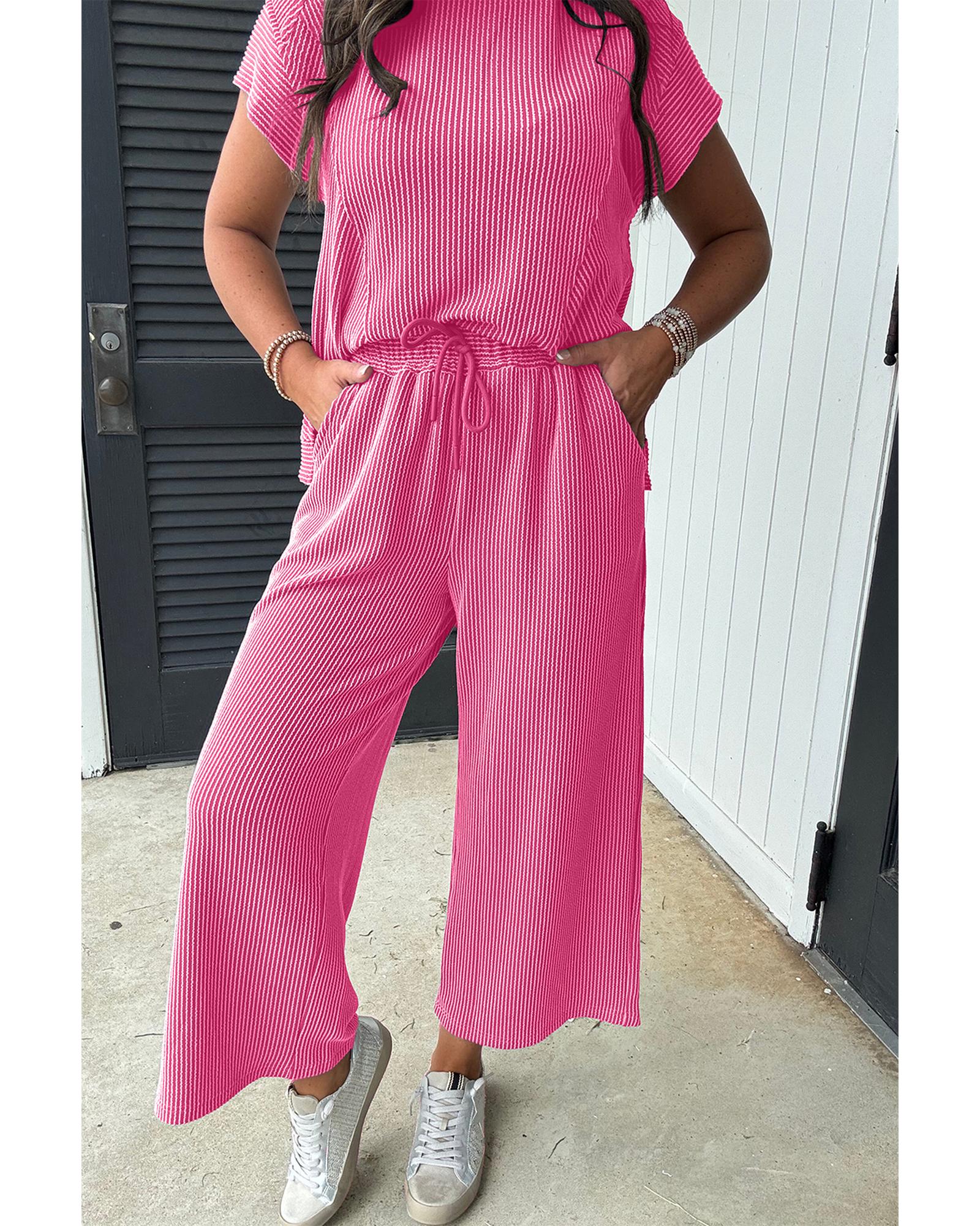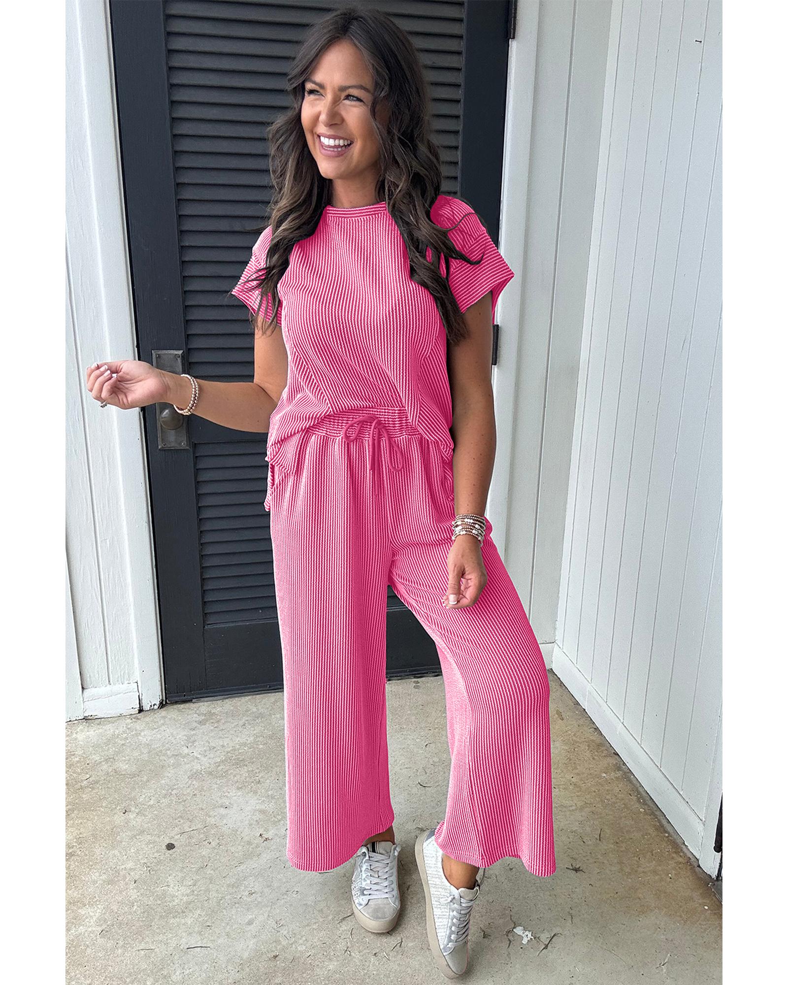 Bright Pink Solid Corded Knit Short Sleeve T Shirt and Wide Leg Pants Set – XL
