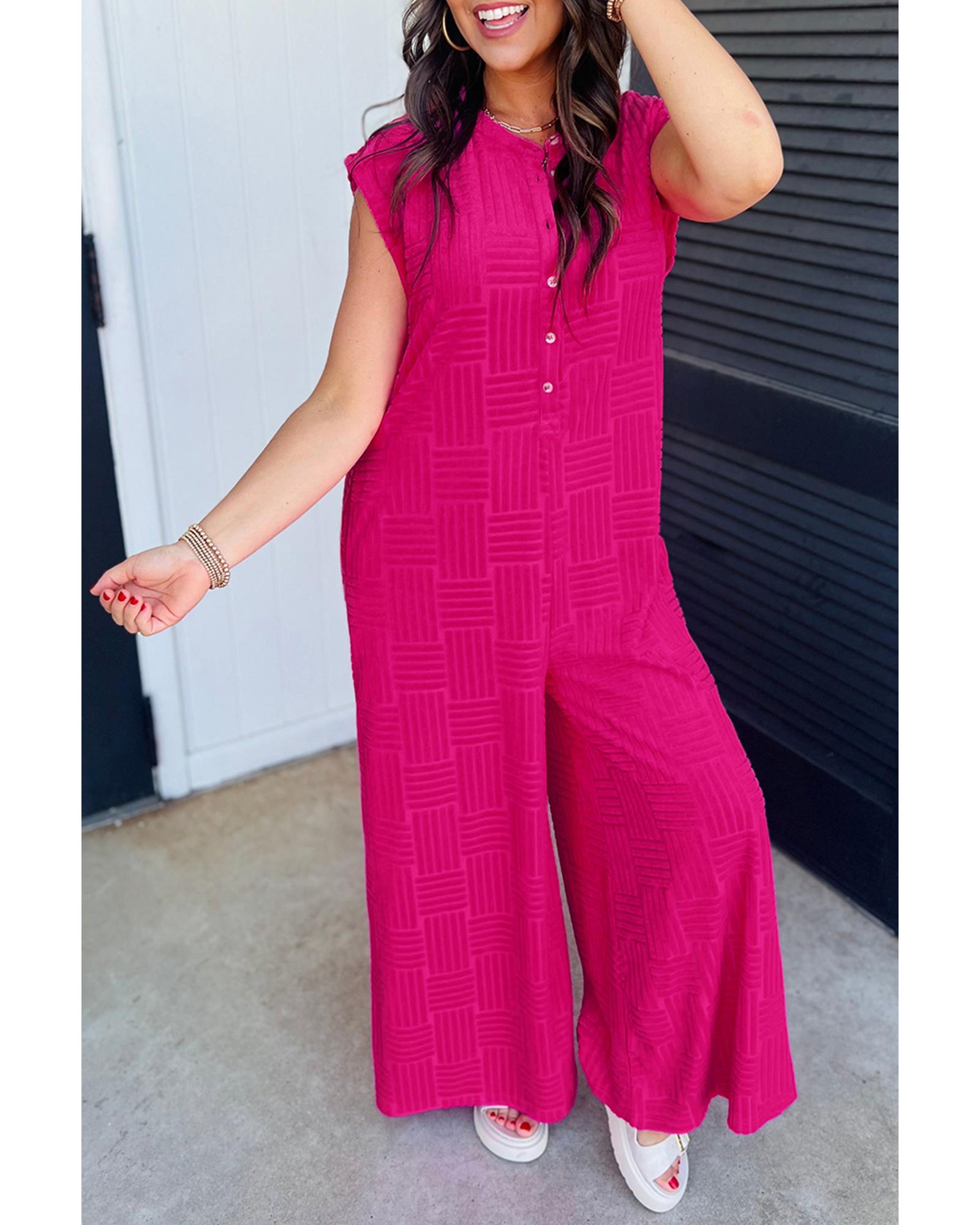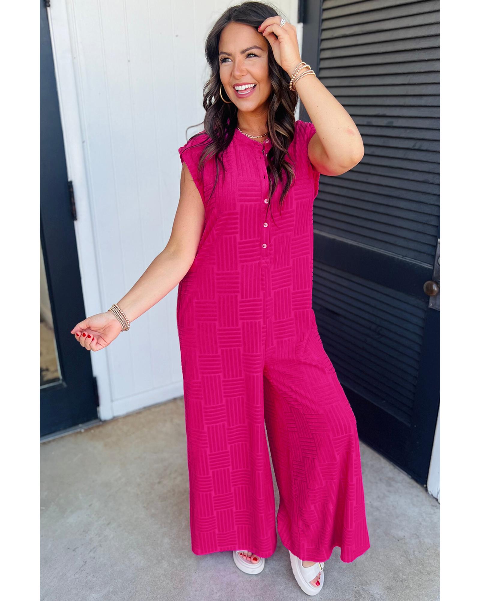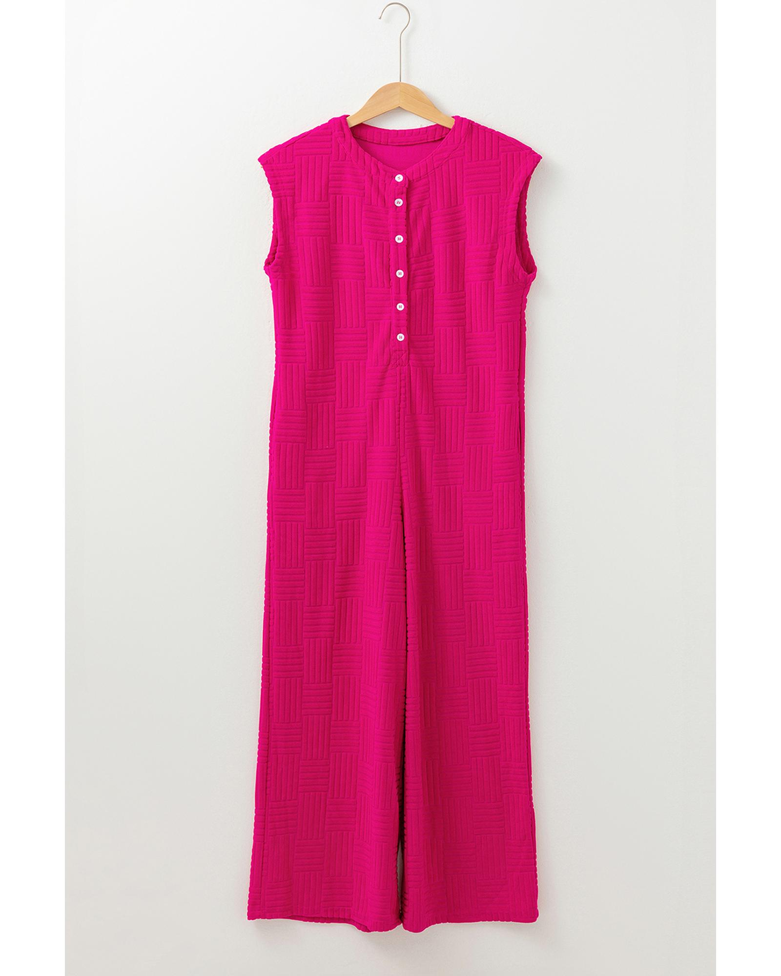 Bright Pink Terry Textured Sleeveless Button Front Wide Leg Jumpsuit – L