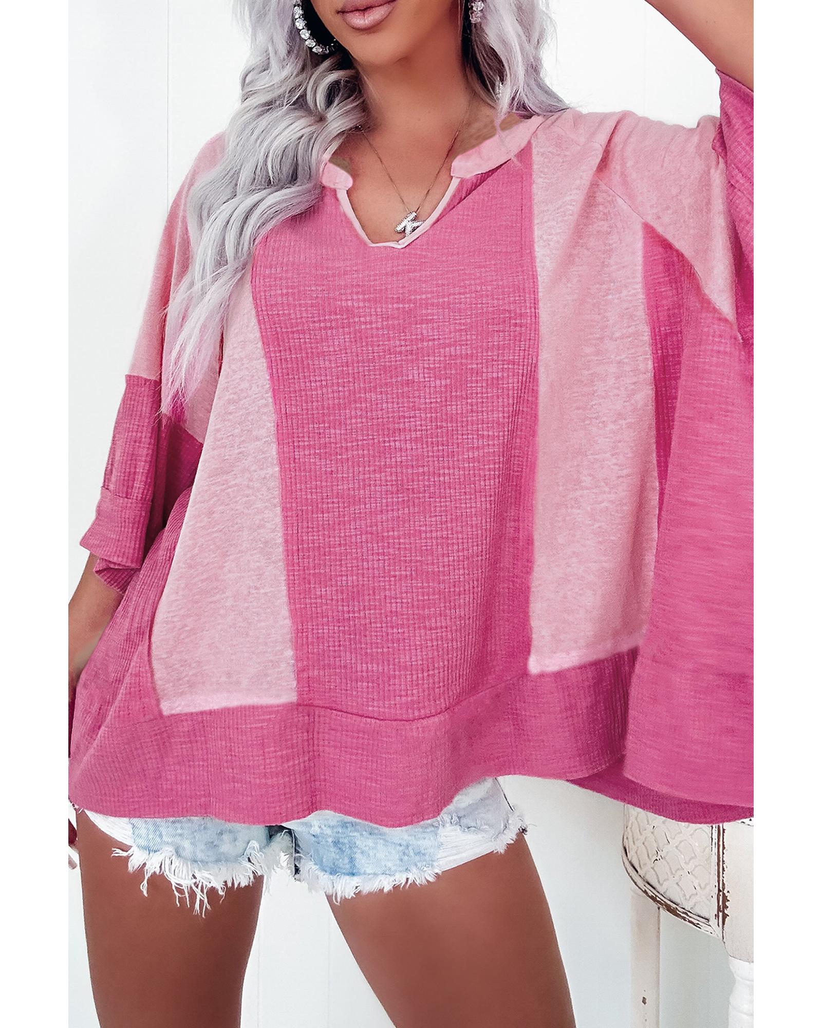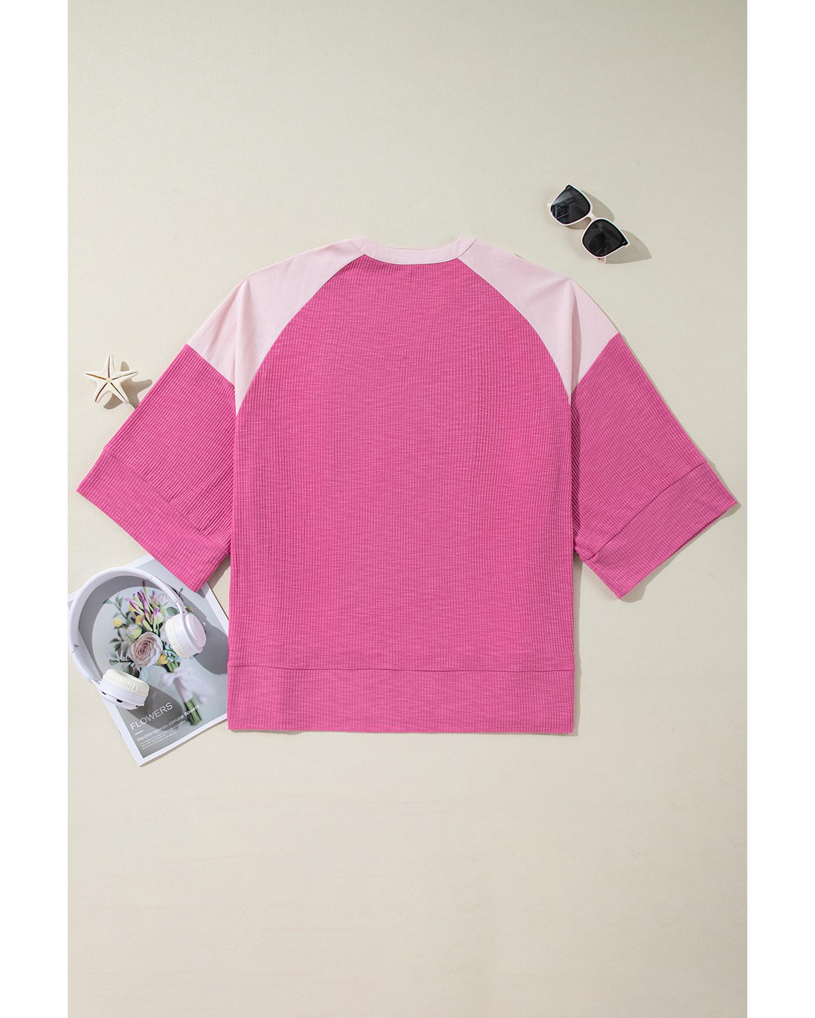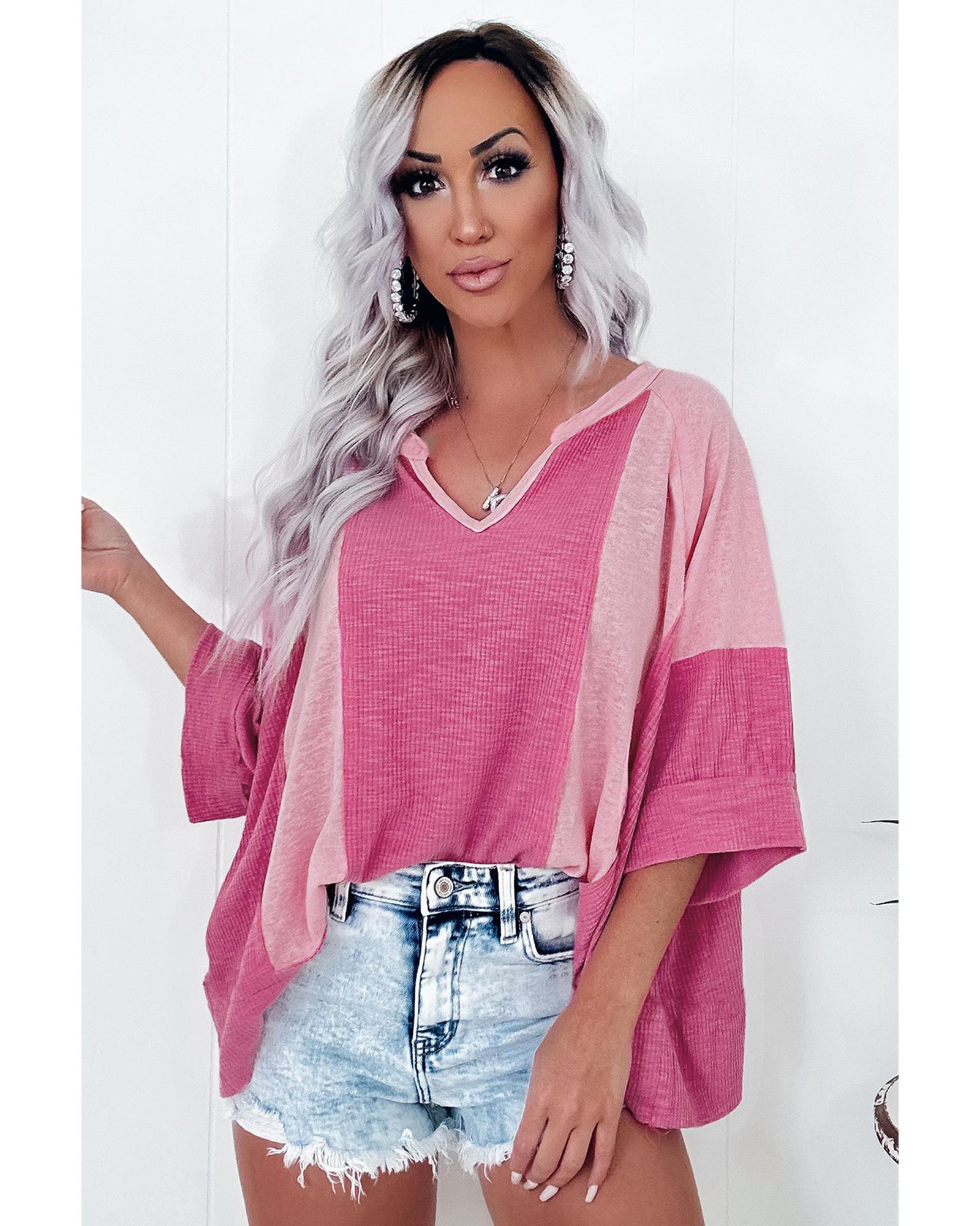 Bright Pink Textured Colorblock 3/4 Sleeve Oversize Top – M
