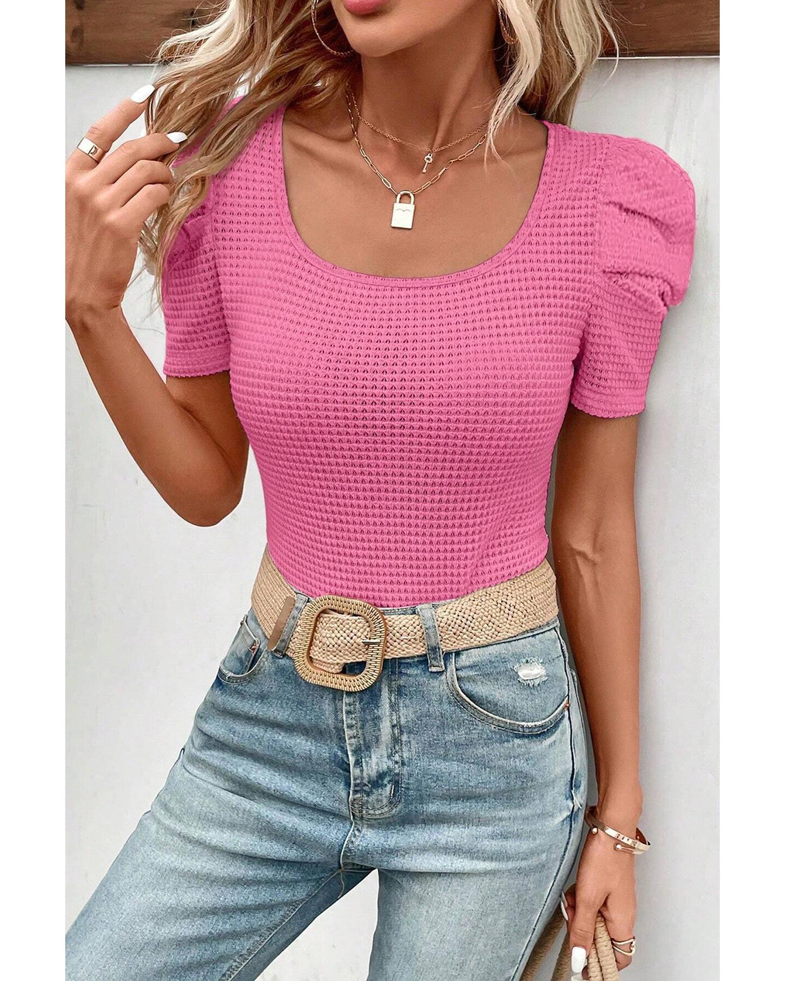 Bright Pink Waffle Knit Ruched Puff Sleeve Top – L