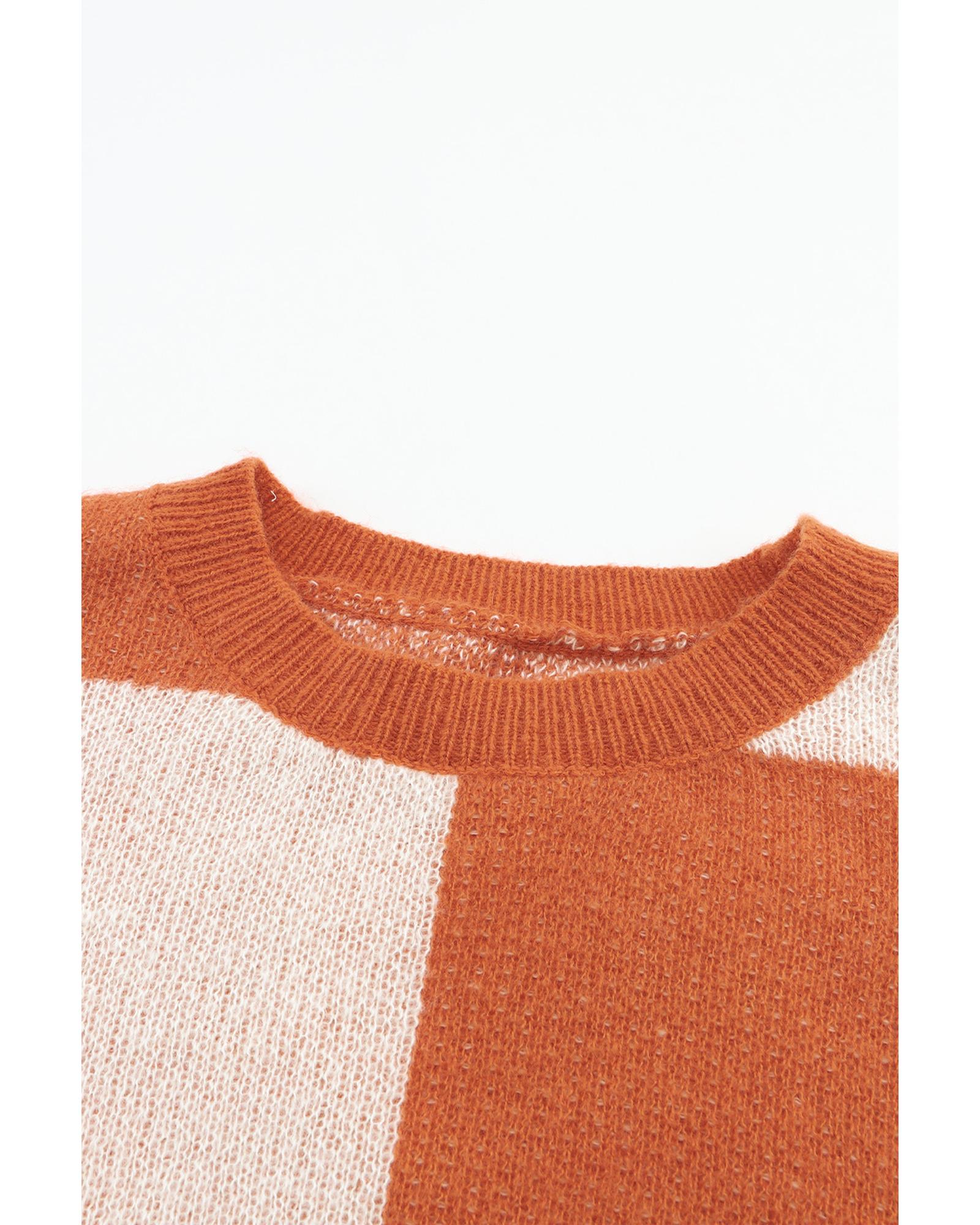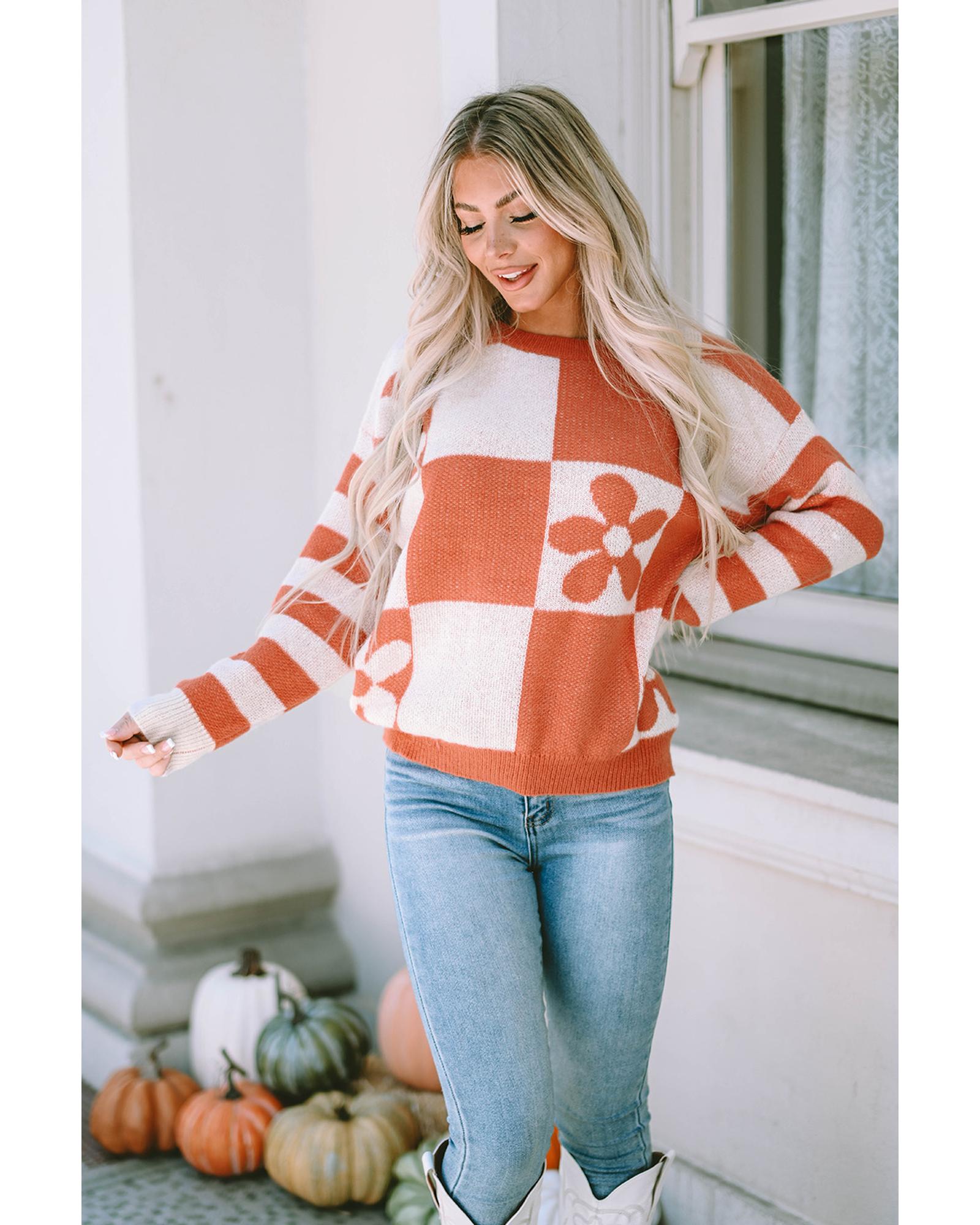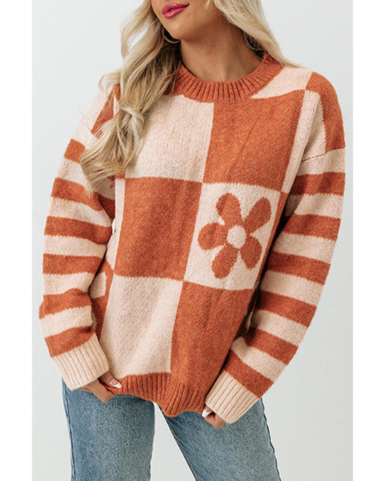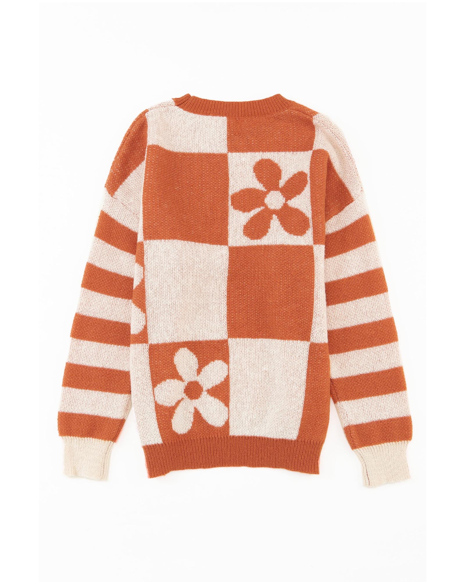 Brown Checkered Floral Print Striped Sleeve Sweater – M
