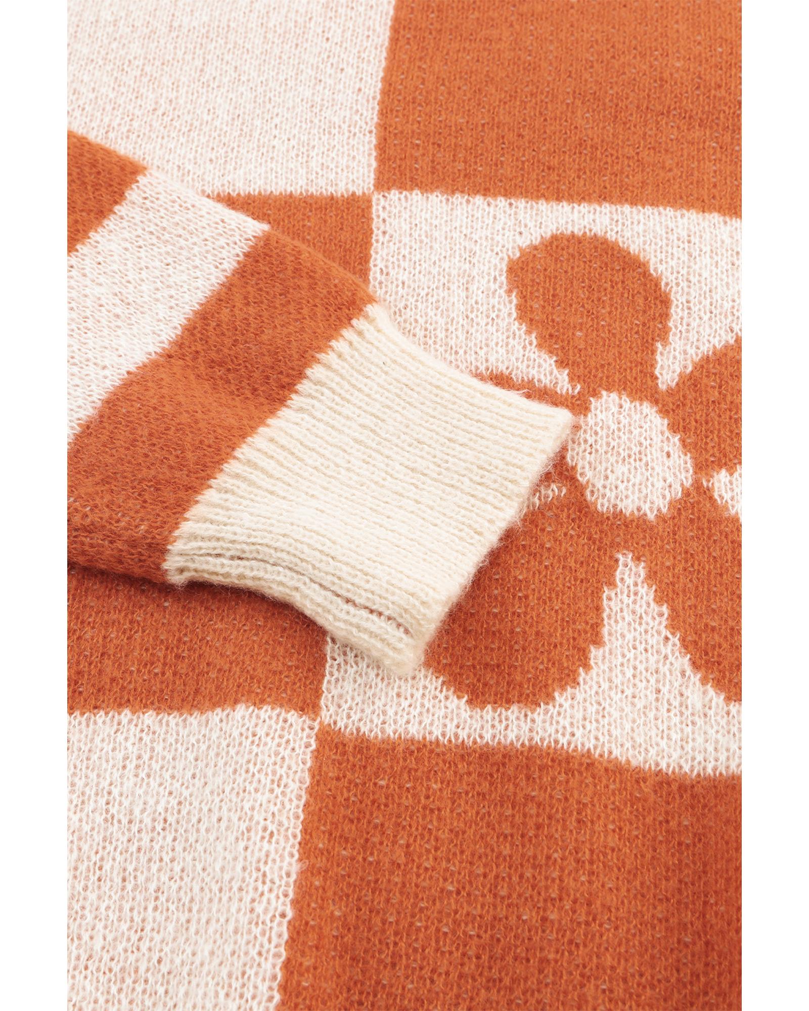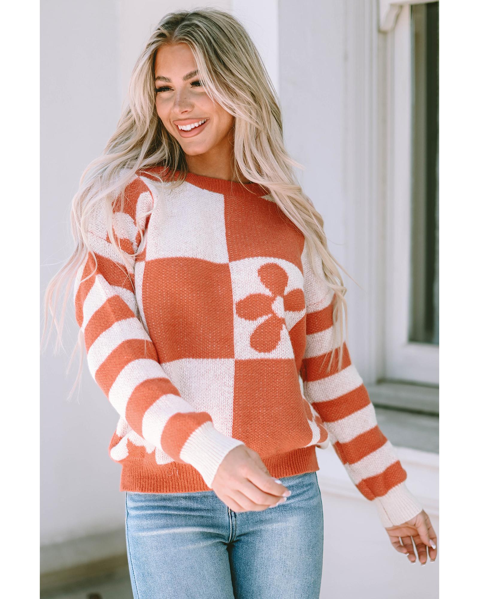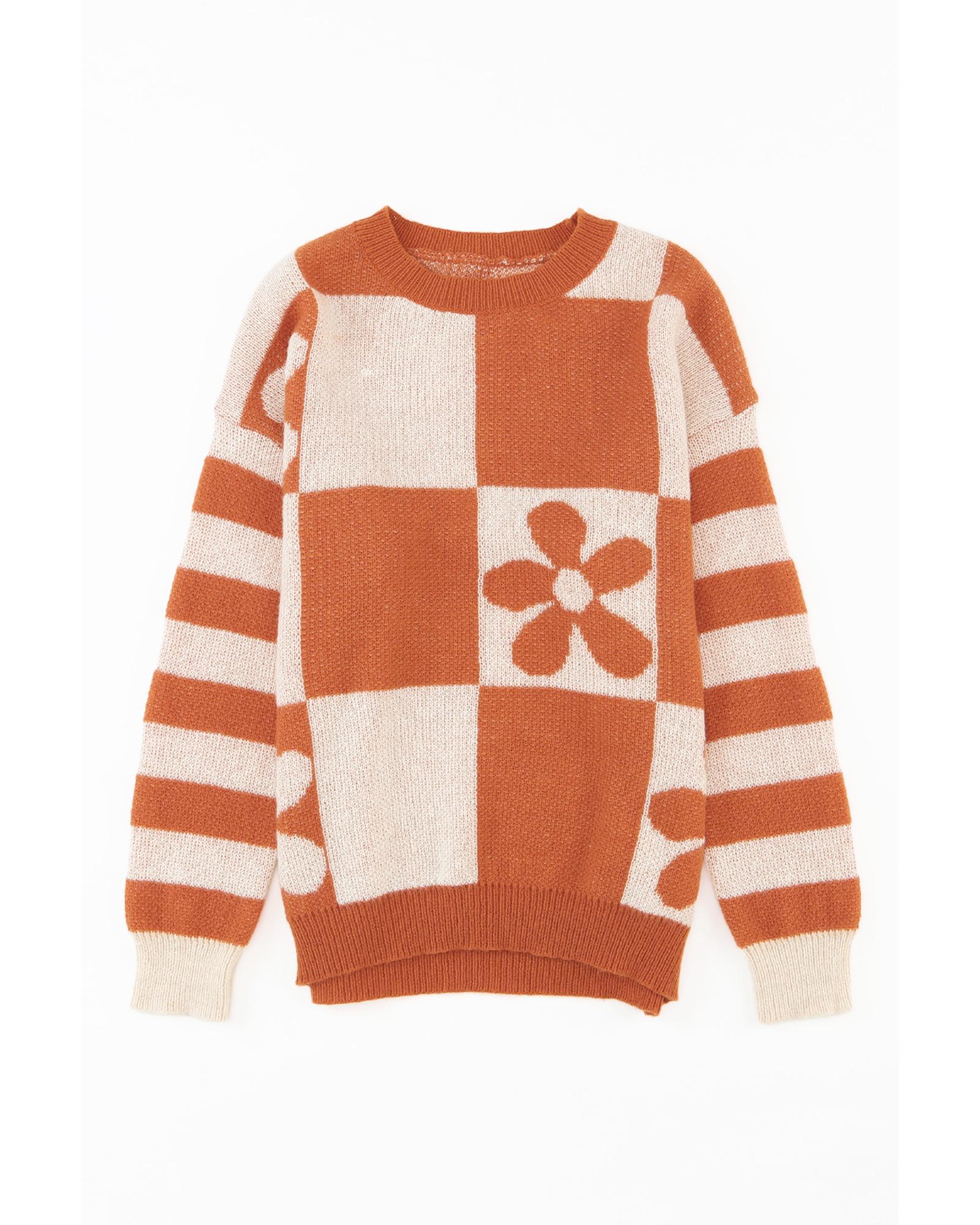 Brown Checkered Floral Print Striped Sleeve Sweater – XL