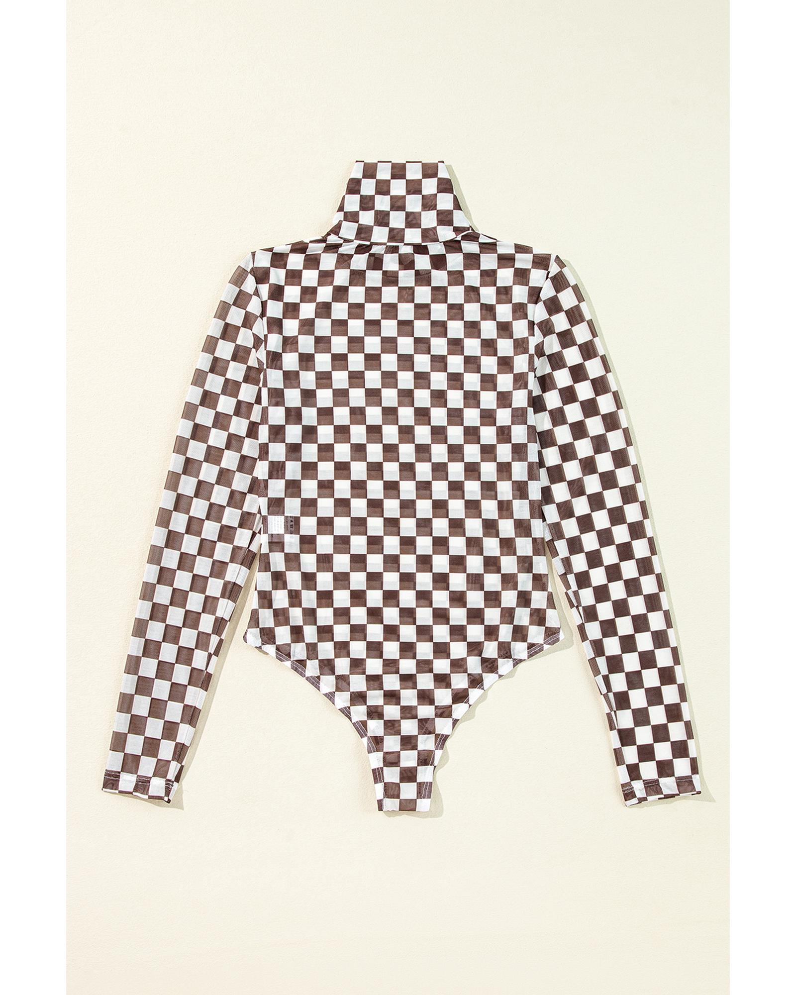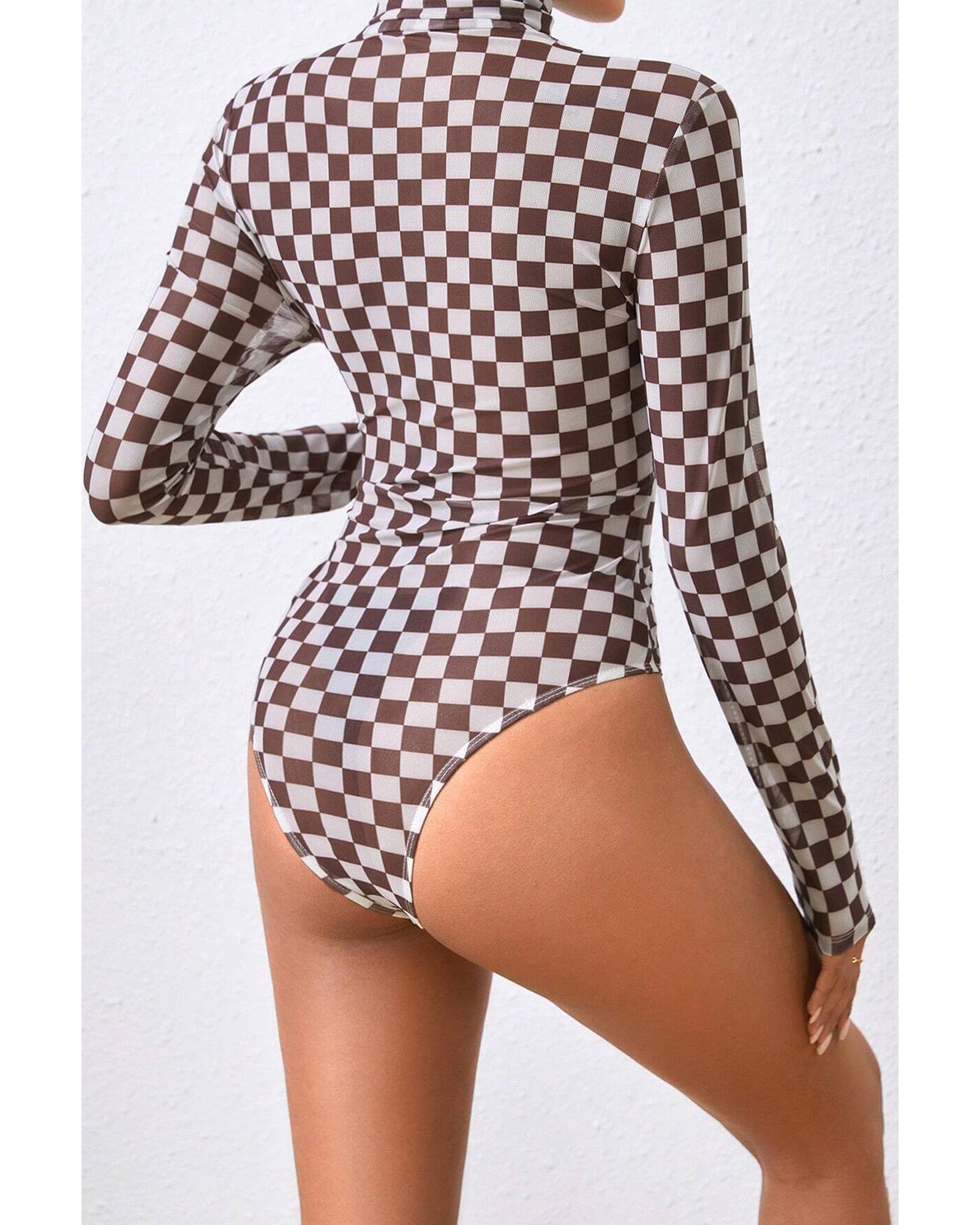Brown Checkered Printed Long Sleeve High Neck Bodysuit – L