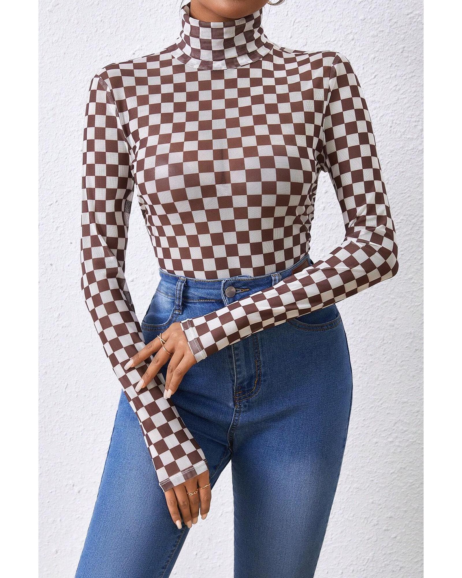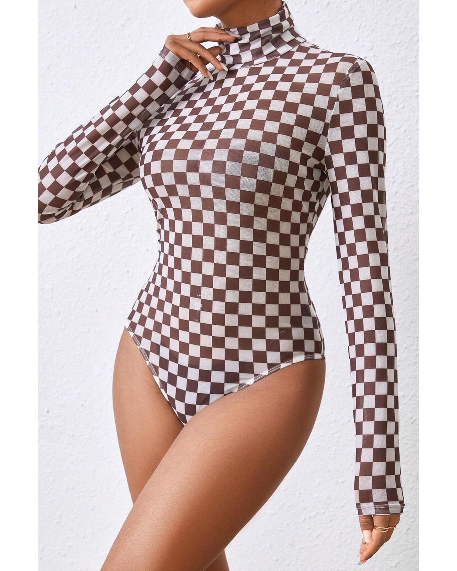 Brown Checkered Printed Long Sleeve High Neck Bodysuit – XL