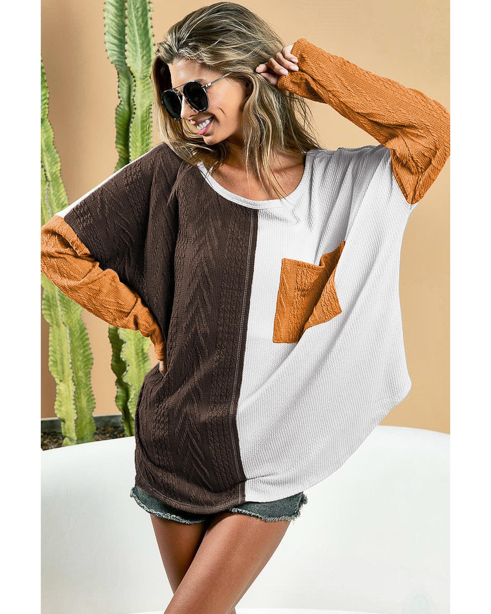 Brown Color Block Patchwork Chest Pocket Long Sleeve Top – XL