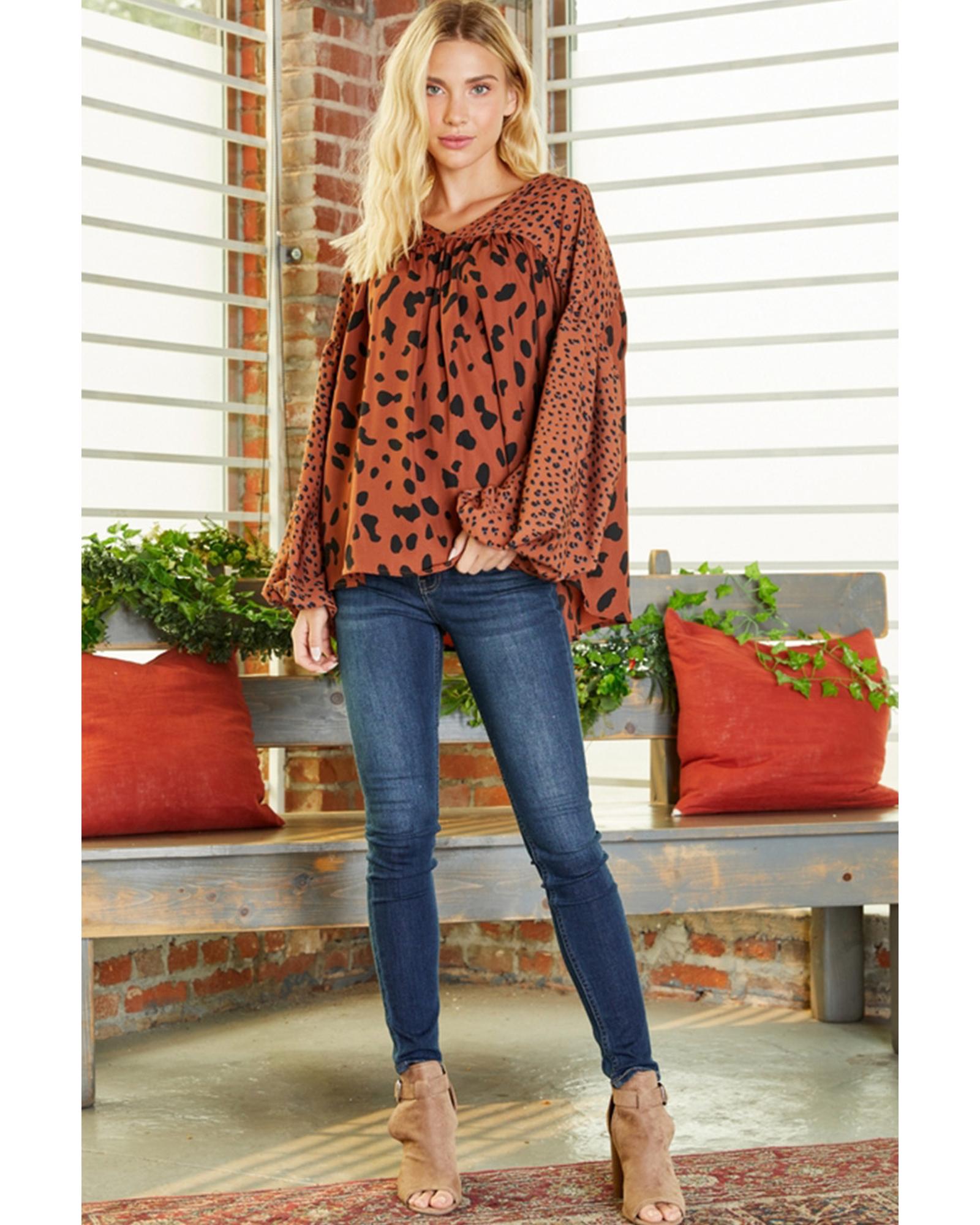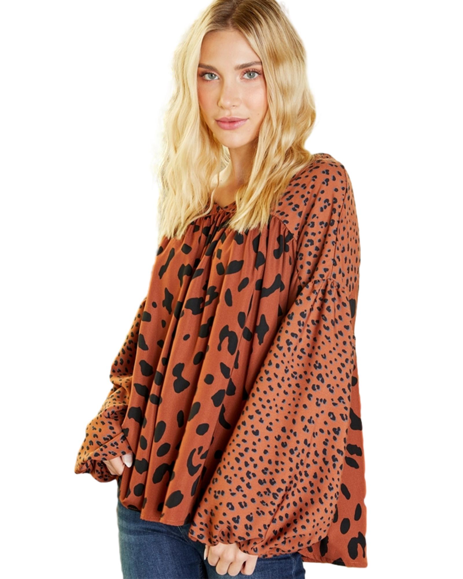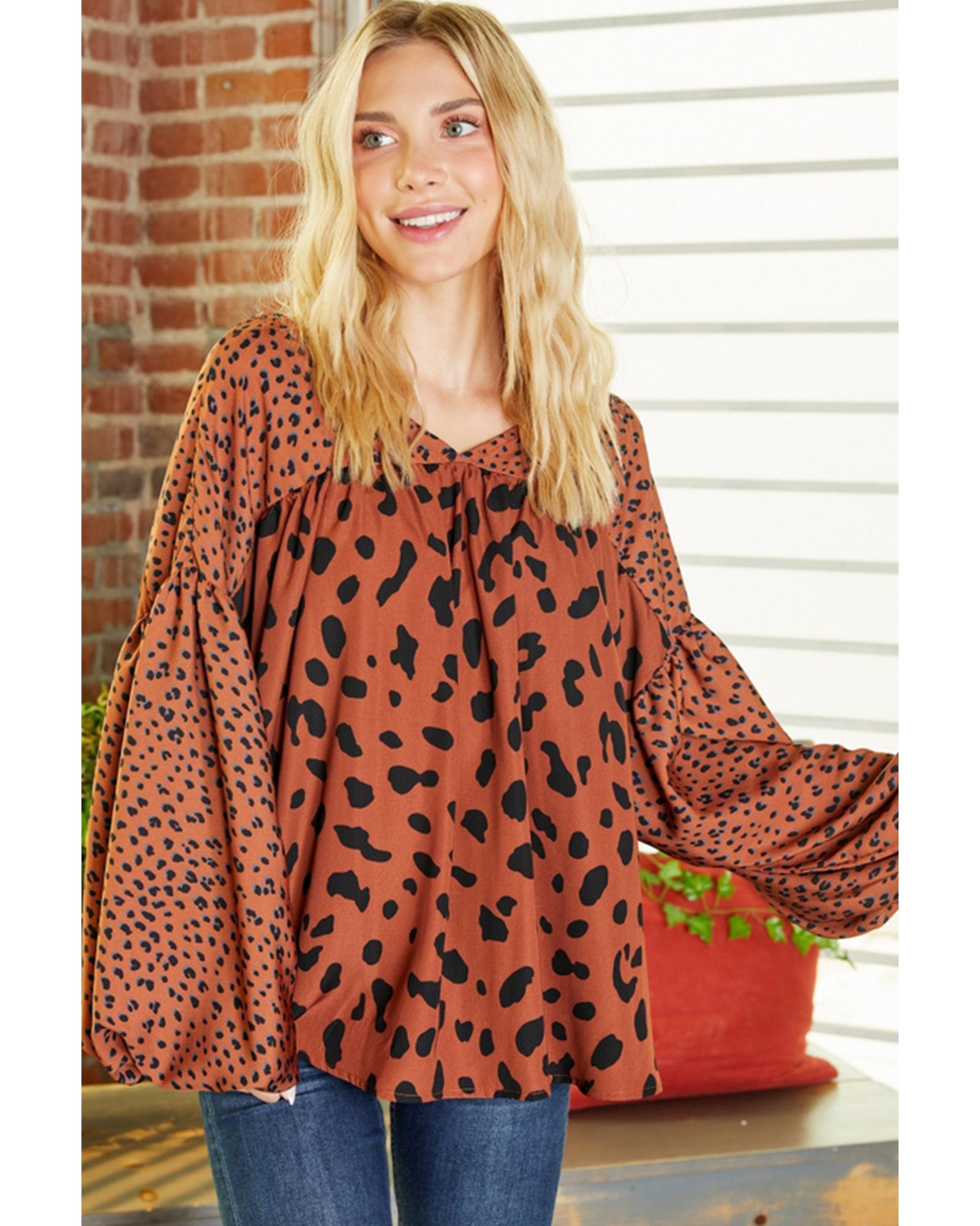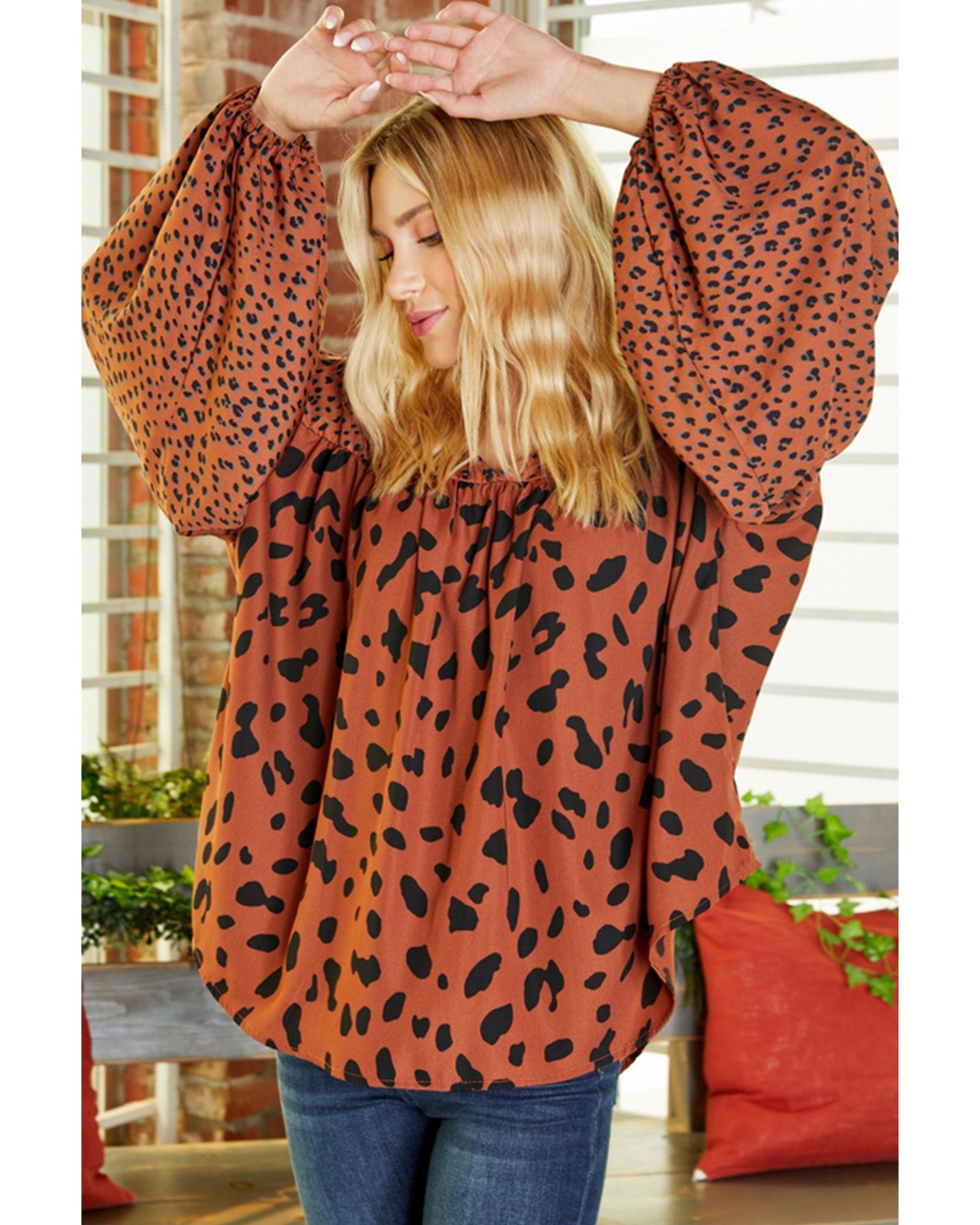 - Brown Contrast Leopard Print Bubble Sleeve Blouse
