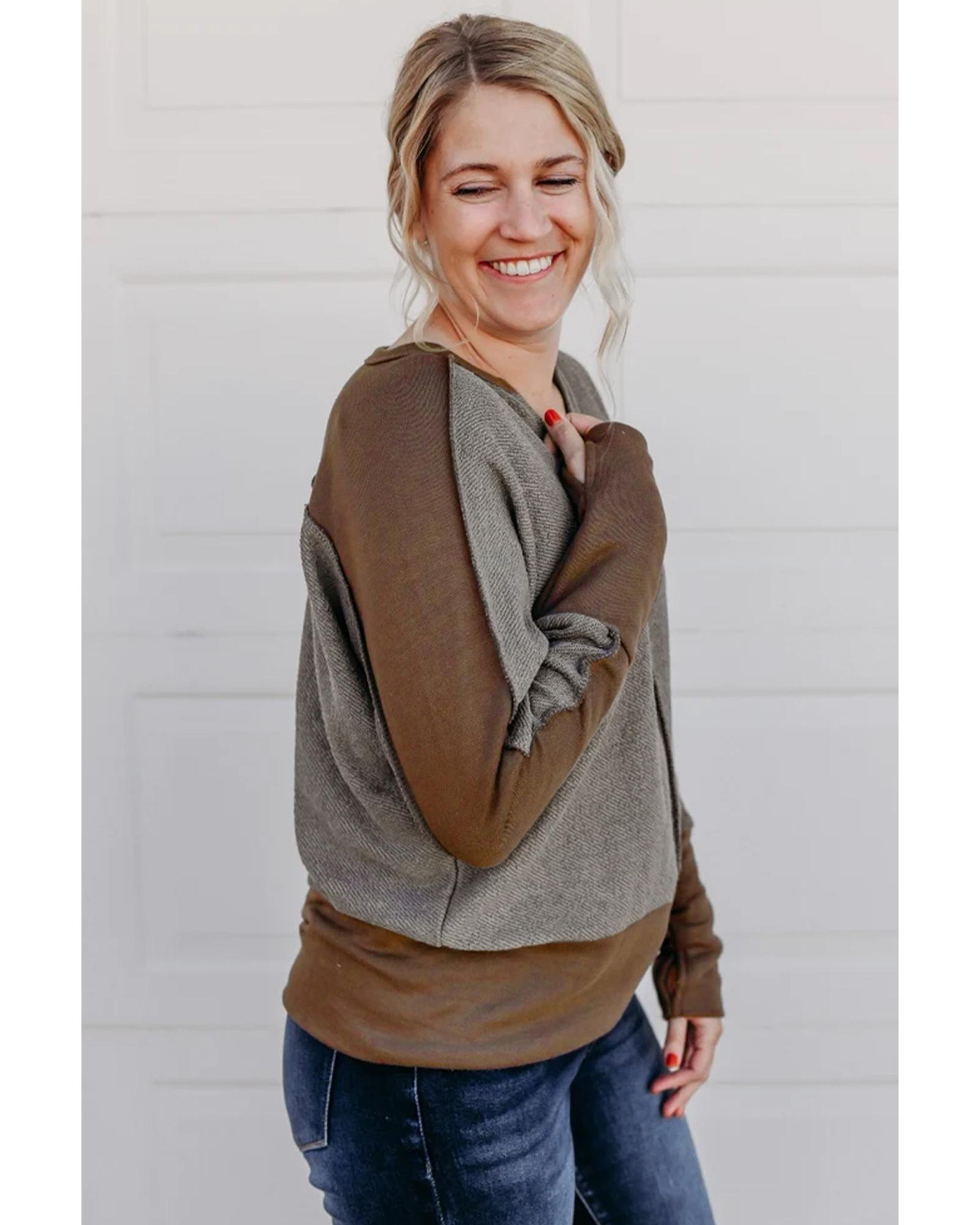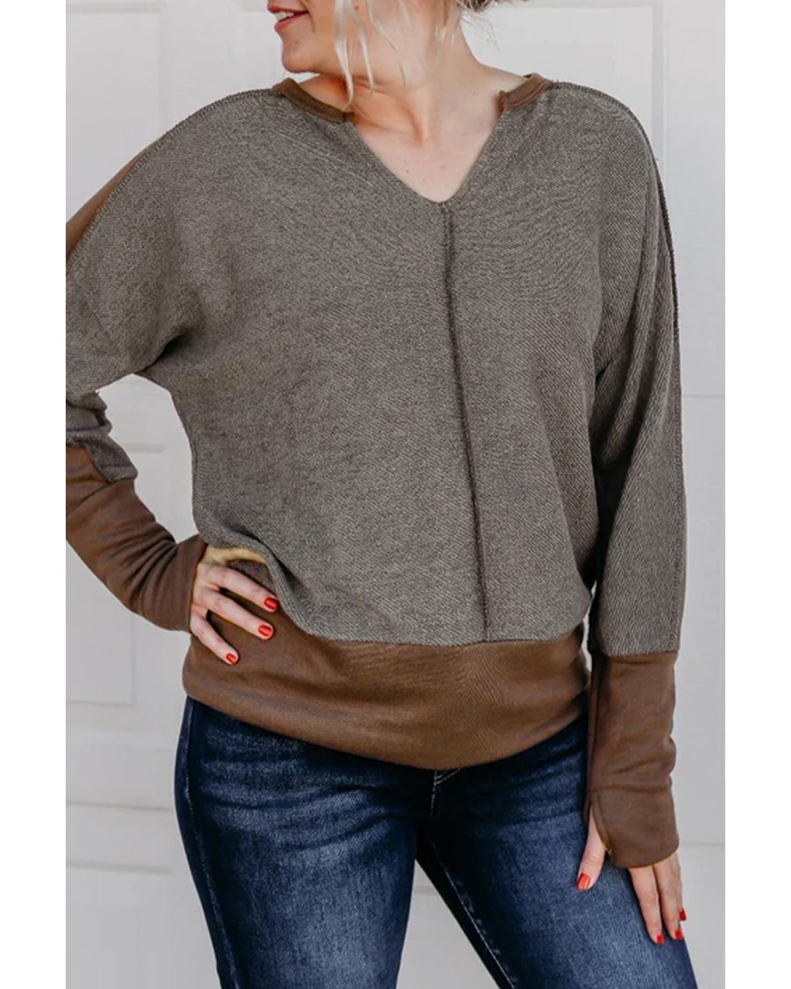 Brown Contrast Patchwork Thumbhole Sleeve Top – M