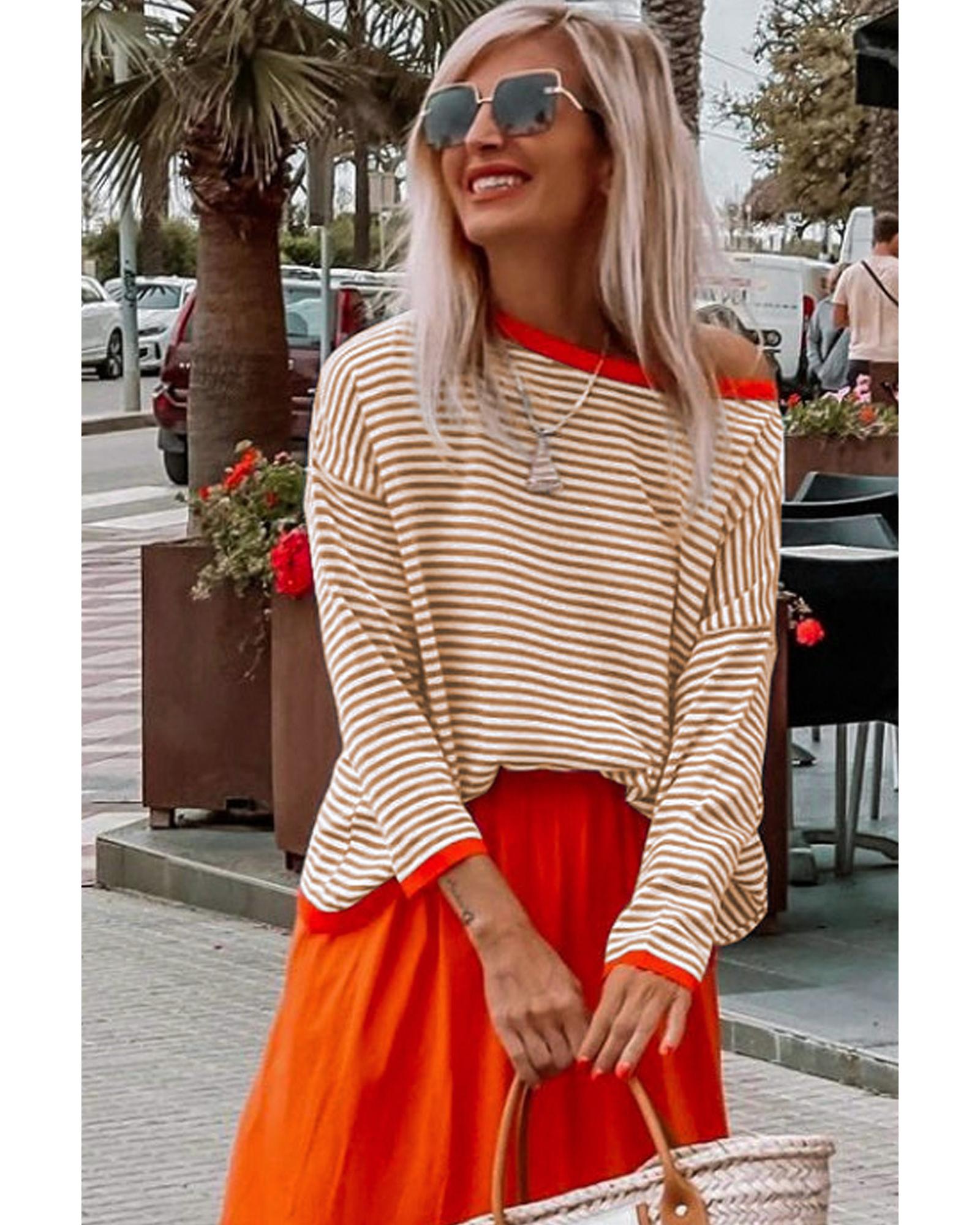 Brown Contrast Trimmed Striped Drop Shoulder Sweater – L